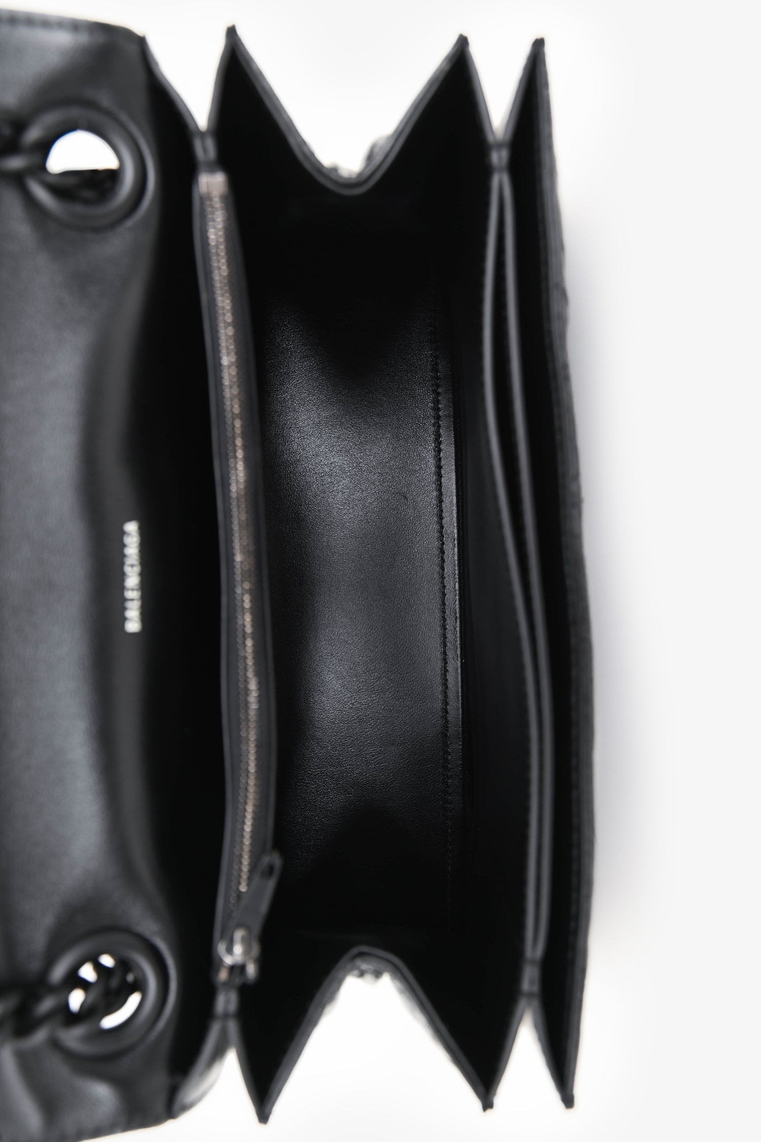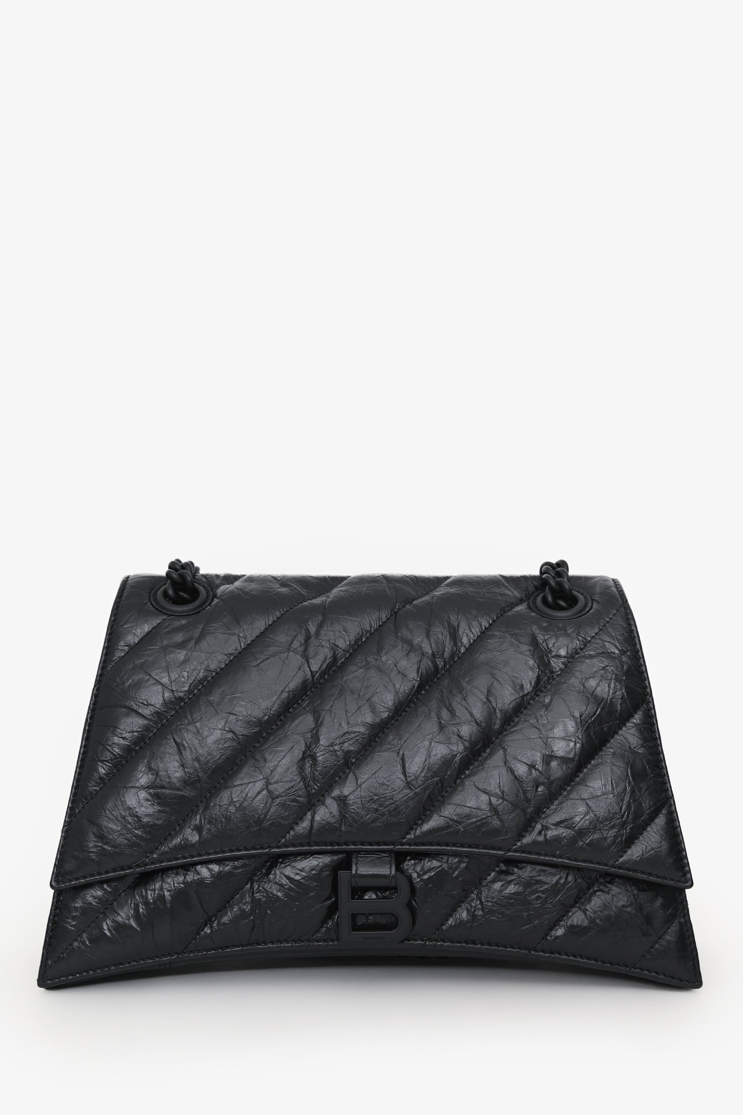 Balenciaga Black Crackled Leather Medium Crush Shoulder Chain Bag. Front fold-over flap with magnetic button closure. Slide-around chain strap. 4 main compartments; 3 open, 1 with zip closure. Tonal hardware. Tonal stitching.