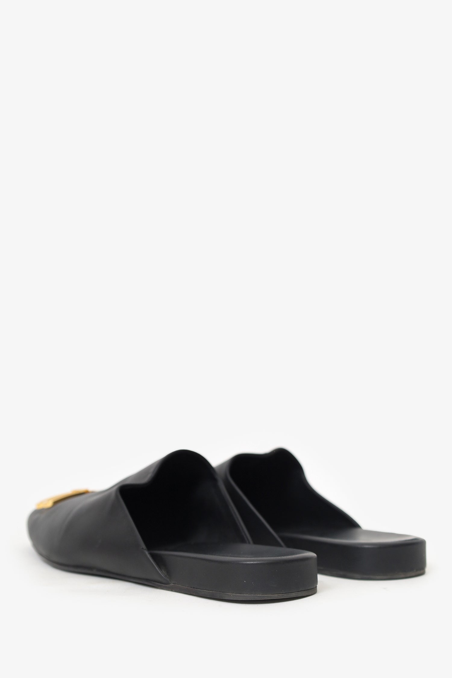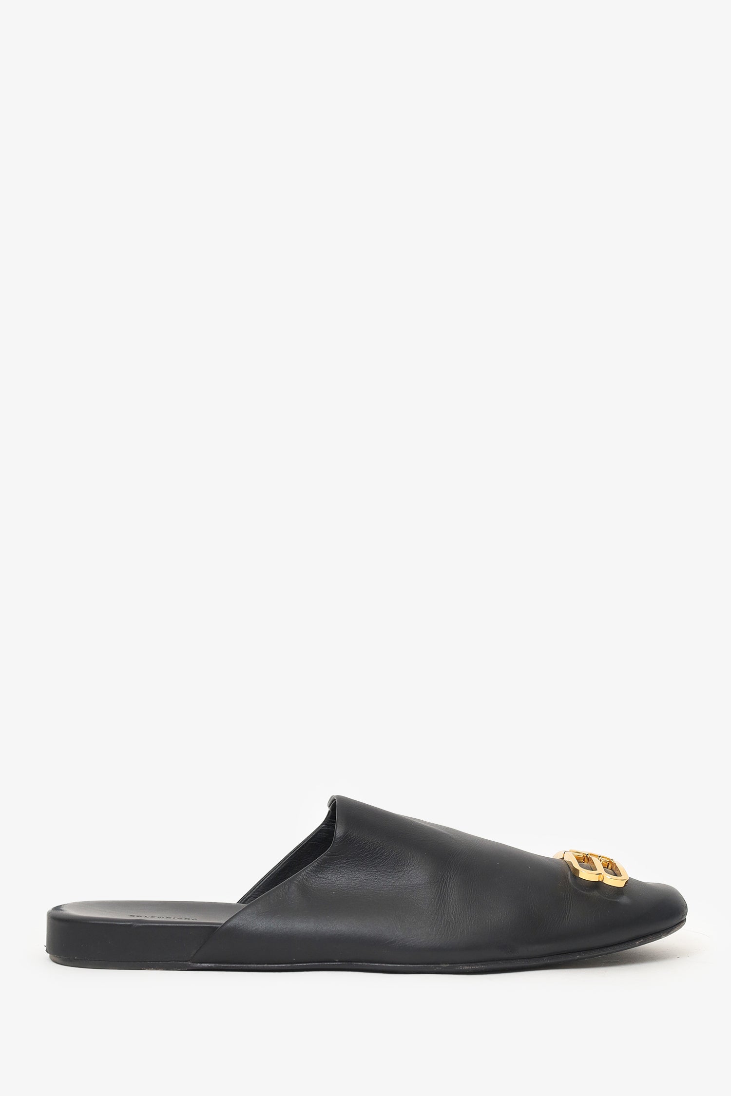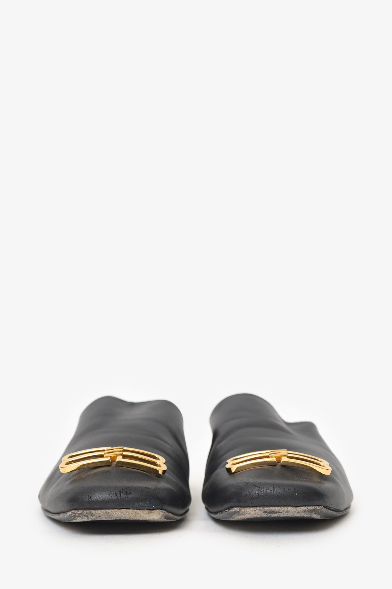 Balenciaga Black Leather 'BB' Slides. Slip-on. Squared-toe. Gold-tone hardware. Tonal stitching.