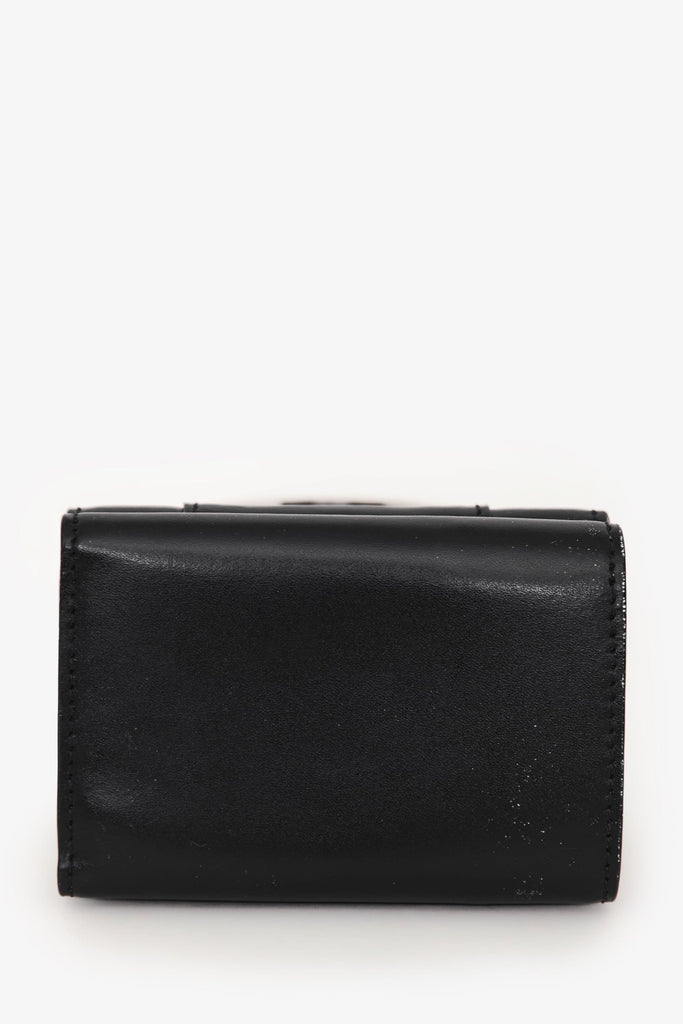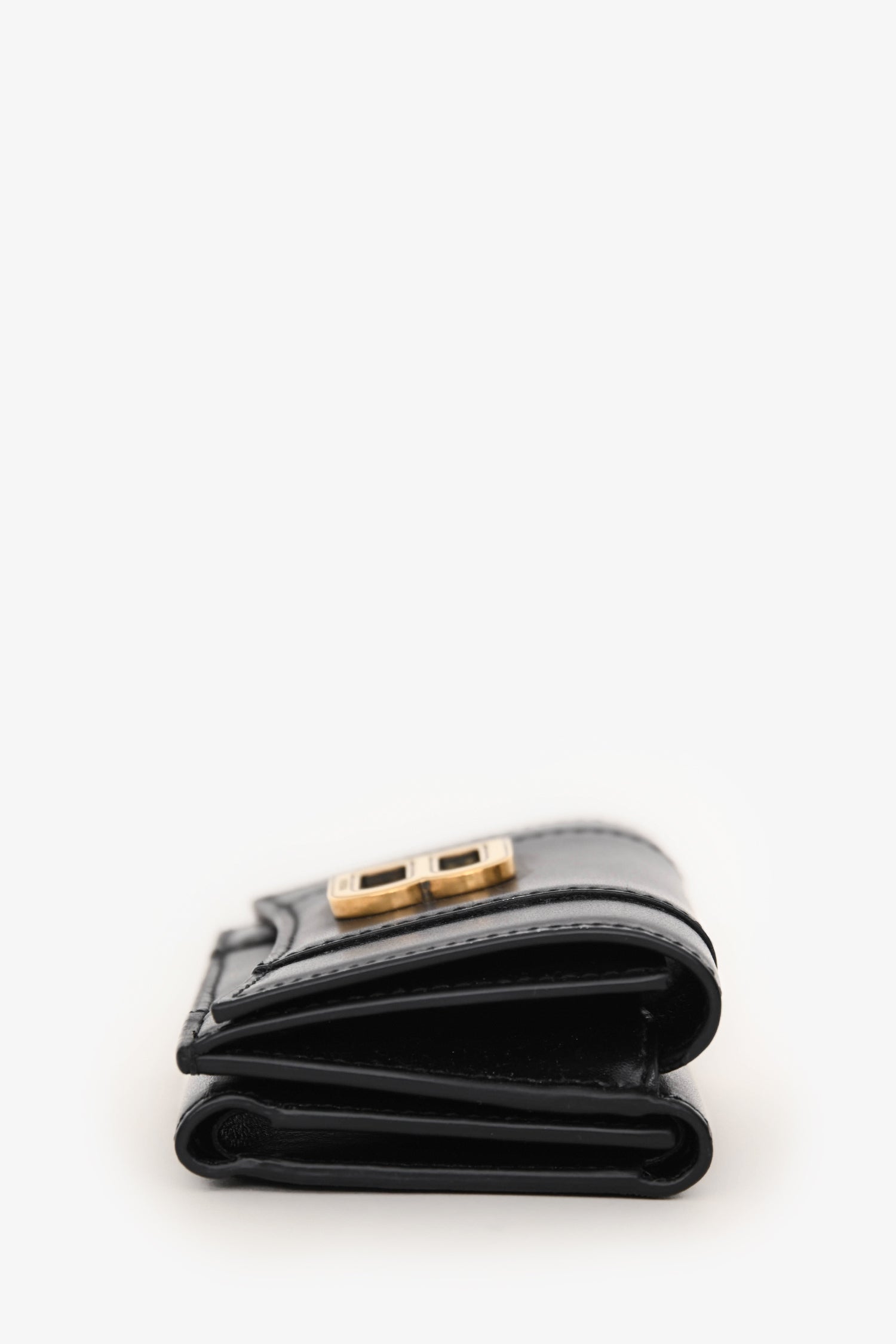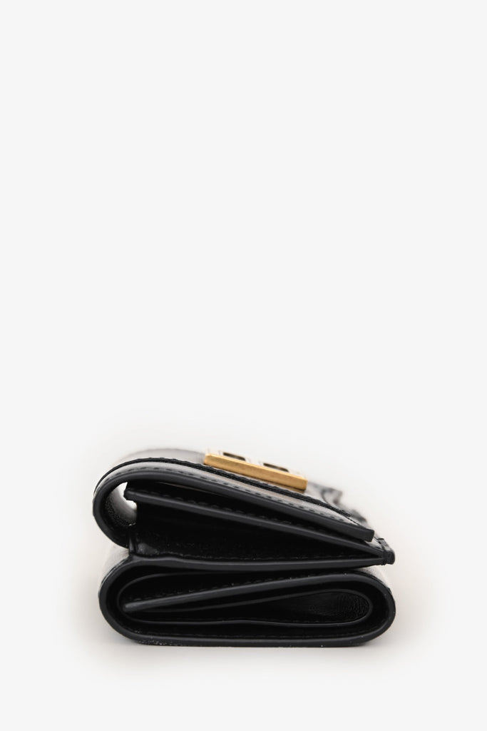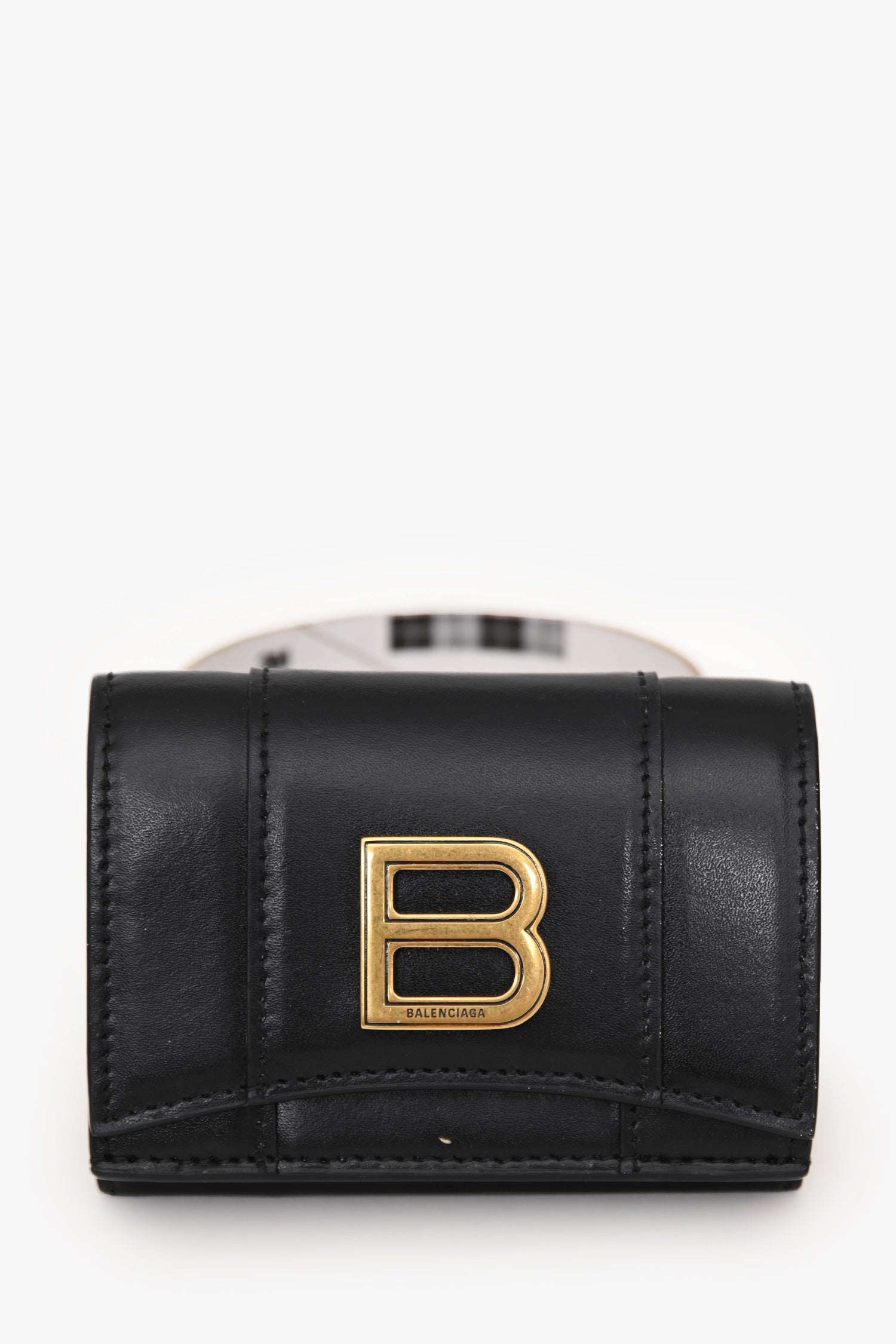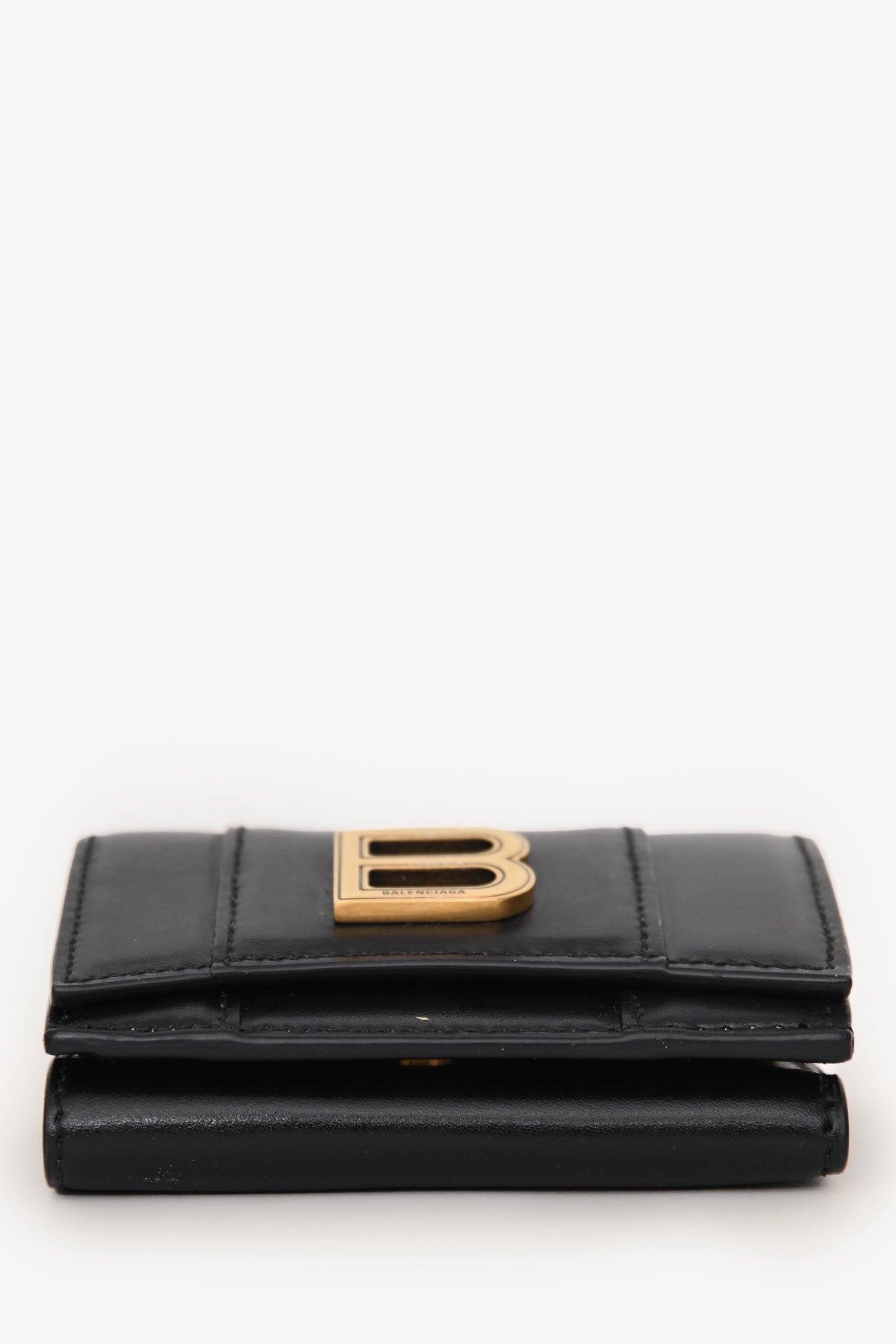 Balenciaga Black Leather Hourglass Trifold Wallet. Snap closure. 1 bill compartment, 3 card slots, and 1 coin pouch. Gold-tone hardware. Tonal stitching.