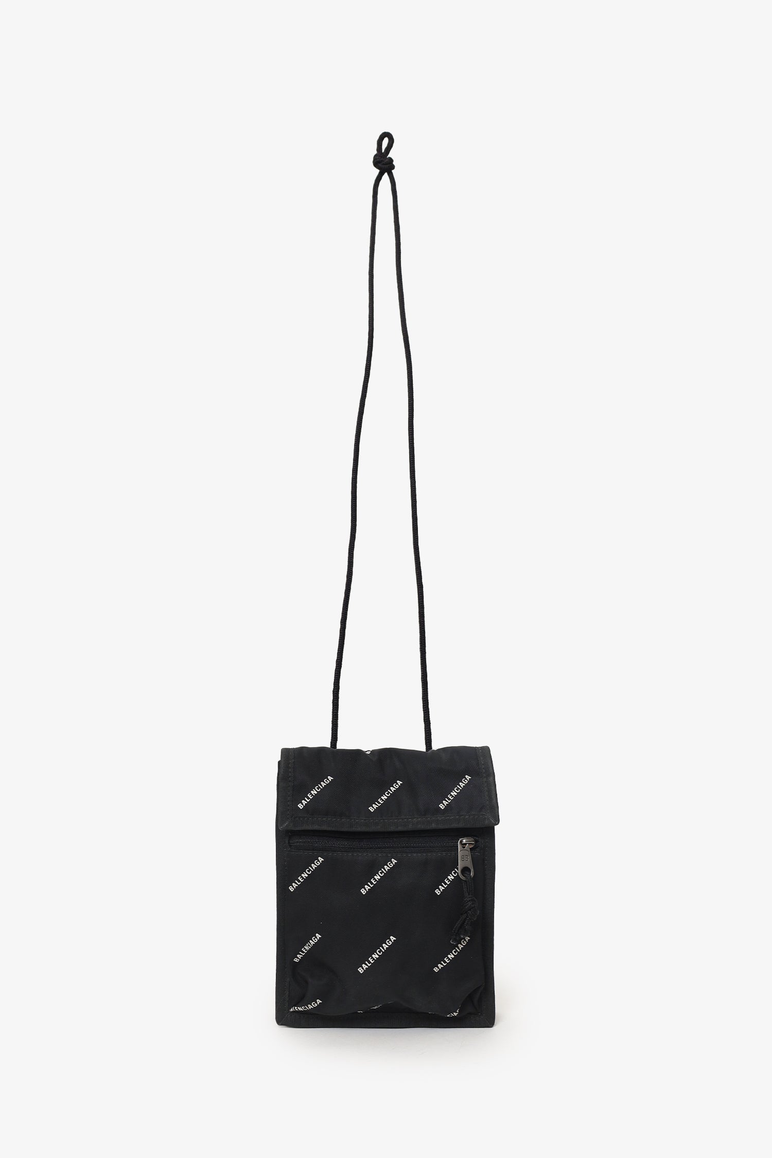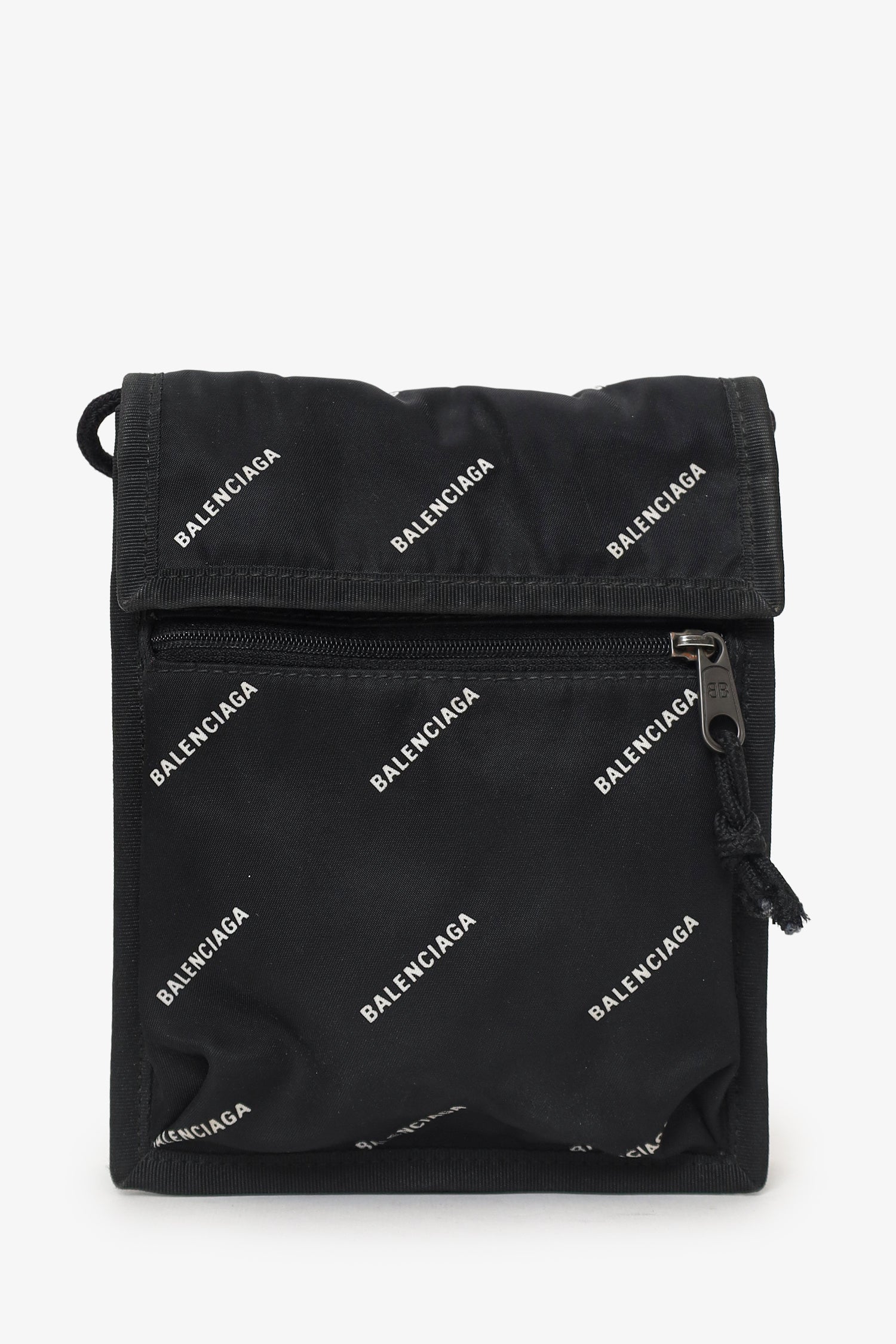 Balenciaga Black Nylon All Over Logo Small Explorer Pouch. Front-fold-over-flap with velcro closure. Crossbody strap. Front zip-up pocket. Fabric-lined interior. Gunmetal-tone hardware. Tonal stitching.