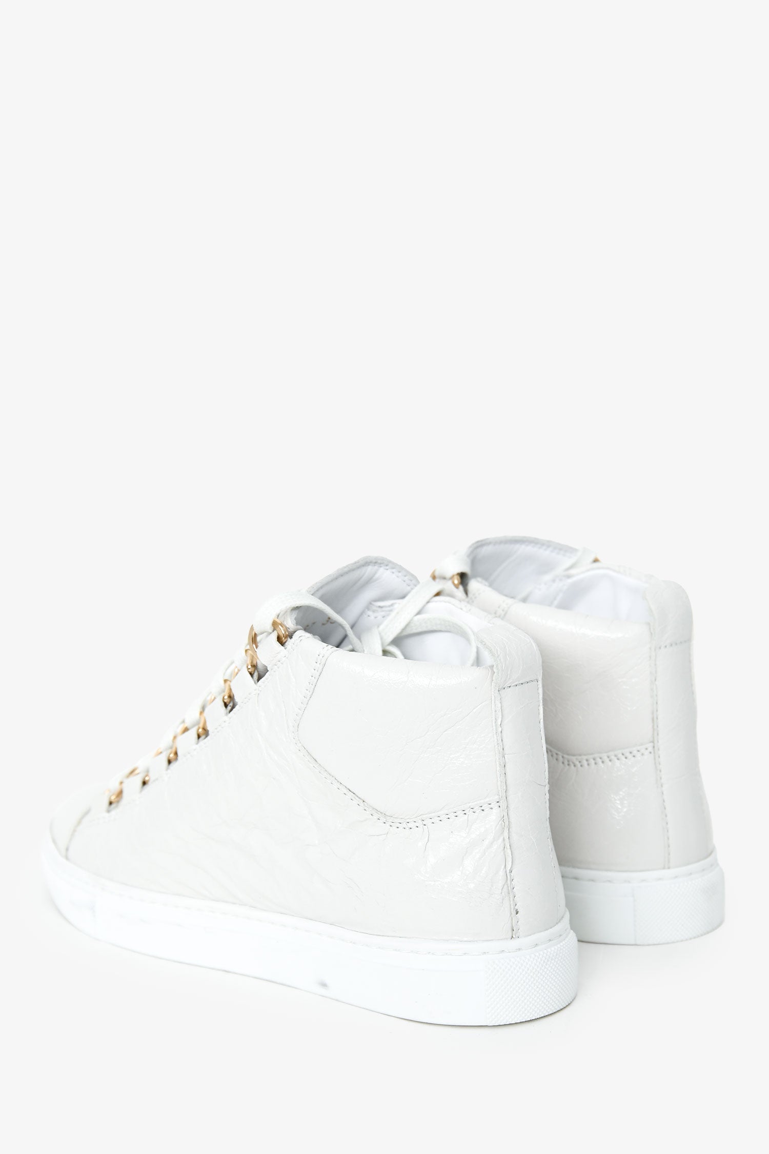 Balenciaga White Leather High Top Sneakers. Lace-up detail. Leather insole. Gold-tone hardware. Tonal stitching.