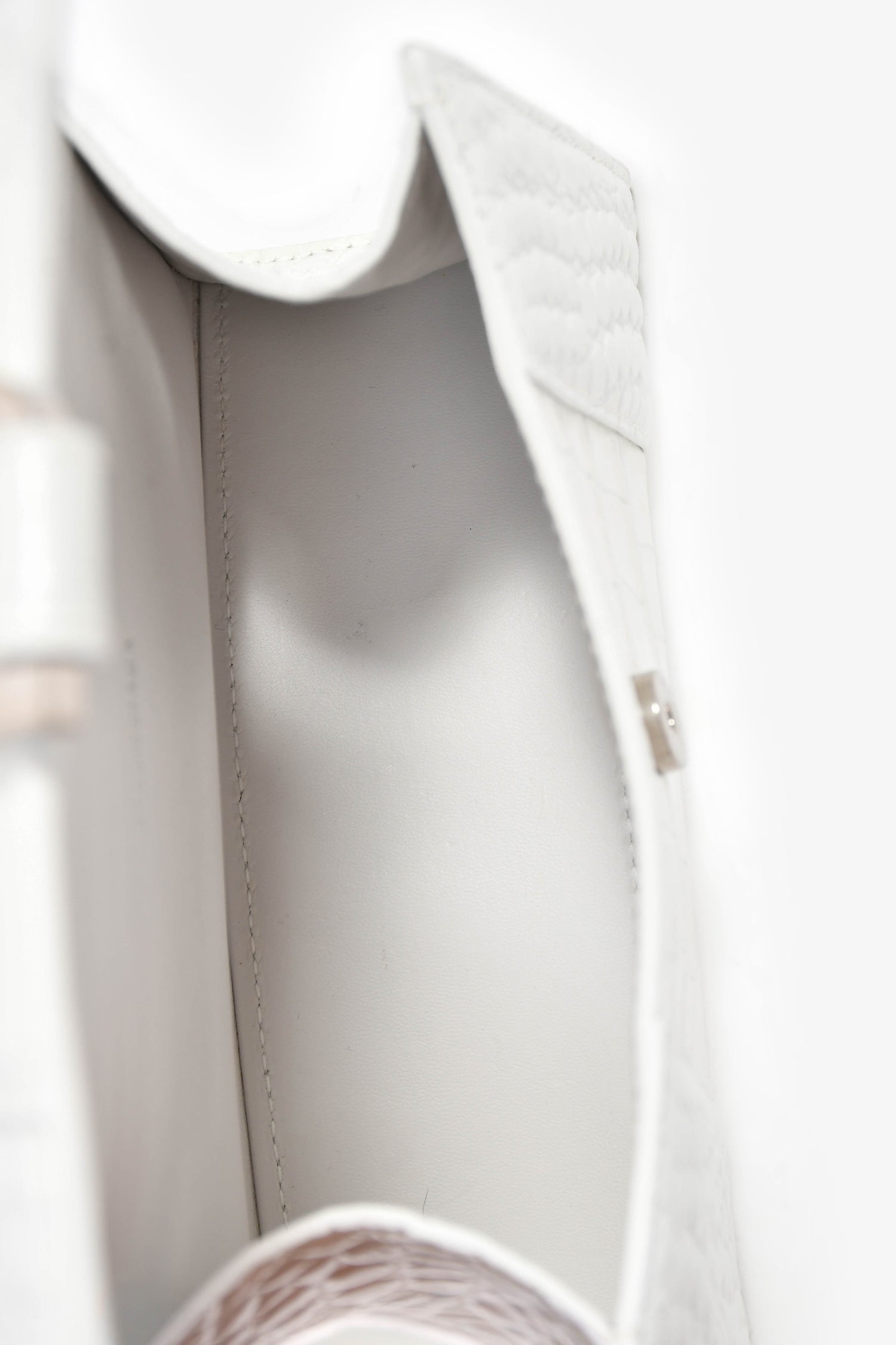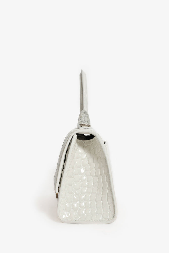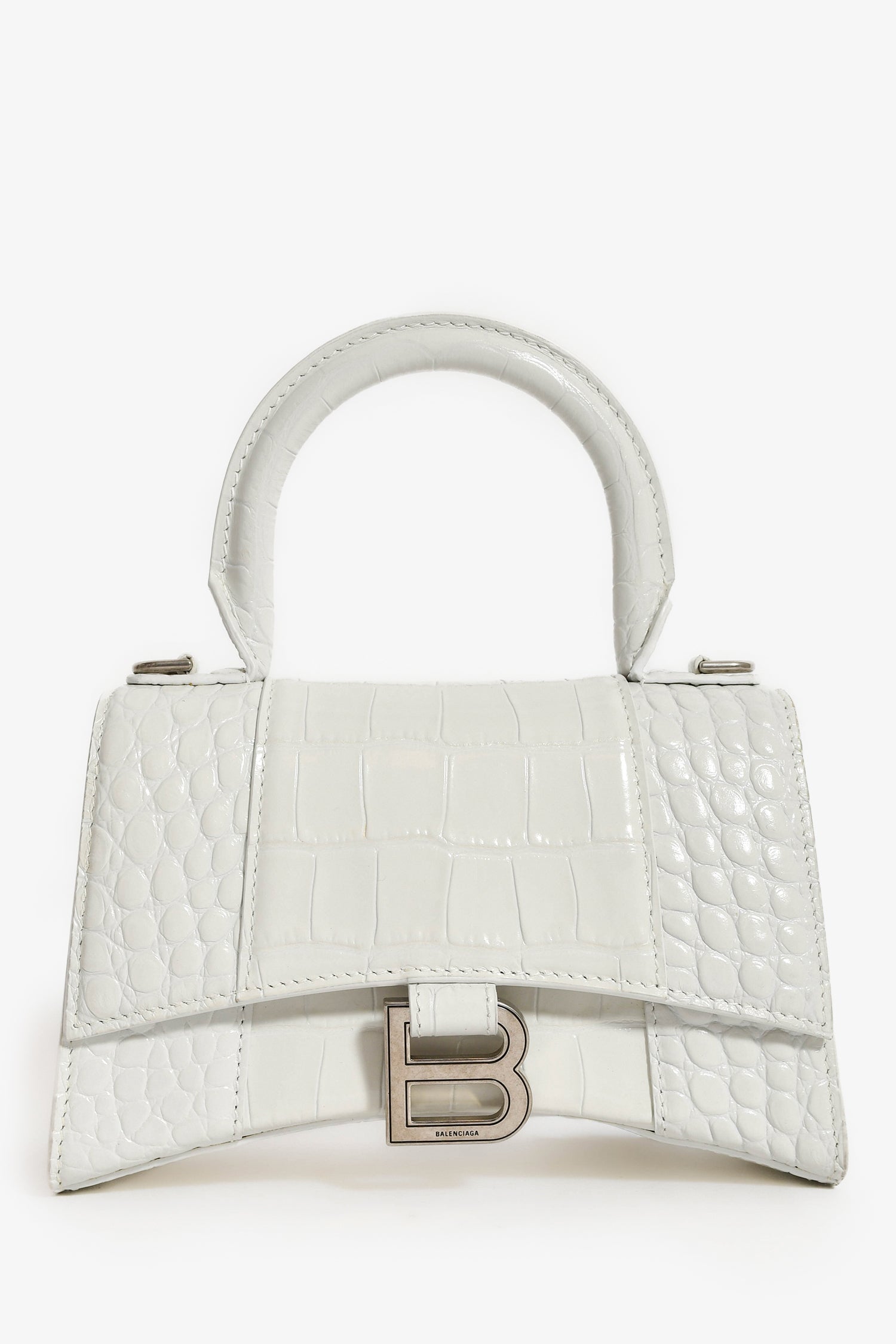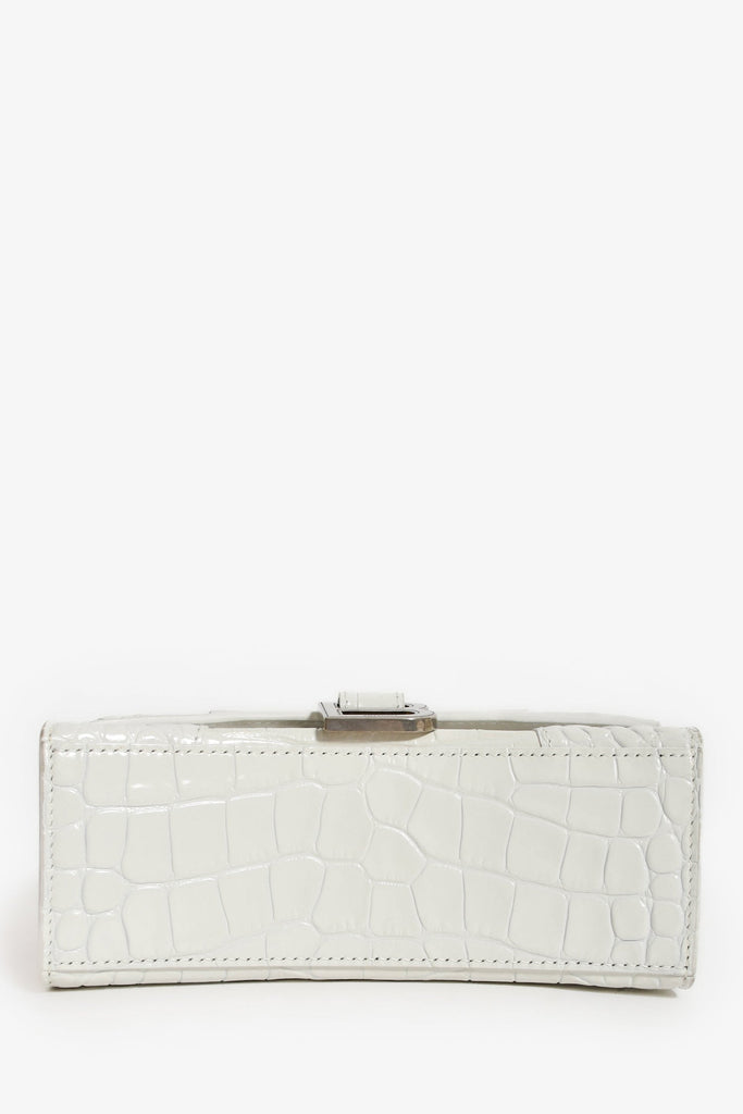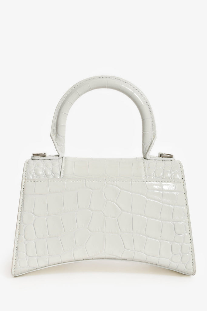 Balenciaga White Leather XS Hourglass Bag. Single top handle. Front fold-over flap with a snap closure. Exterior rear slip compartment. Removable crossbody strap. Lined leather interior. Silver-tone hardware. Tonal stitching.