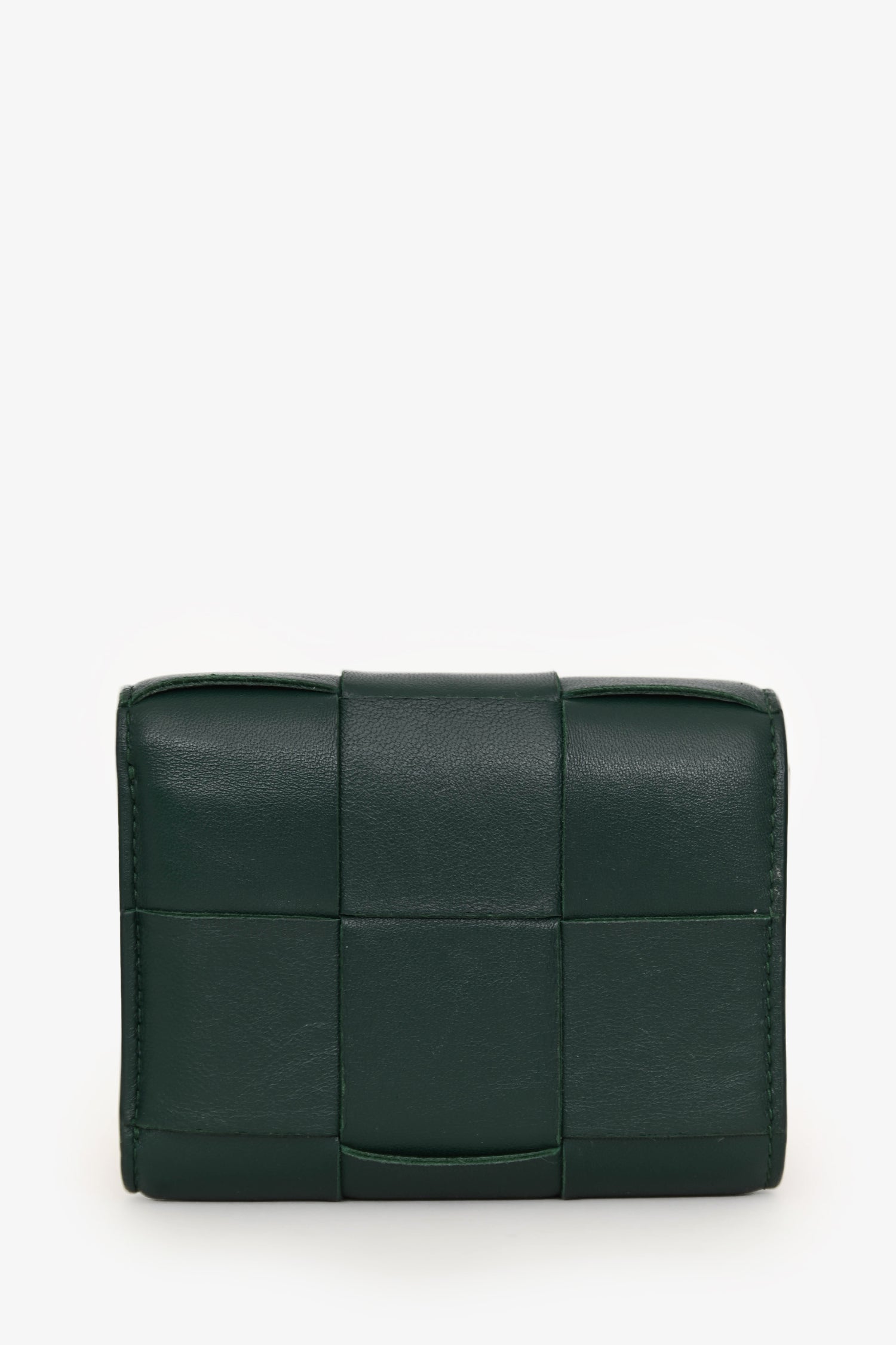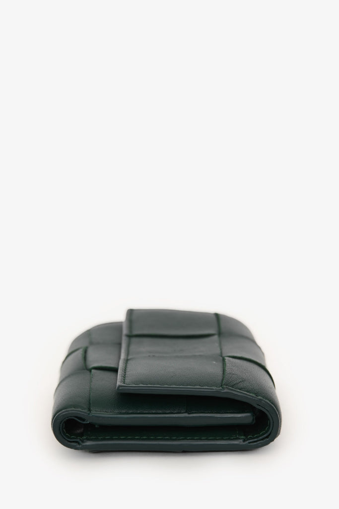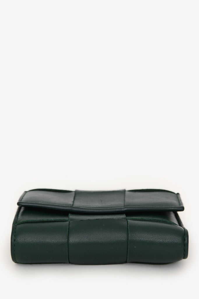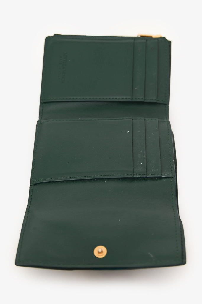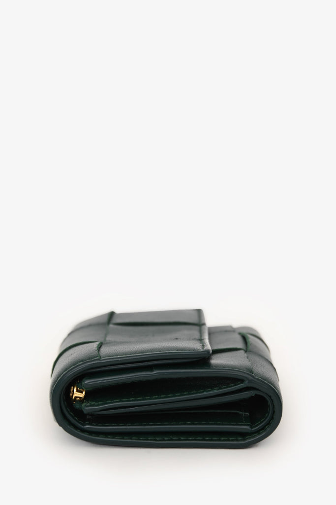 Bottega Veneta Dark Green Leather Cassette Trifold Wallet. Fold closure. 1 bill compartment, 8 card slots, and 1 coin pouch. Gold-tone hardware. Tonal stitching.