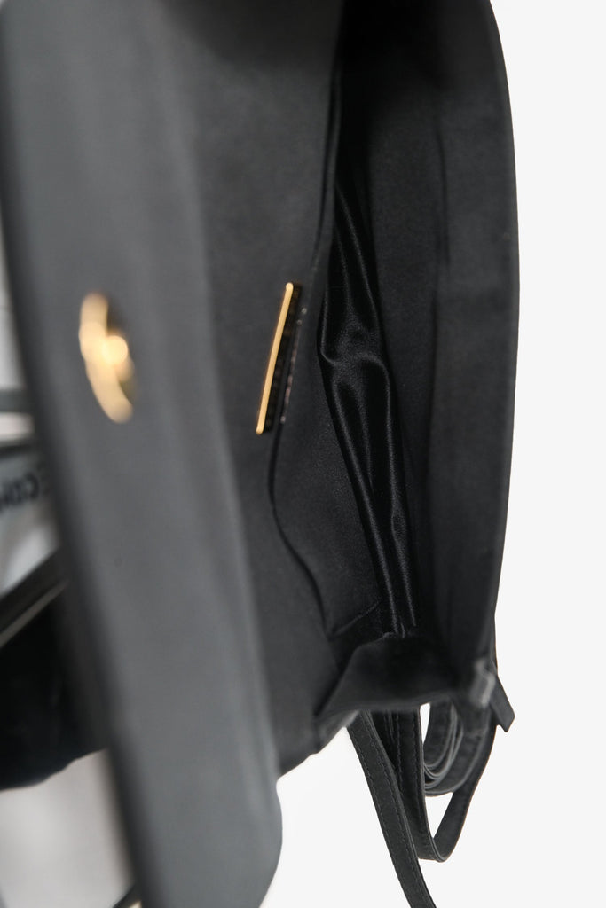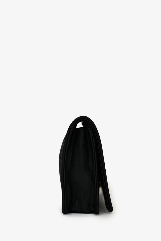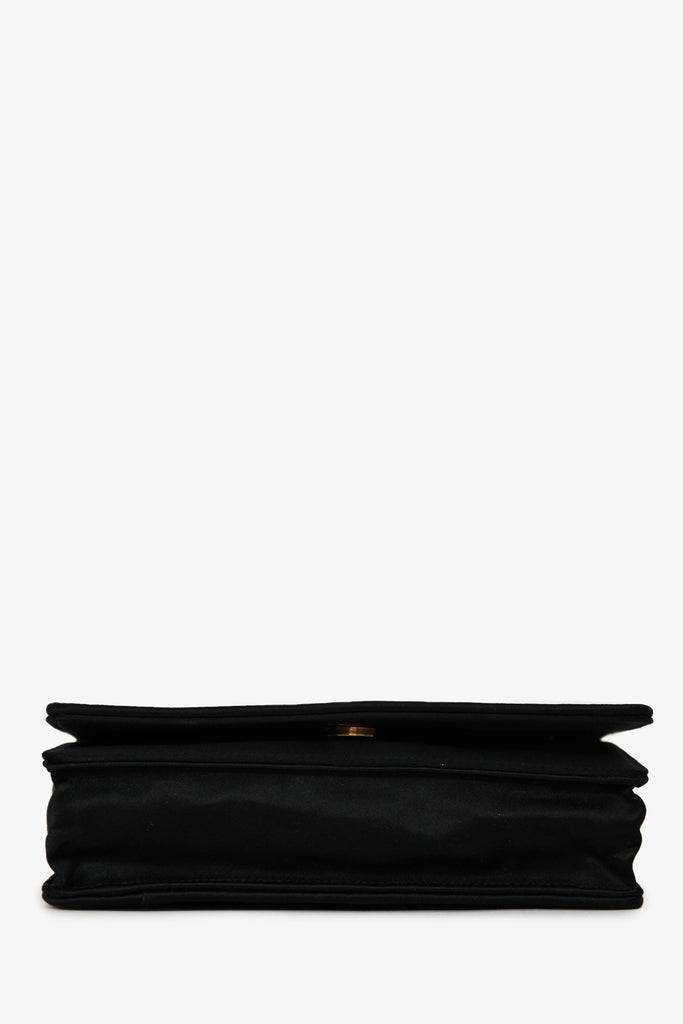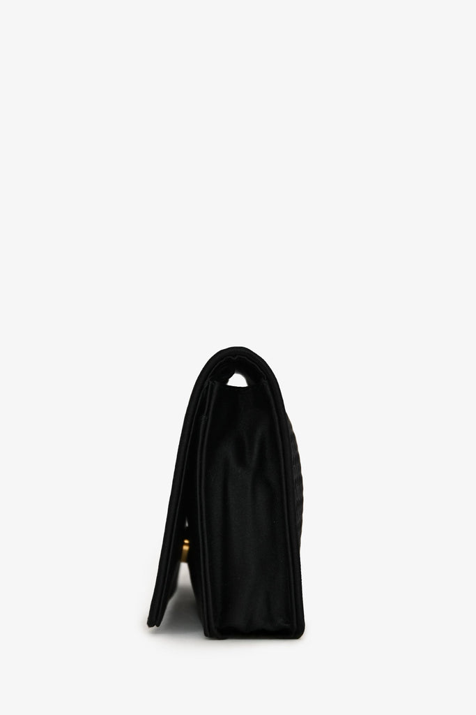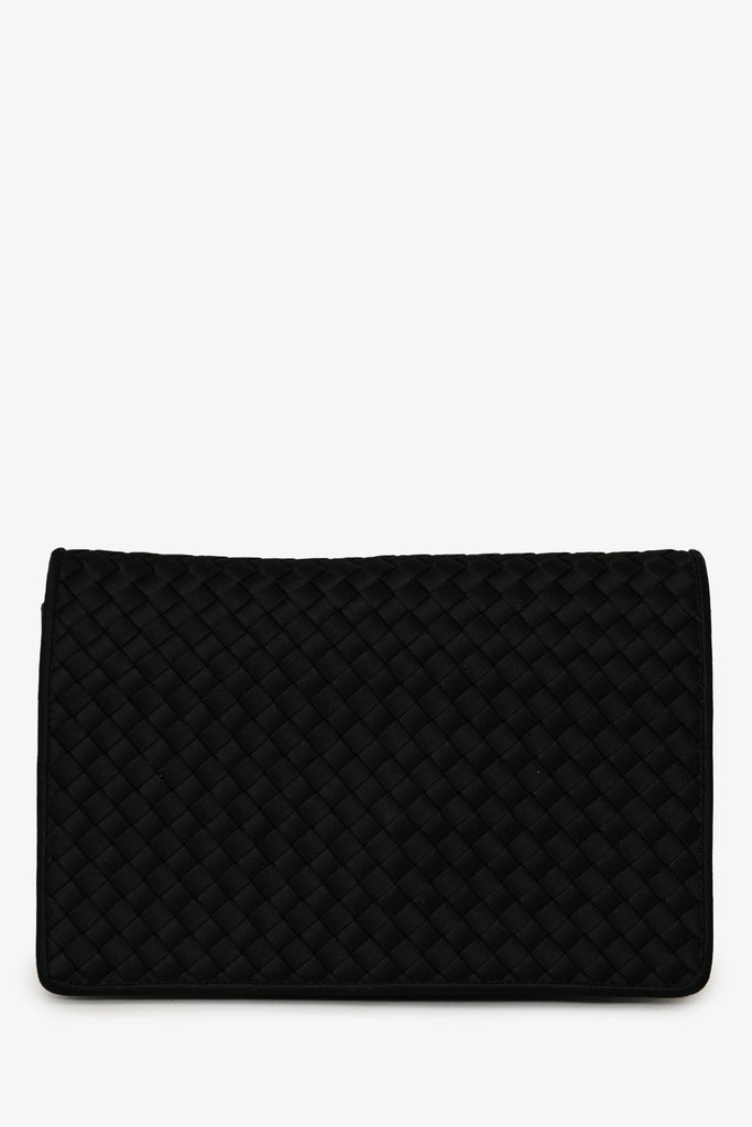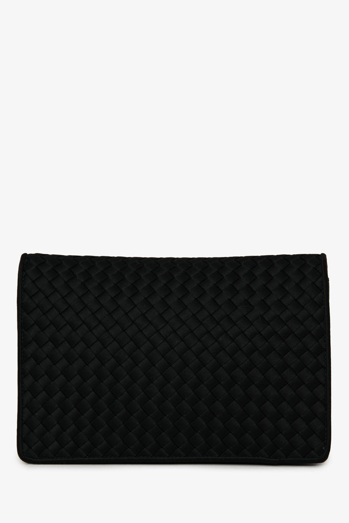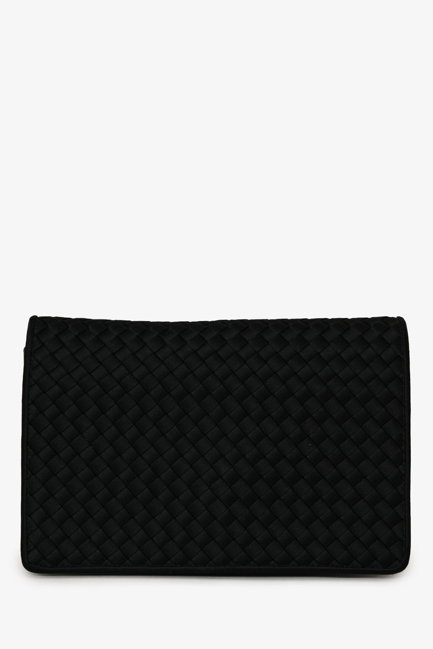 Bottega Veneta Vintage Black Satin Intrecciato Clutch with Strap. Front fold-over flap with magnetic button closure. Open interior. Single interior wall slip pocket. Tonal stitching.