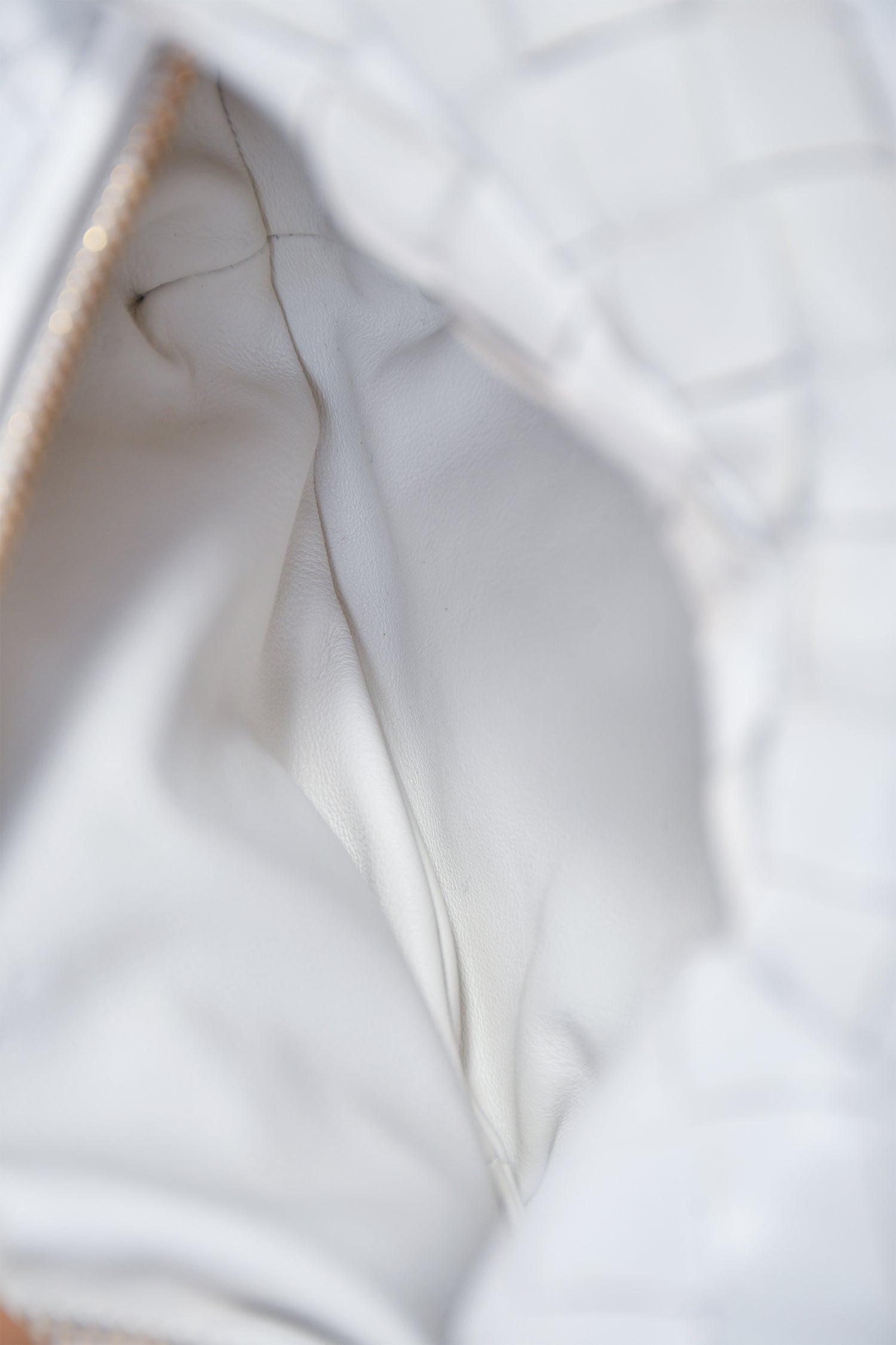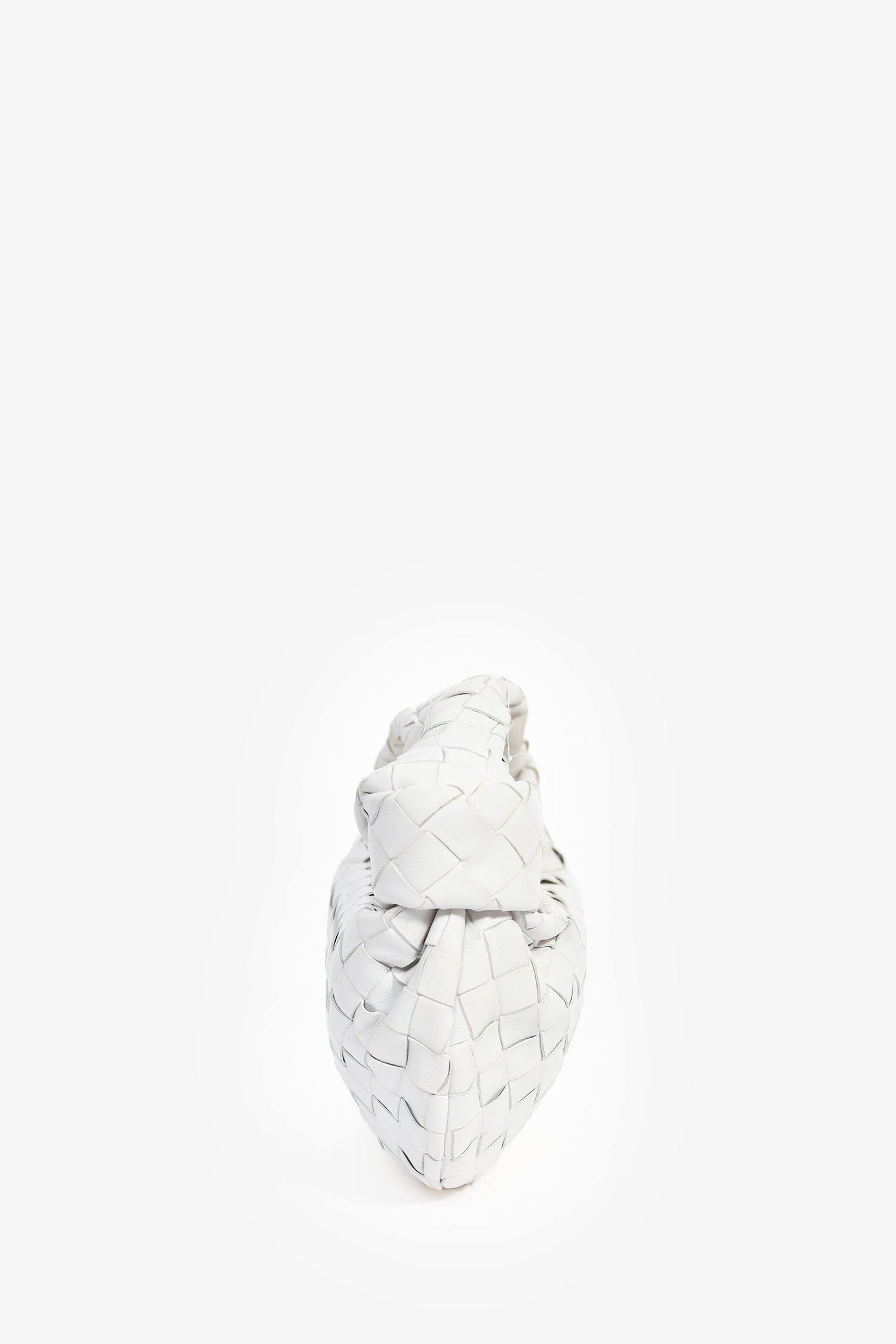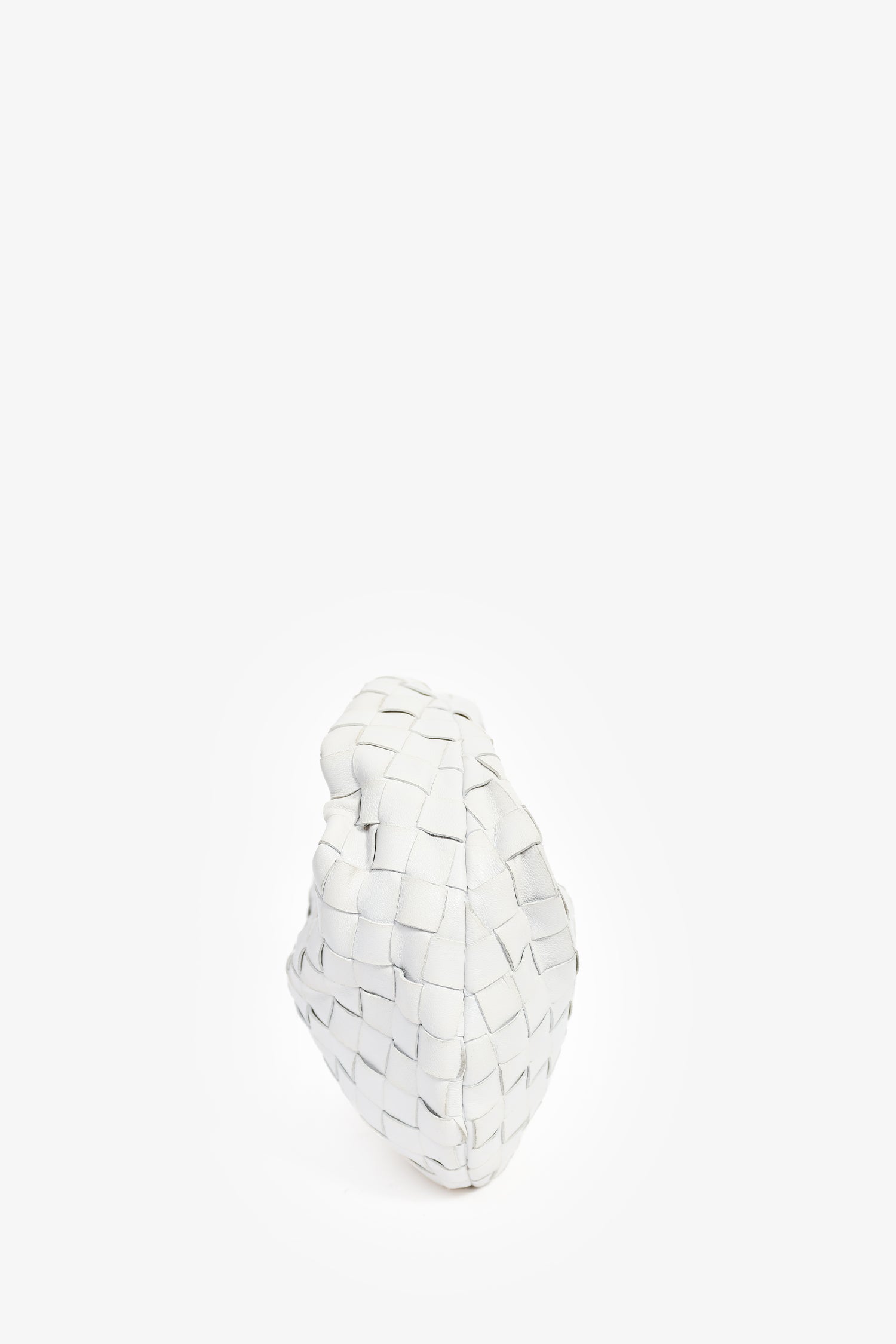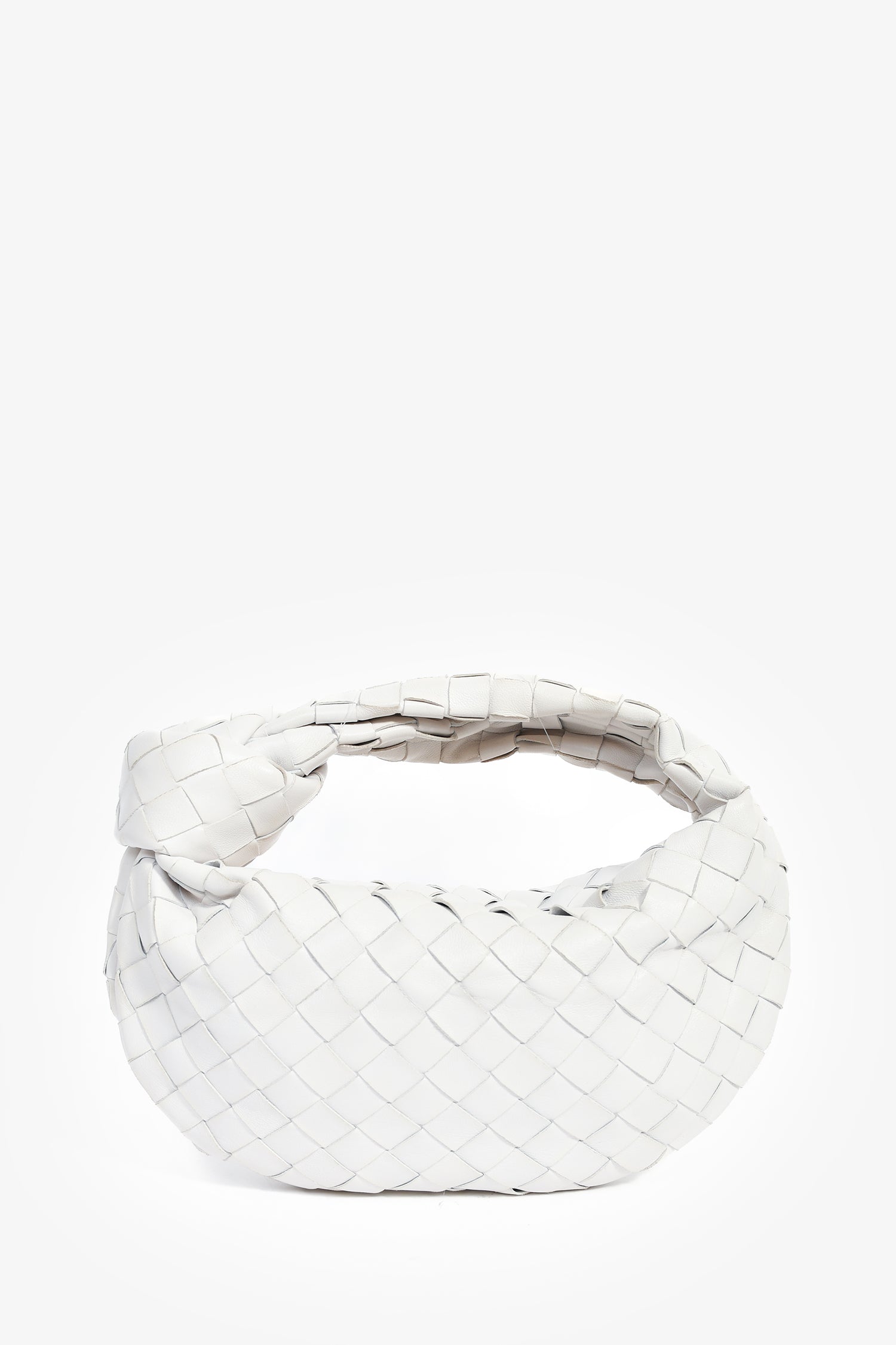 Bottega Veneta White Intrecciato Mini Jodie Bag. Top zip closure. Open leather lined interior. Gold-tone hardware. Tonal stitching.