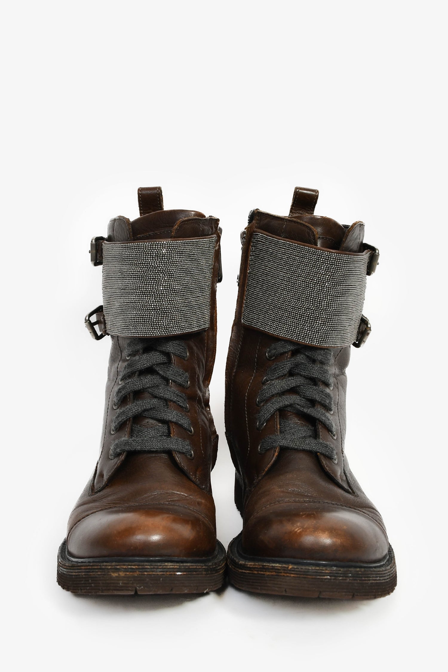Brunello Cucinelli Brown Leather Beaded Ankle Boots. Slip-on. Round toe. Side zip closure. Front lace-up. Leather-lined interior. Rubber soles. Tonal stitching.