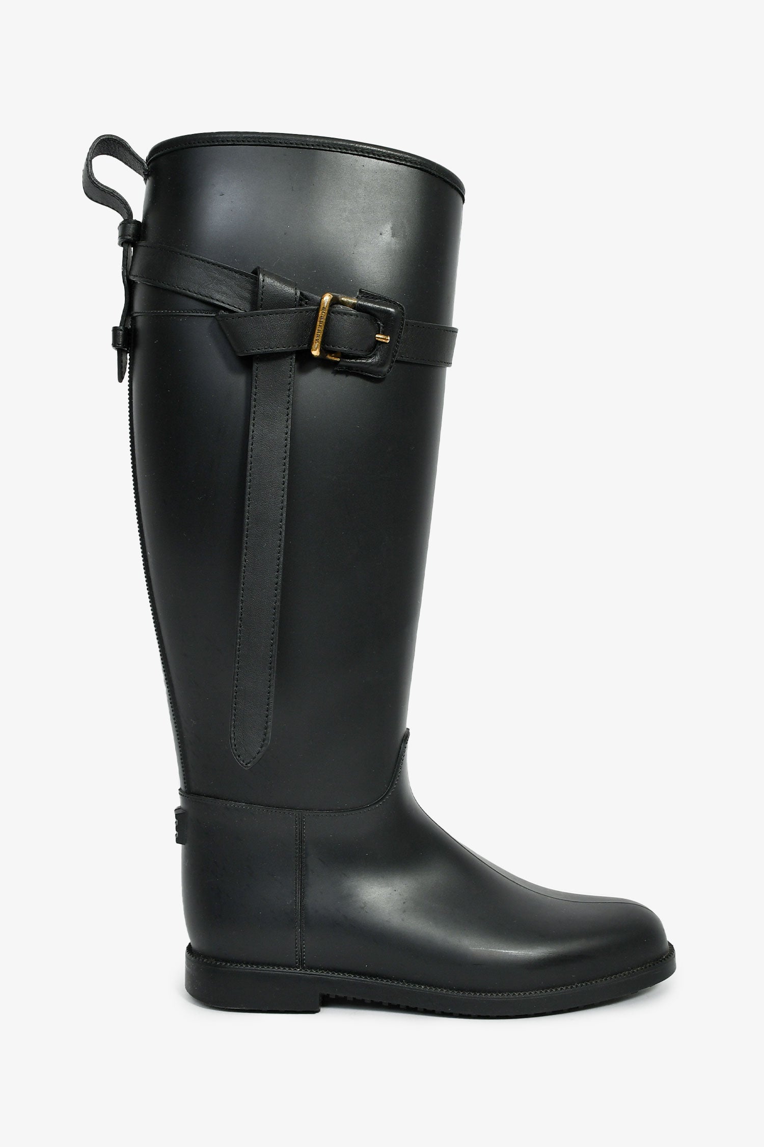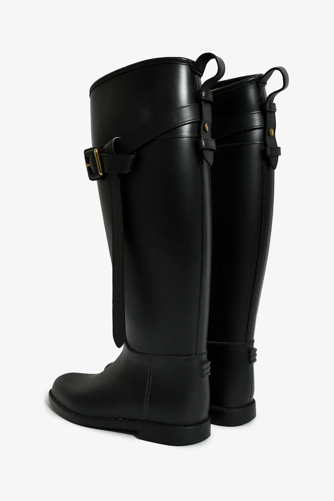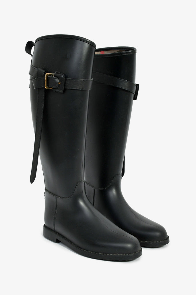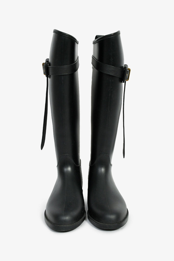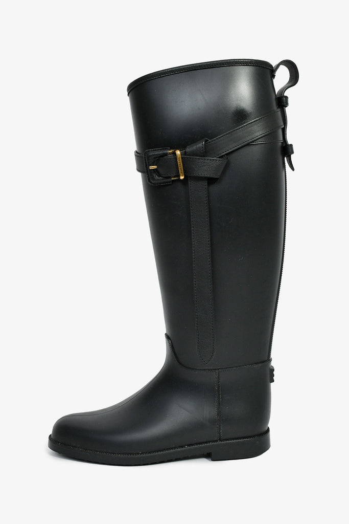 Burberry Black Trim Rubber Rain Boots. Pull-on. Almond toe. Textile-lined interior. Gold-tone hardware. Tonal stitching.