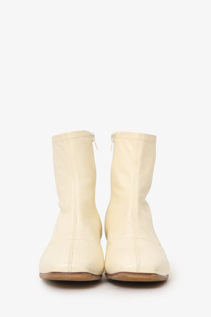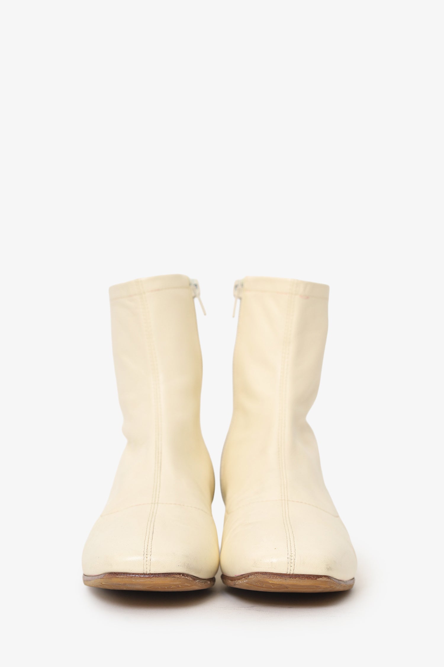 By Far Cream Low Heel Booties. Pull-on. Square toe. Interior side zip closure. Block heel. Tonal stitching.
