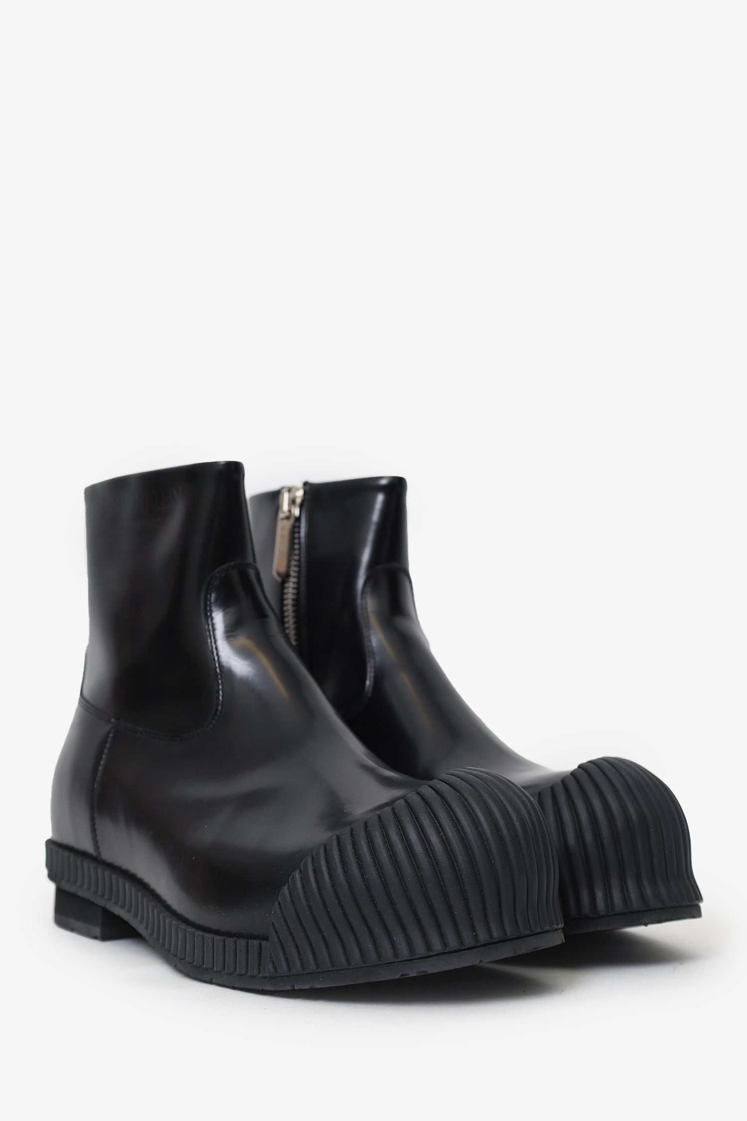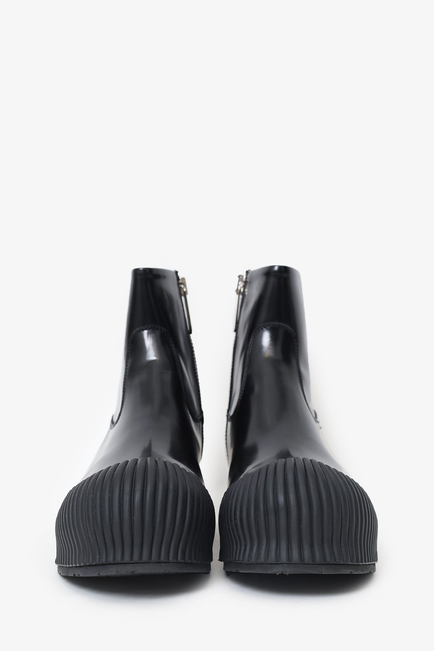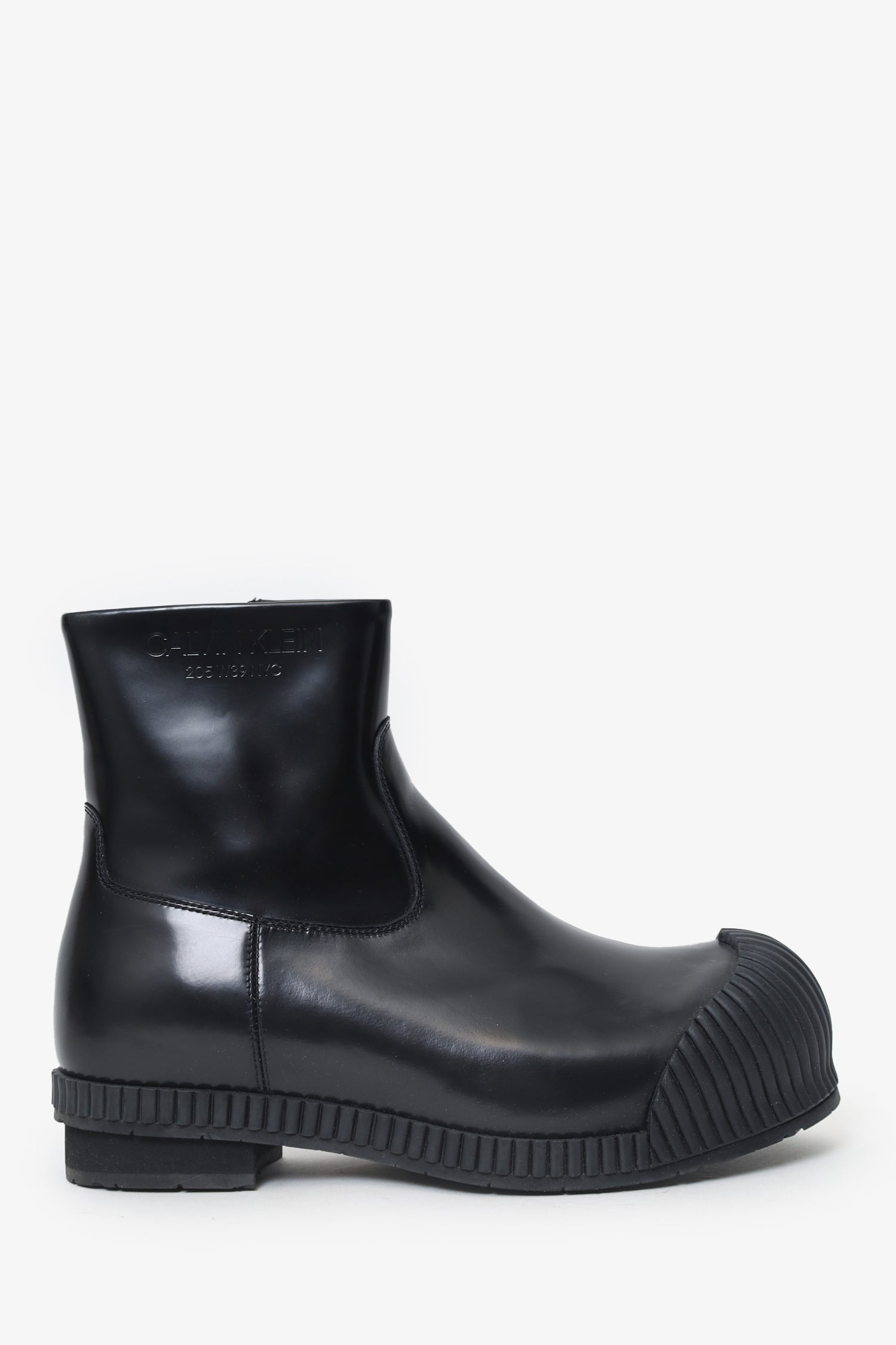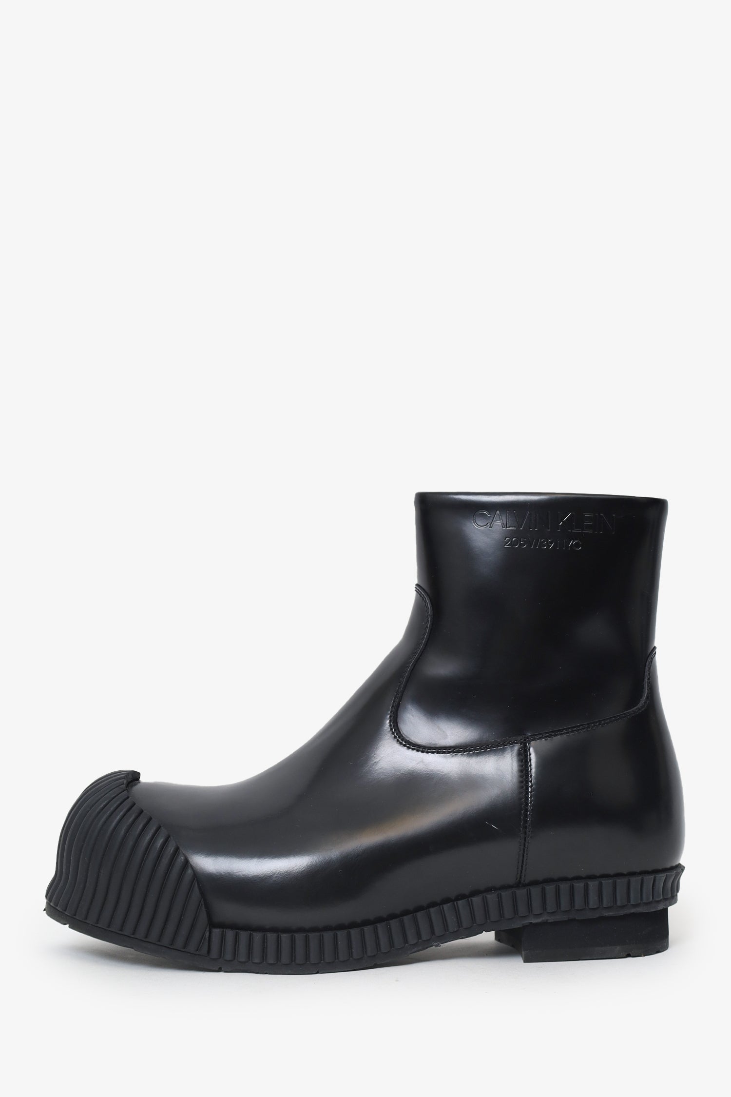 Calvin Klein 205W39NYC Black Patent Deicine Boots. Pull-on. Round toe. Interior size zip-up closure. Silver-tone hardware. Tonal stitching.