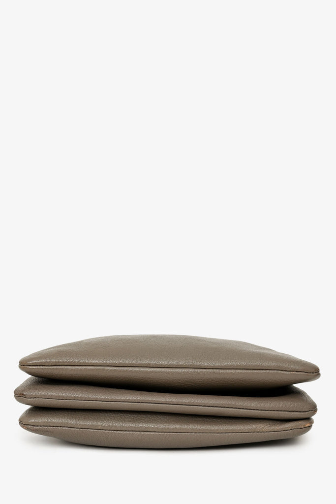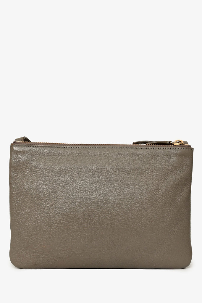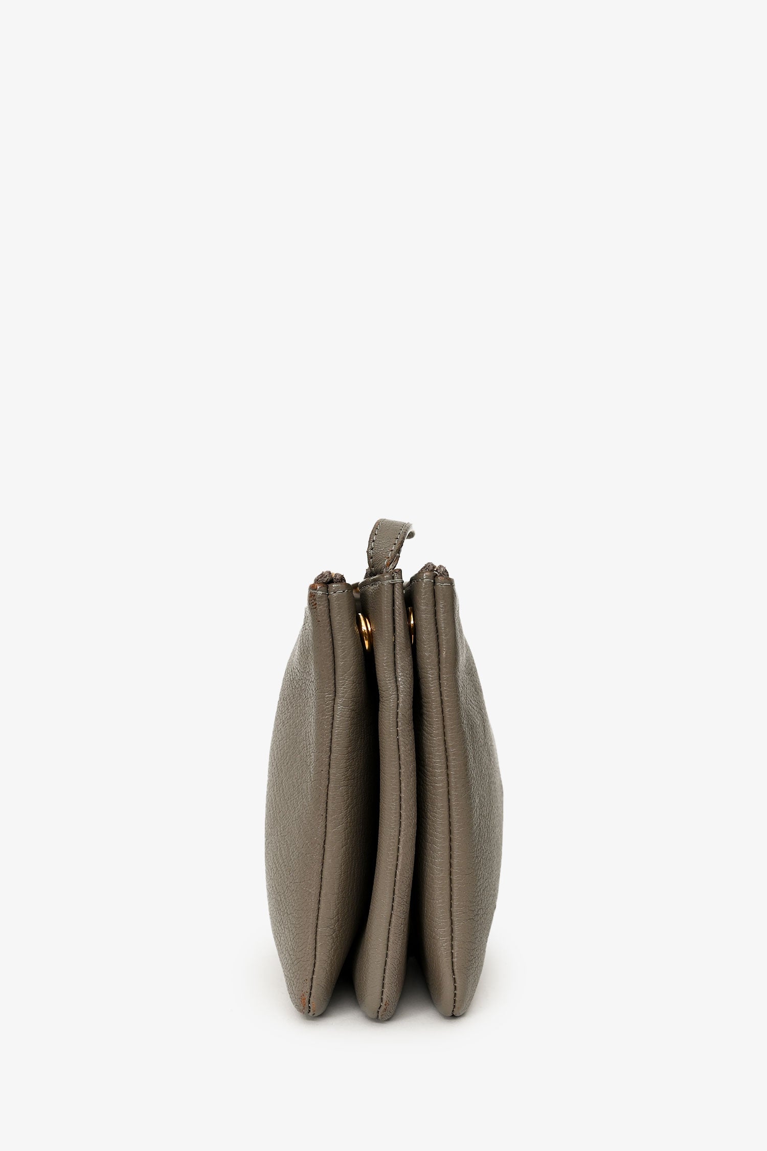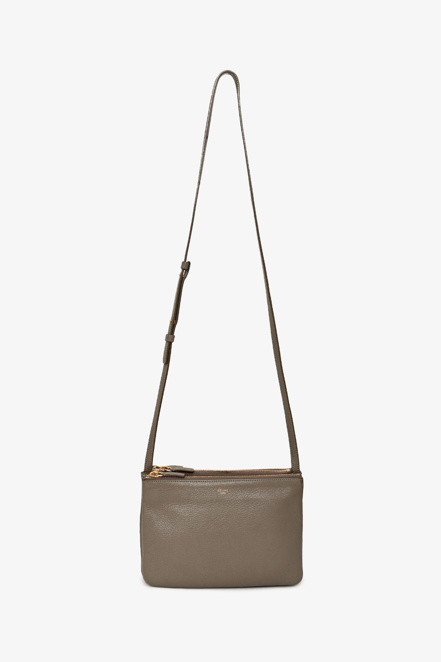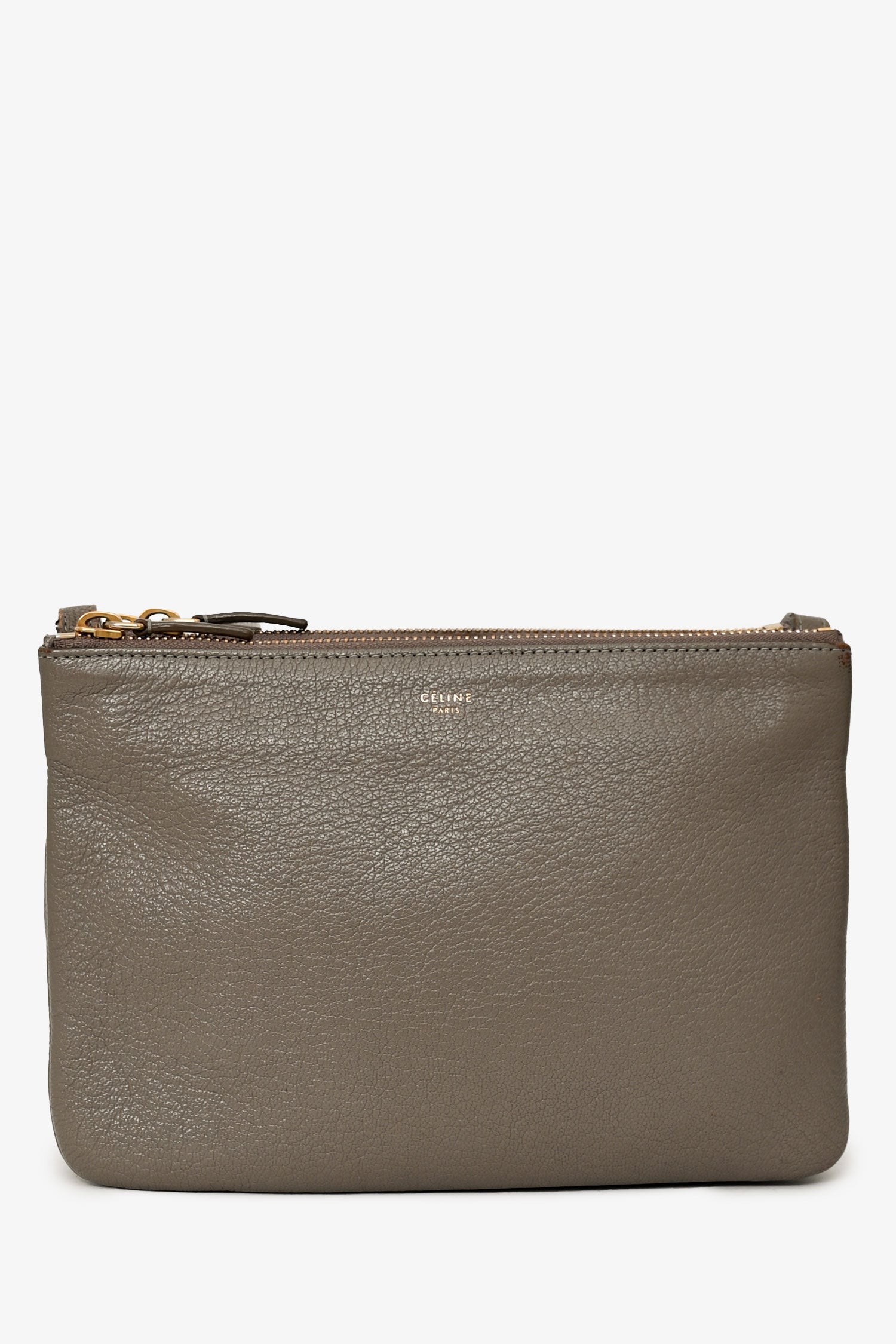 Celine 2015 Taupe Leather Trio Crossbody Bag. Top zip closures. Adjustable strap. Suede-lined interior. Gold-tone hardware. Tonal stitching.