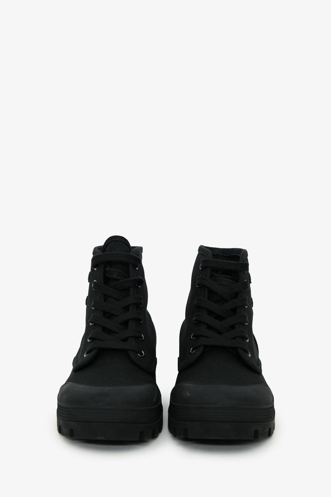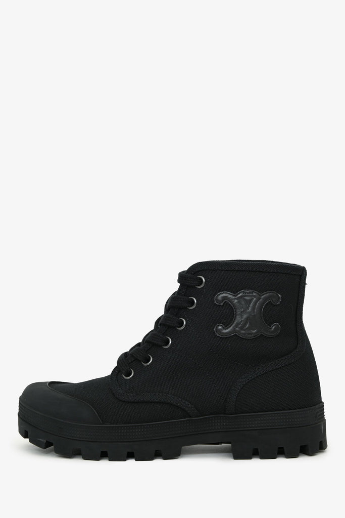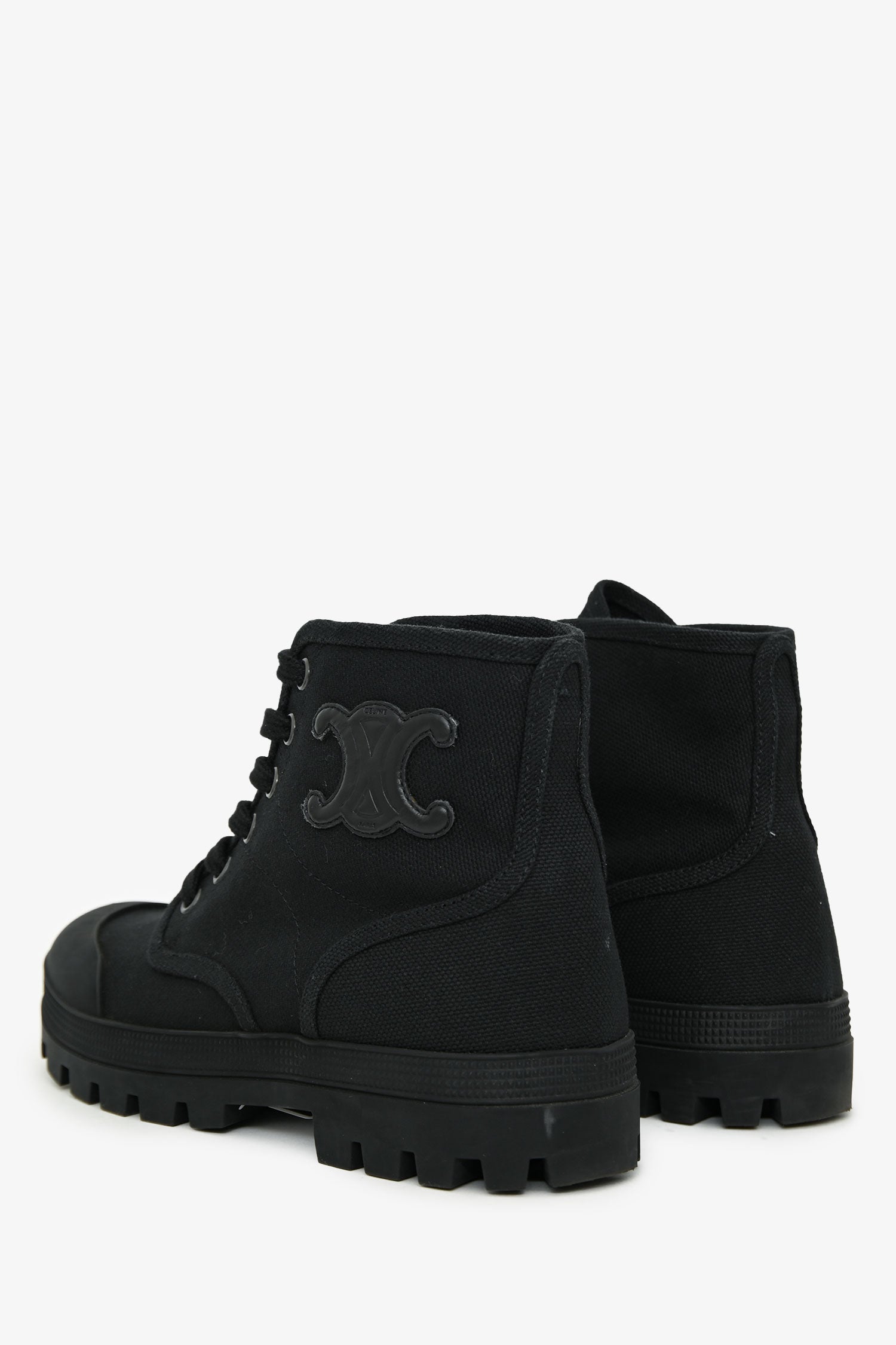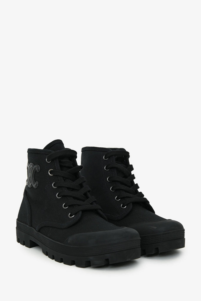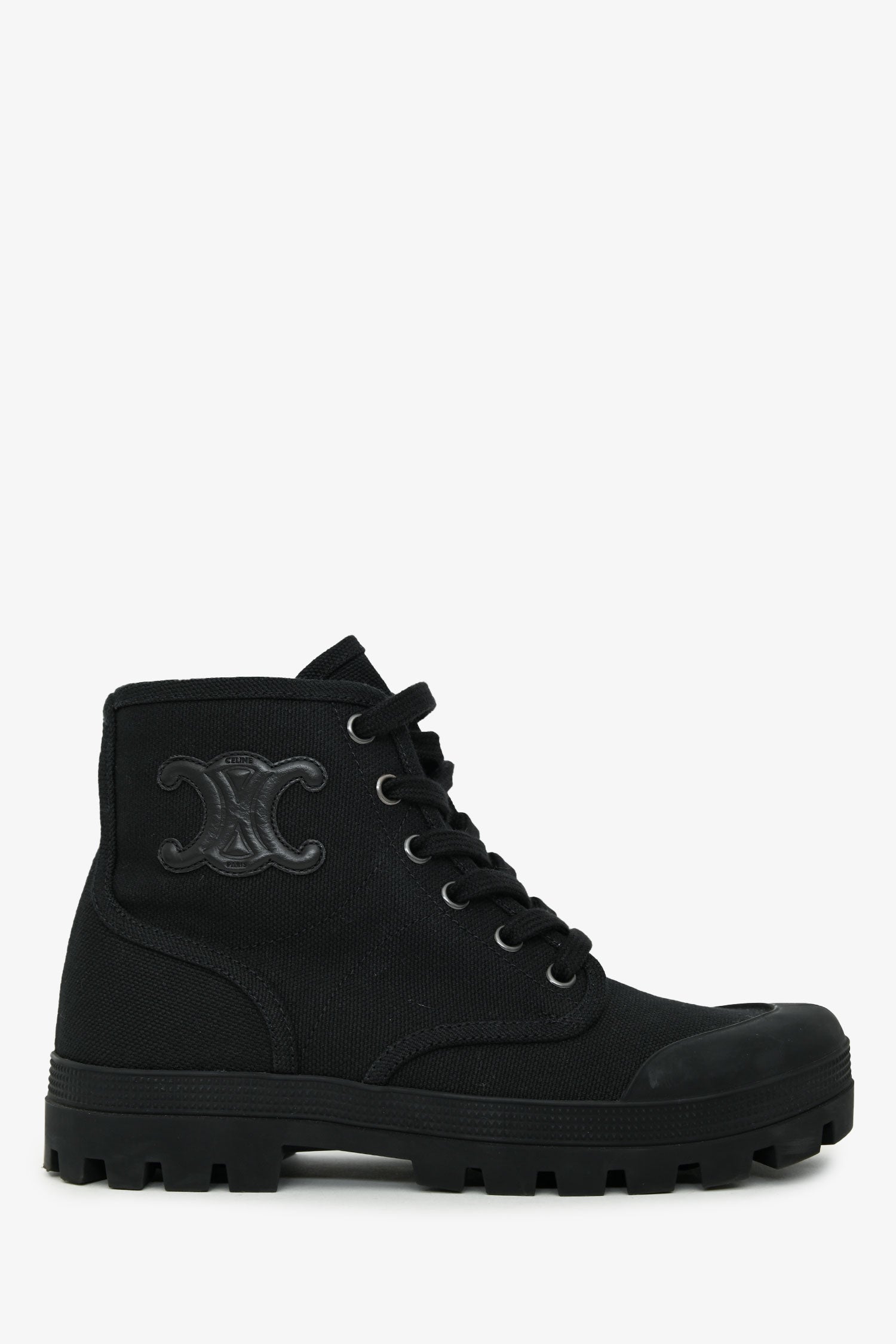 Celine Black Canvas Triomphe High Top Sneakers. Slip-on. Round toe. Lace-up closure. Rubber soles. Tonal stitching.