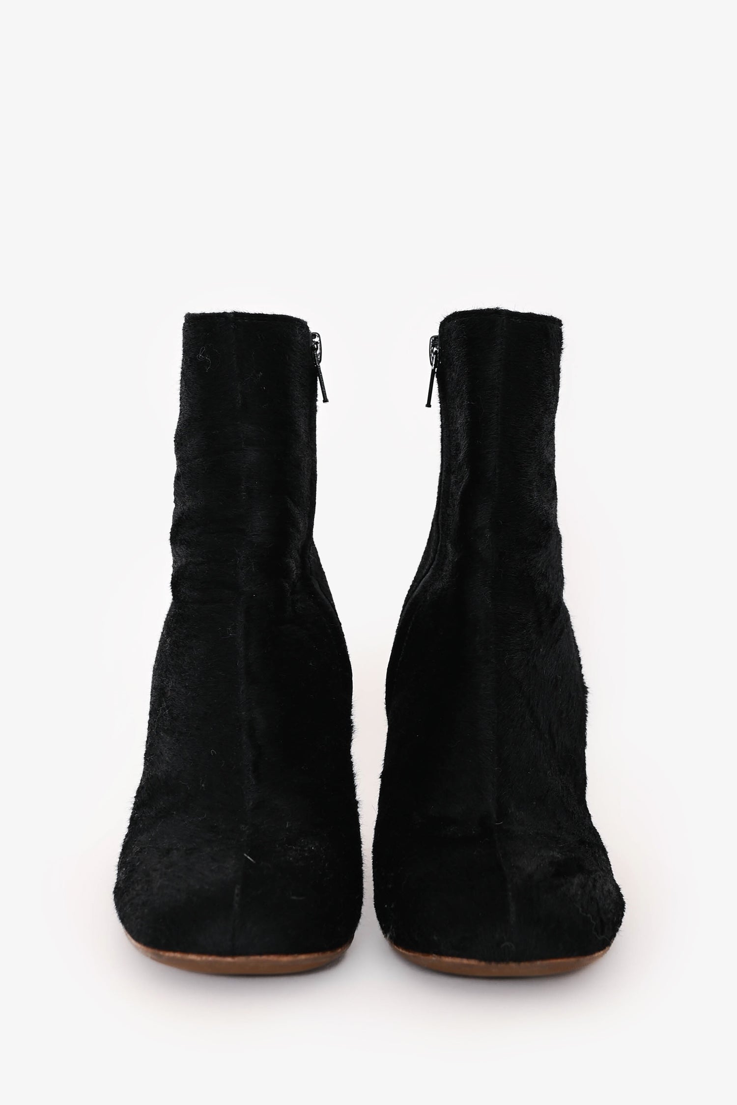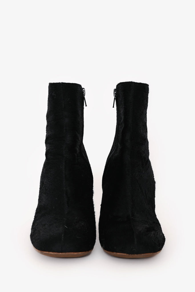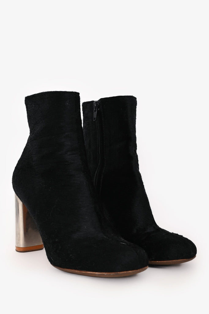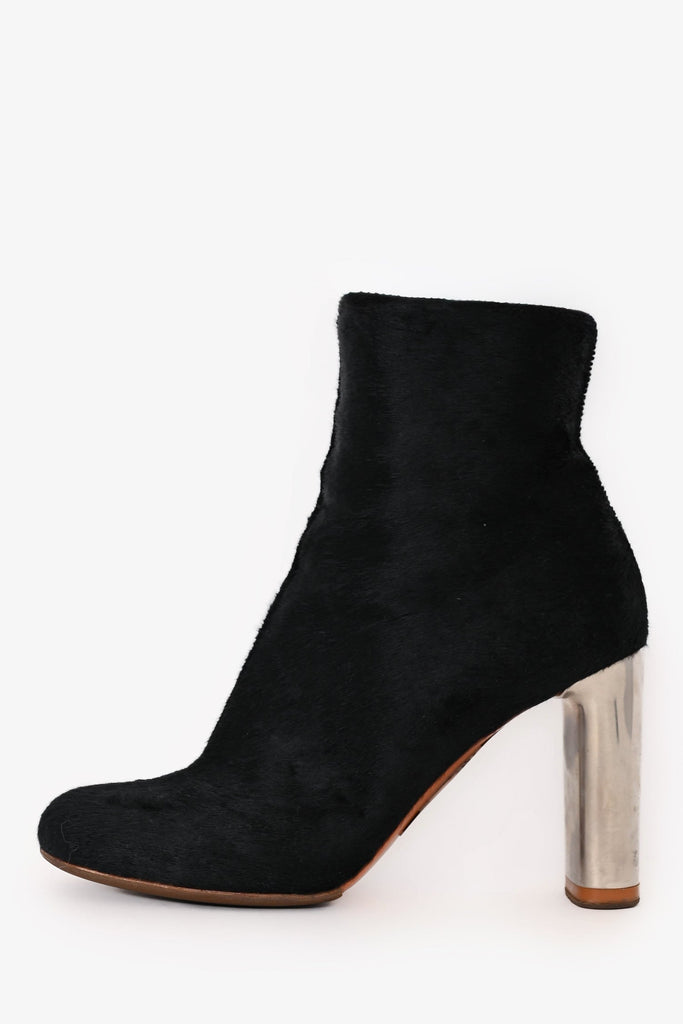 Celine Black Ponyhair Ankle Boots. Slip-on. Round toe. Side zip closure. Silver-tone hardware. Tonal stitching.