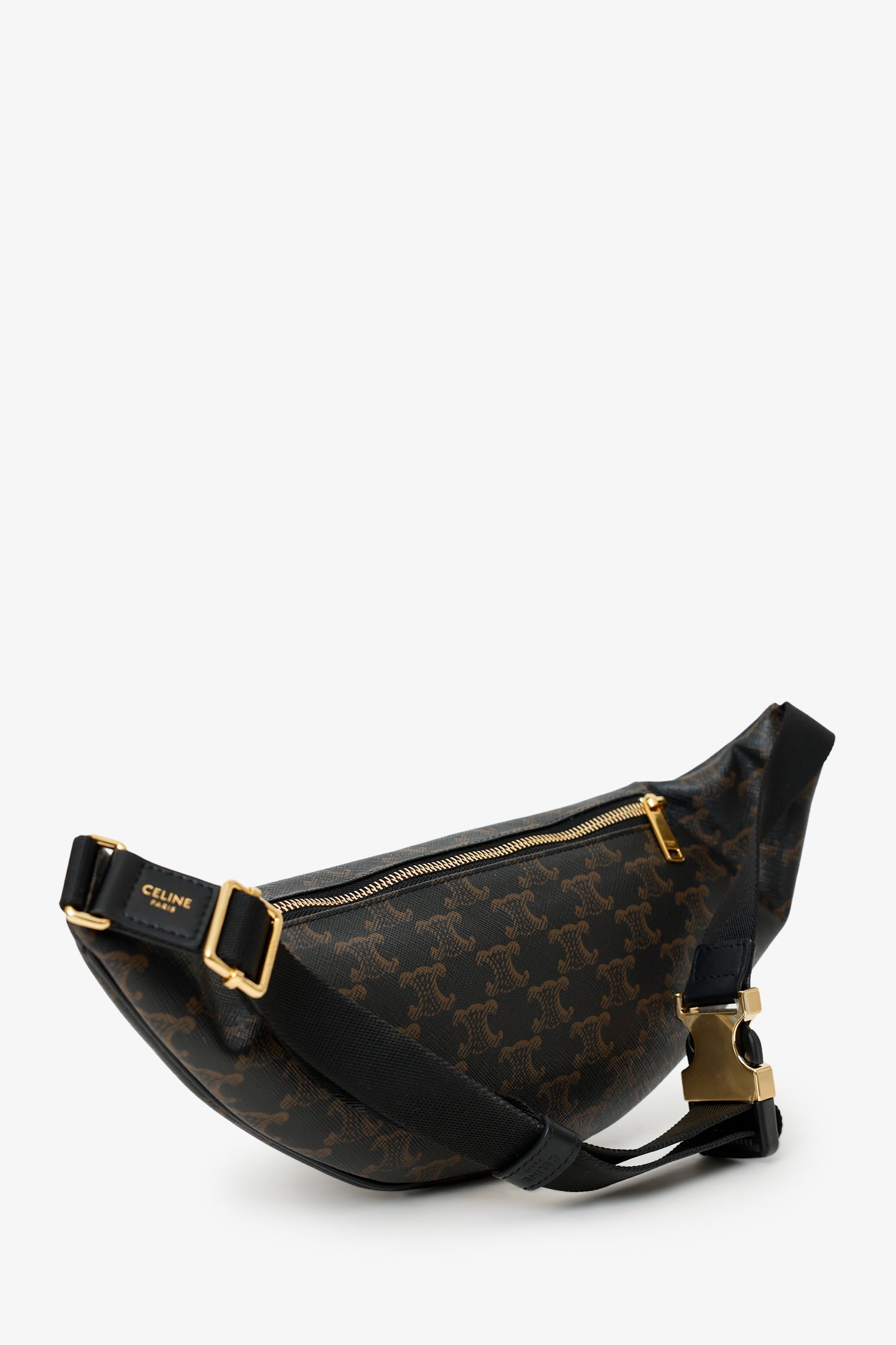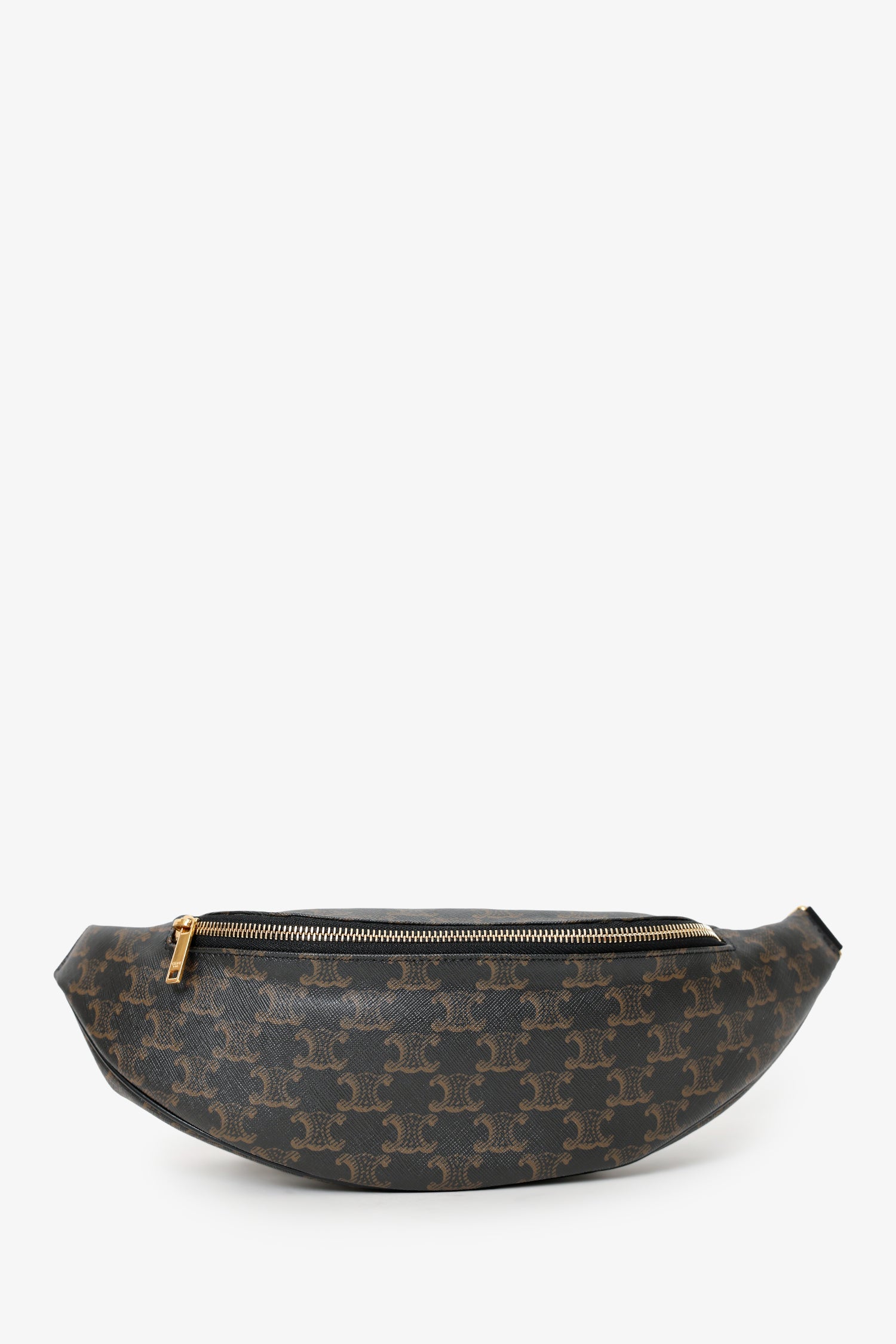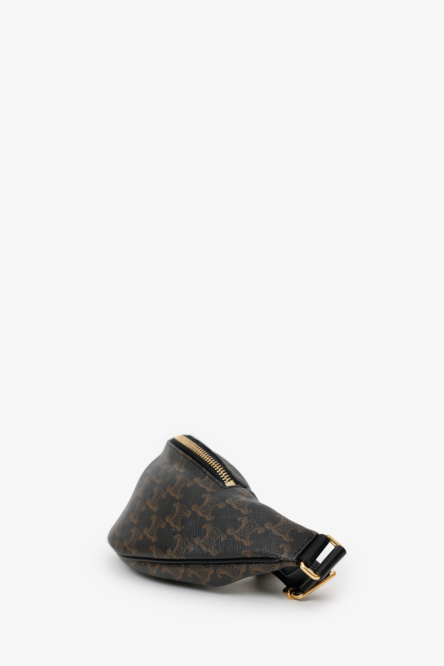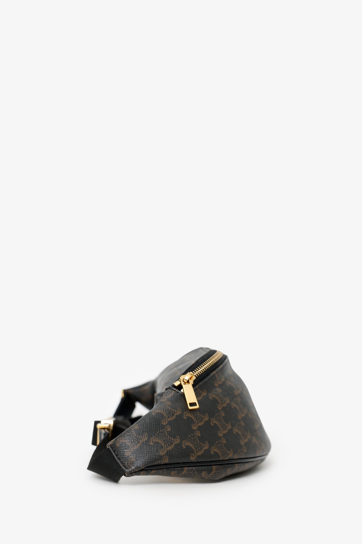 Celine Brown Triomphe Canvas Belt Bag. Front zip-up closure. Adjustable rear belt clasp closure. Single rear exterior zip-up pocket. Canvas-lined interior. Gold-tone hardware. Tonal stitching.