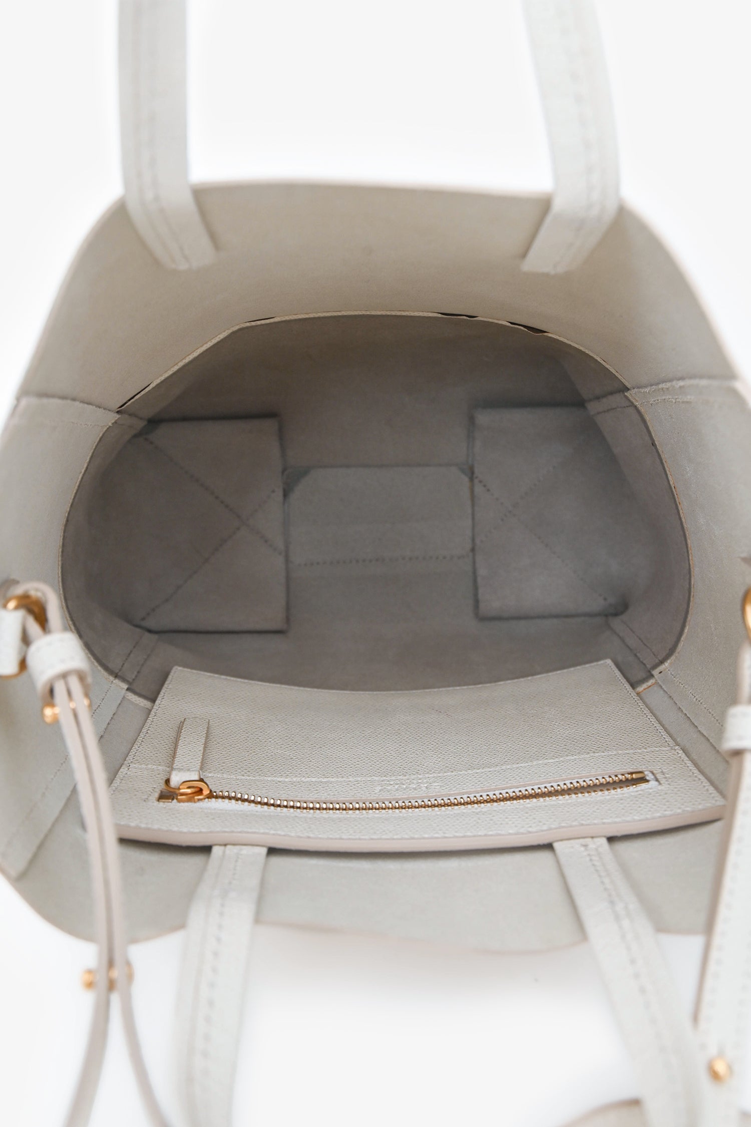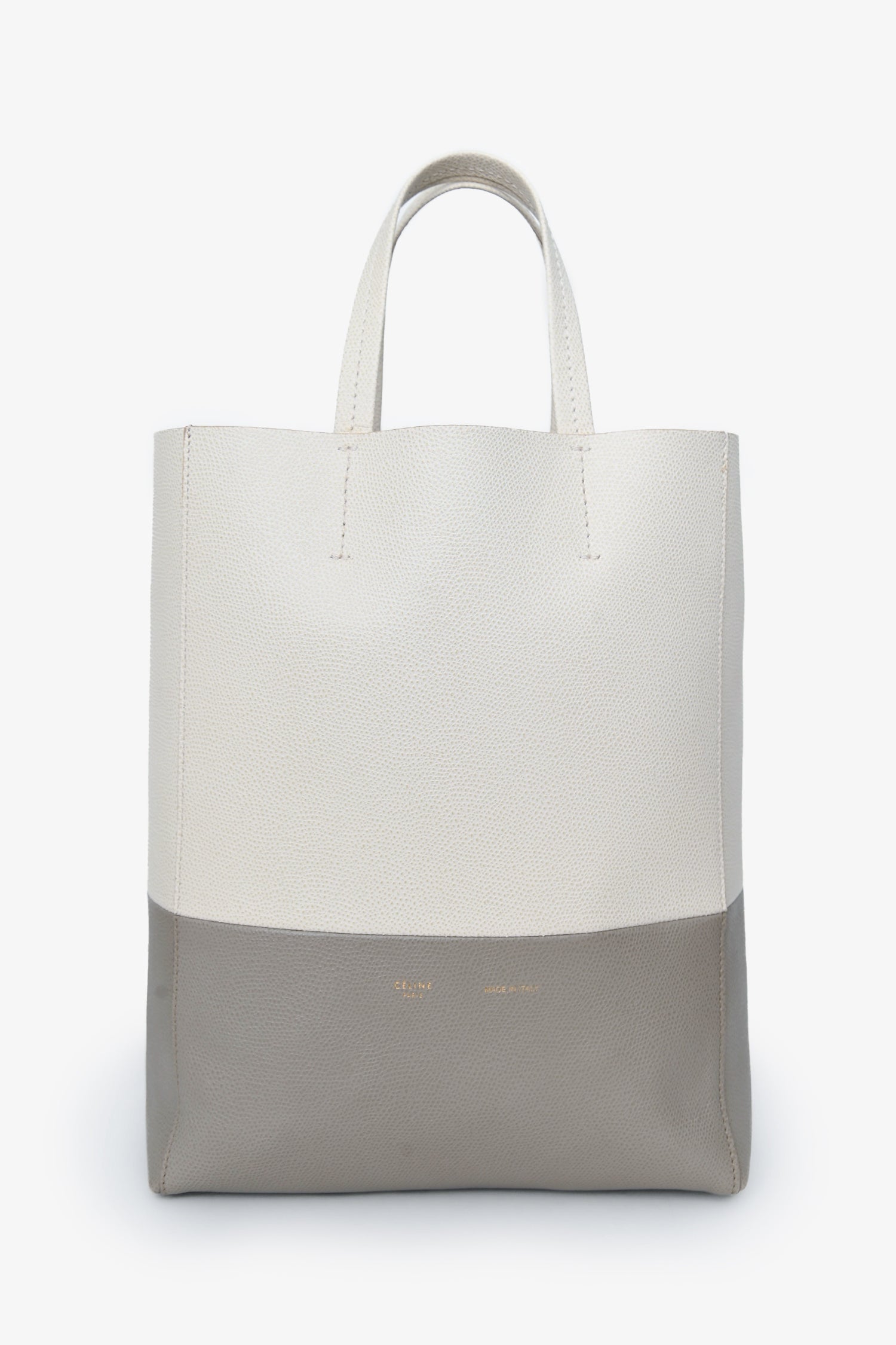 Celine White/Taupe Leather Cabas Bag with Strap. Open top. Twin top handles. Detachable and adjustable crossbody strap. Single interior compartment with a zip pouch. Gold-tone hardware. Tonal stitching.