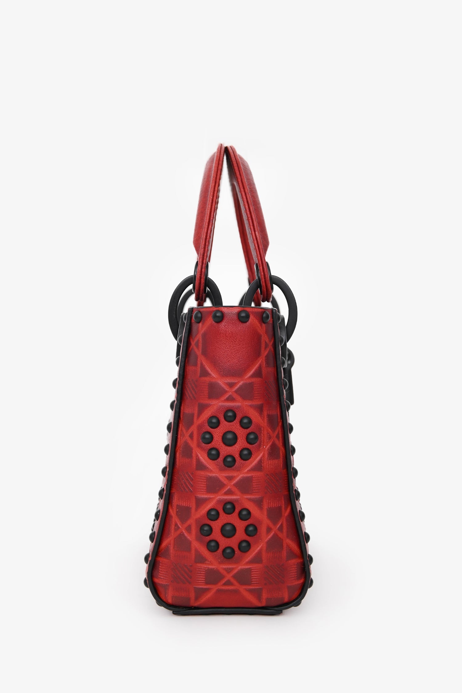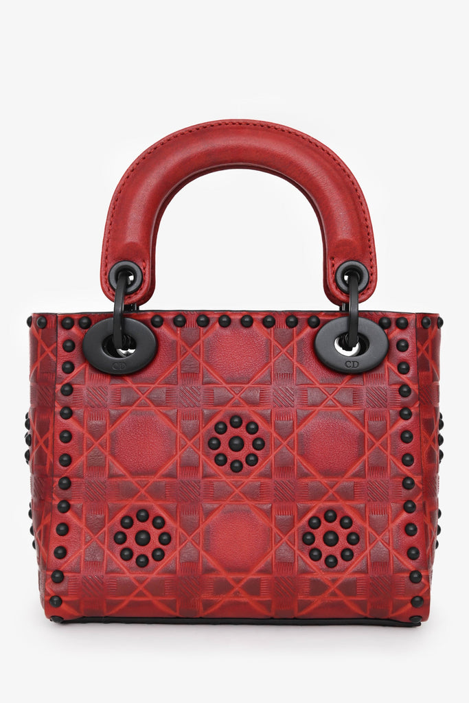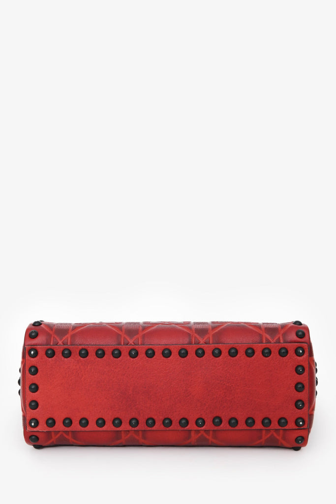 Christian Dior 2018 Red Leather Studded Mini Lady Dior Top Handle. Top fold-over flap. Dual top handles. Suede-lined interior with a slip and zip compartment. Gunmetal hardware. Tonal stitching.