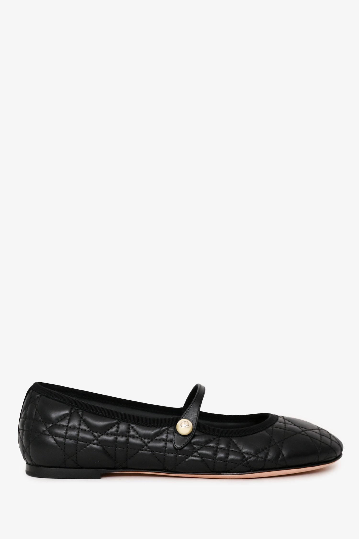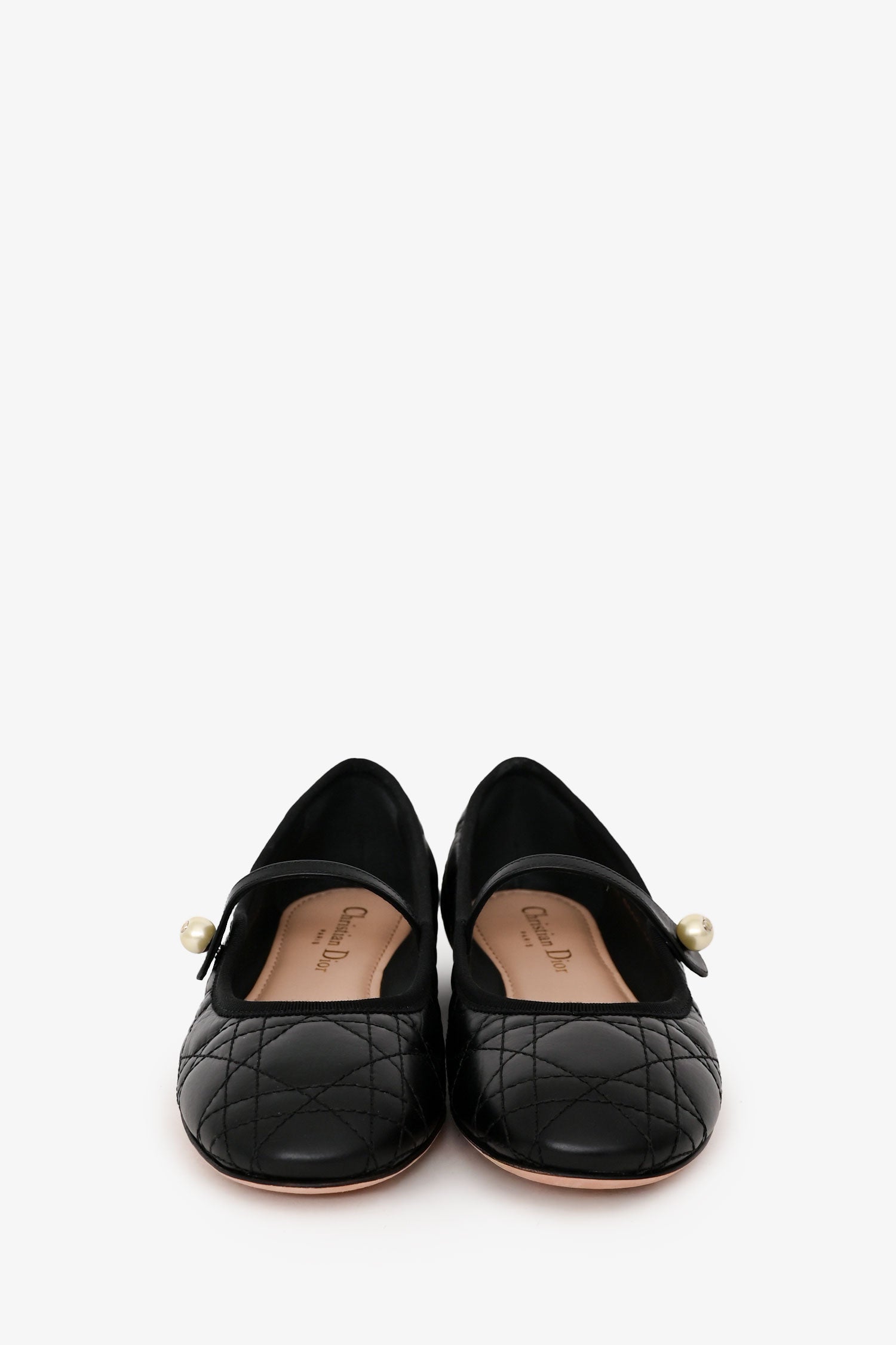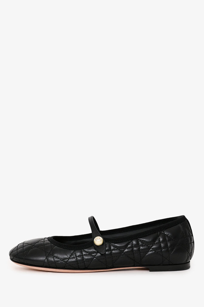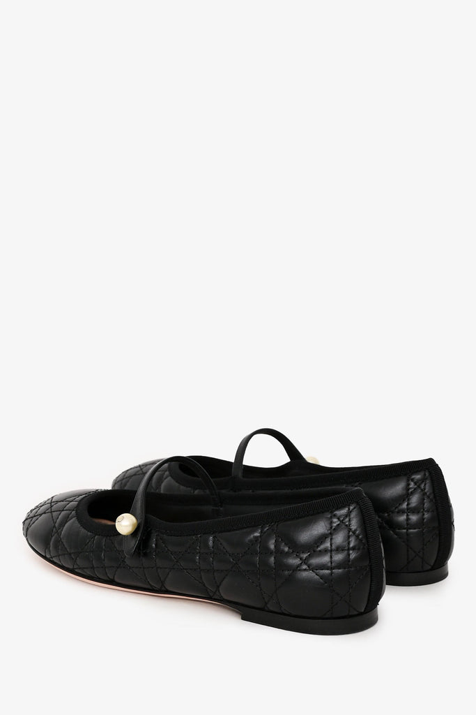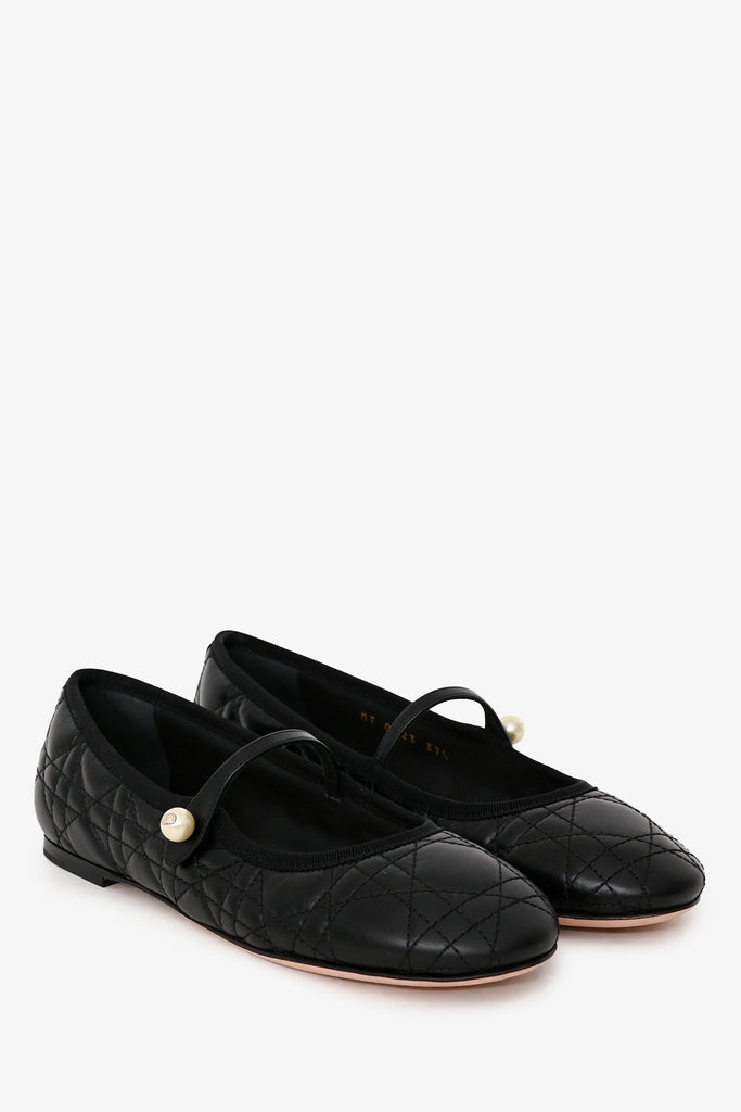 Christian Dior Black Leather Cannage Quilted Mary Jane Flats. Slip-on. Round toe. Gold-tone hardware. Pearl details. Tonal stitching.