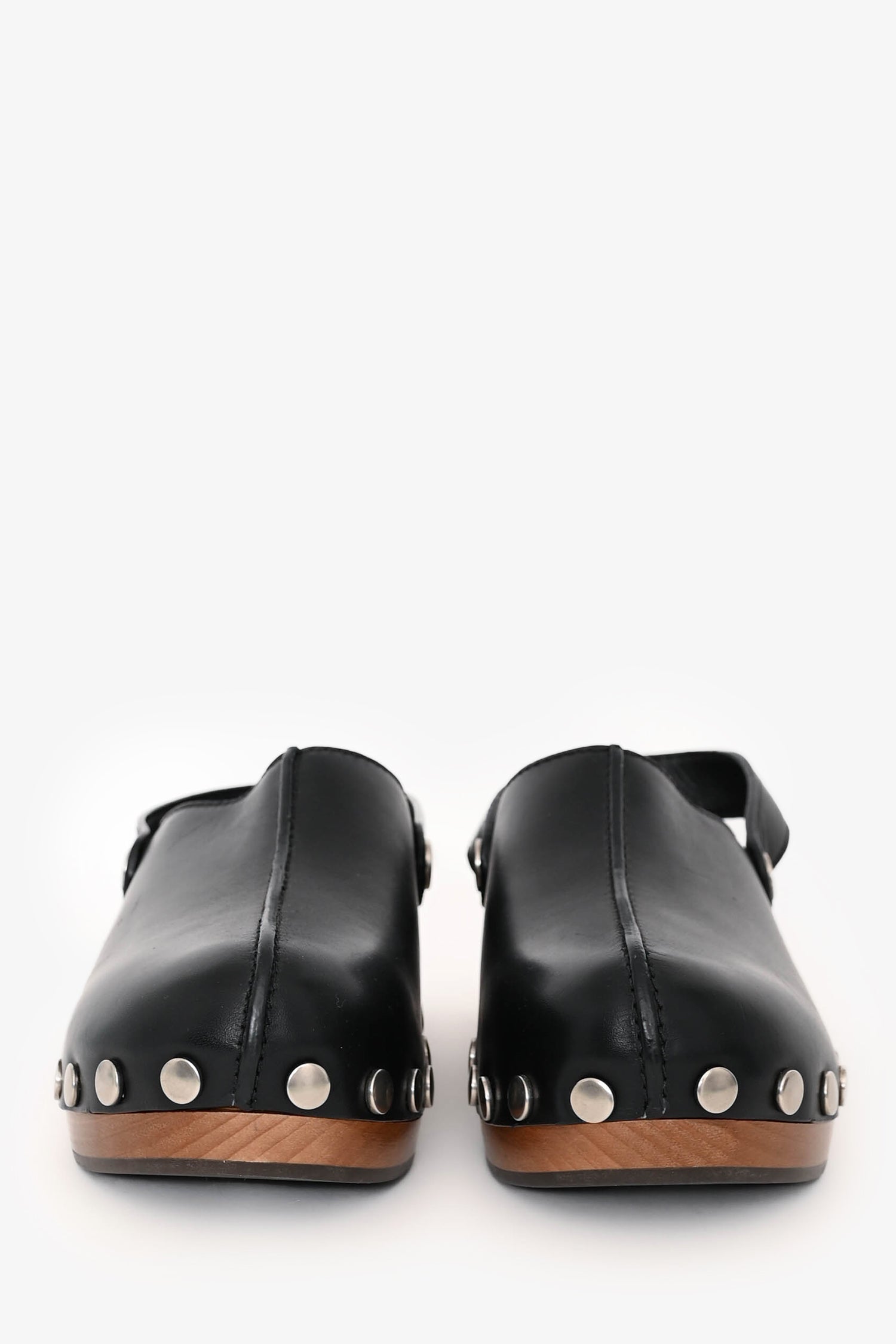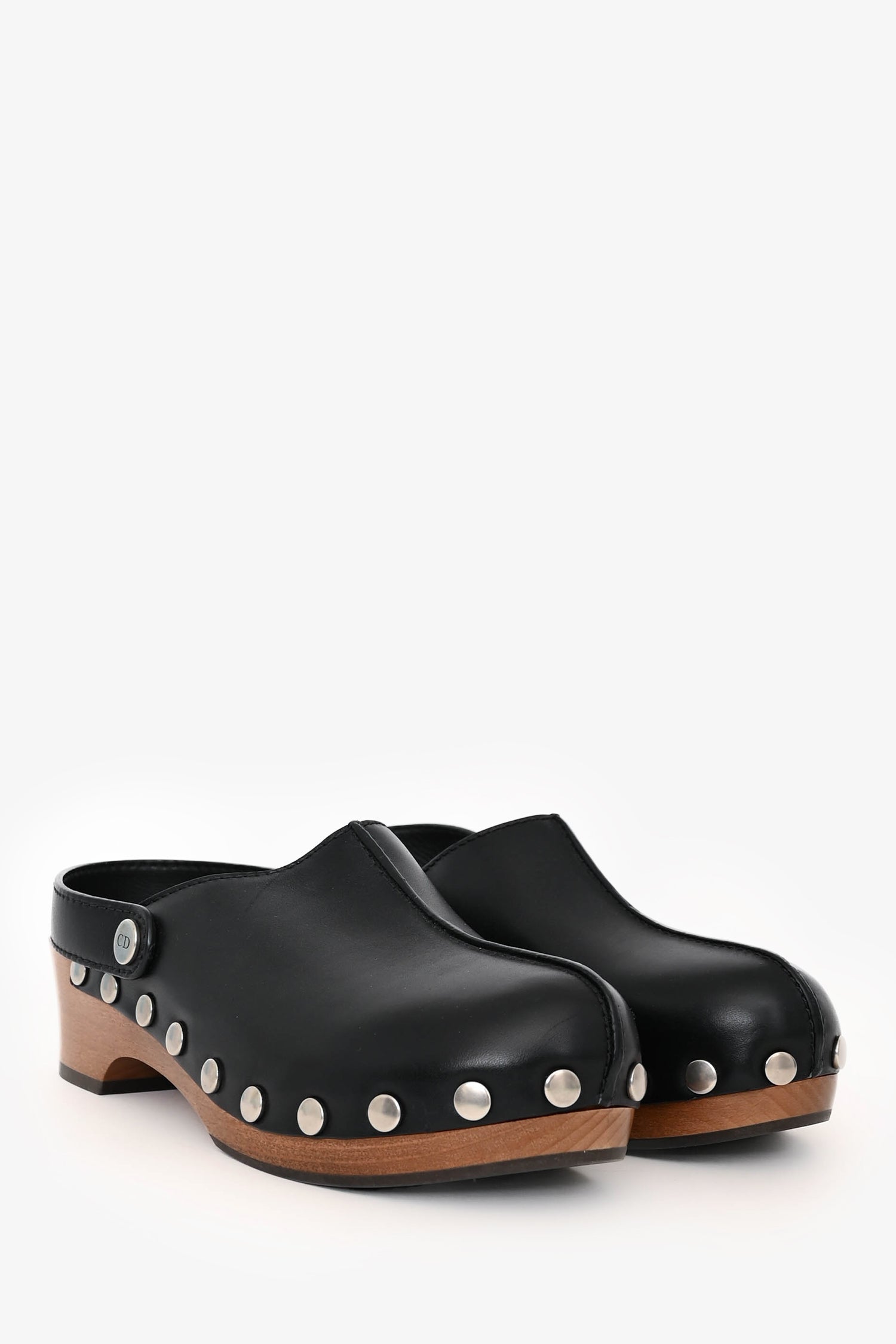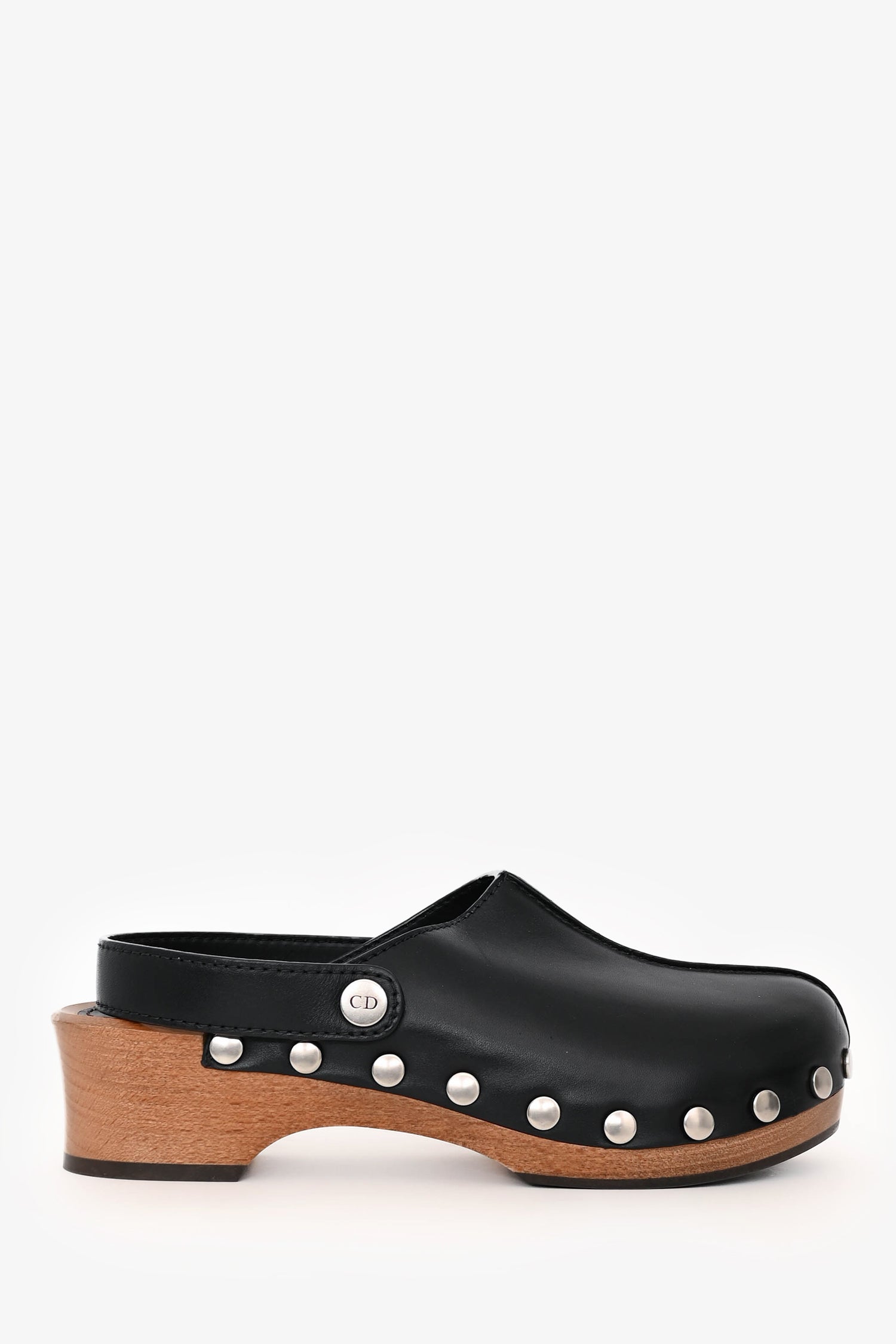 Christian Dior Black Leather Diorquake Clogs. Slip-on. Round toe. Stud trim. Heel strap. Wooden insole with leather logo detailing. Wooden platform sole. Silver-tone hardware. Tonal stitching.