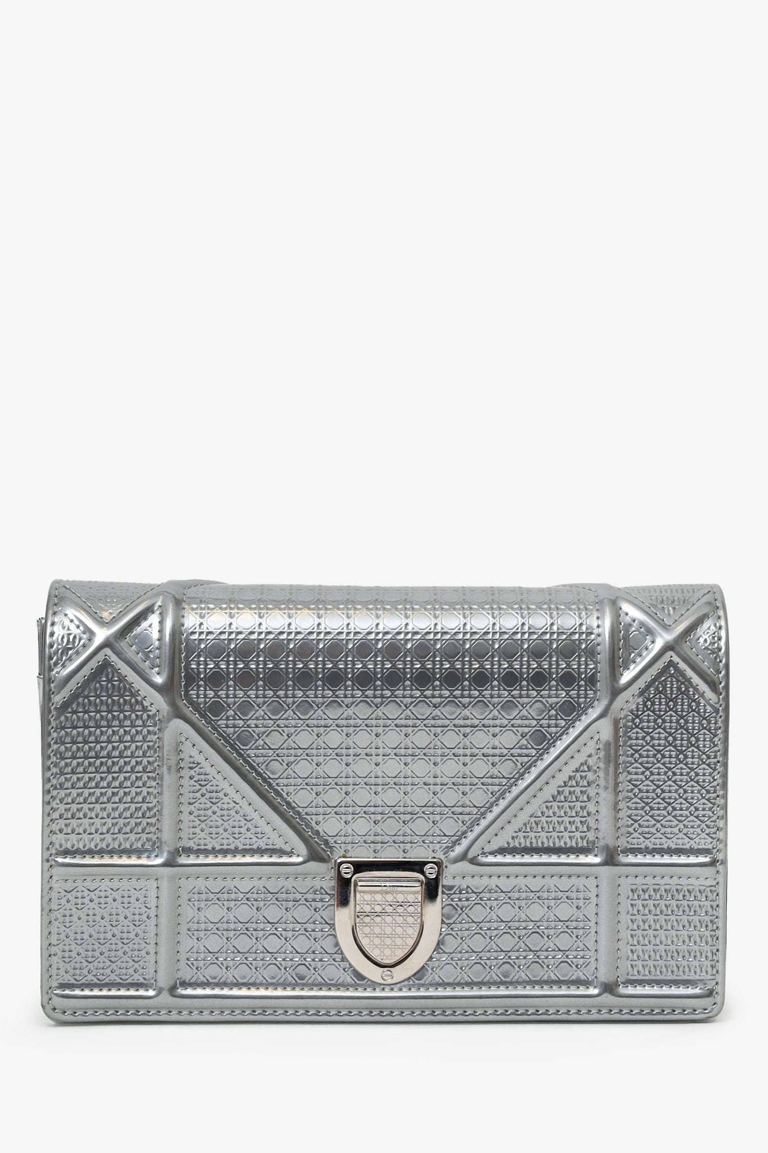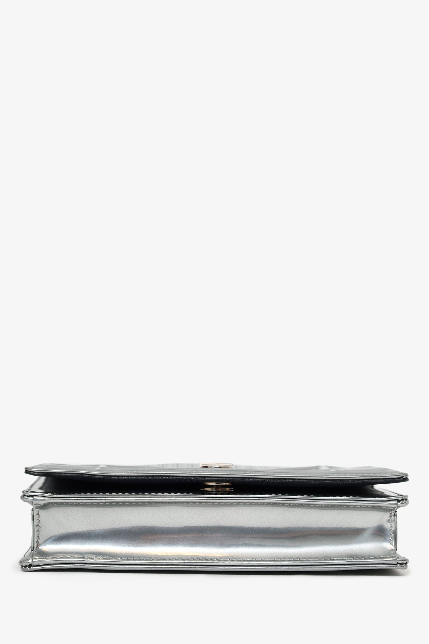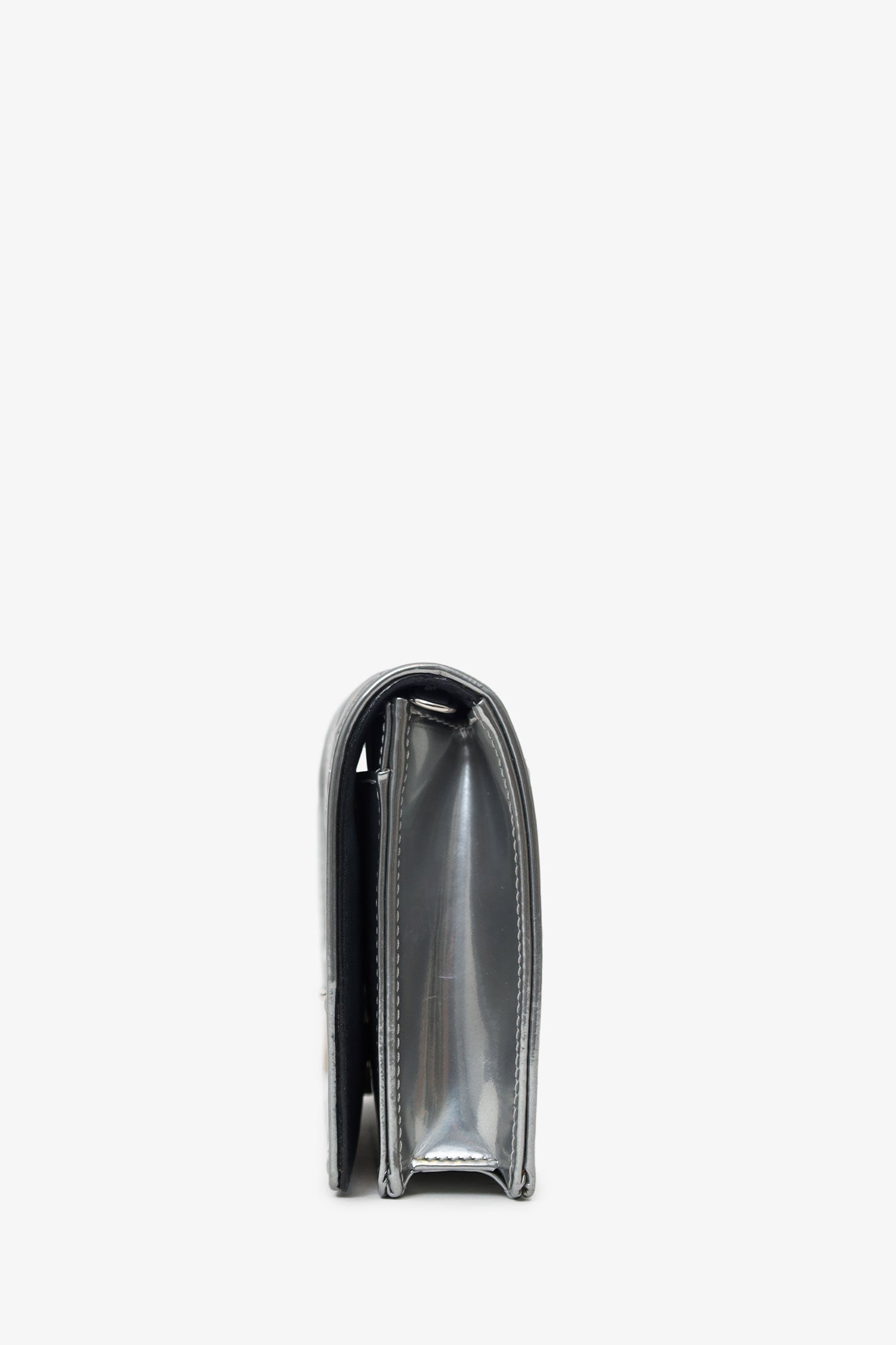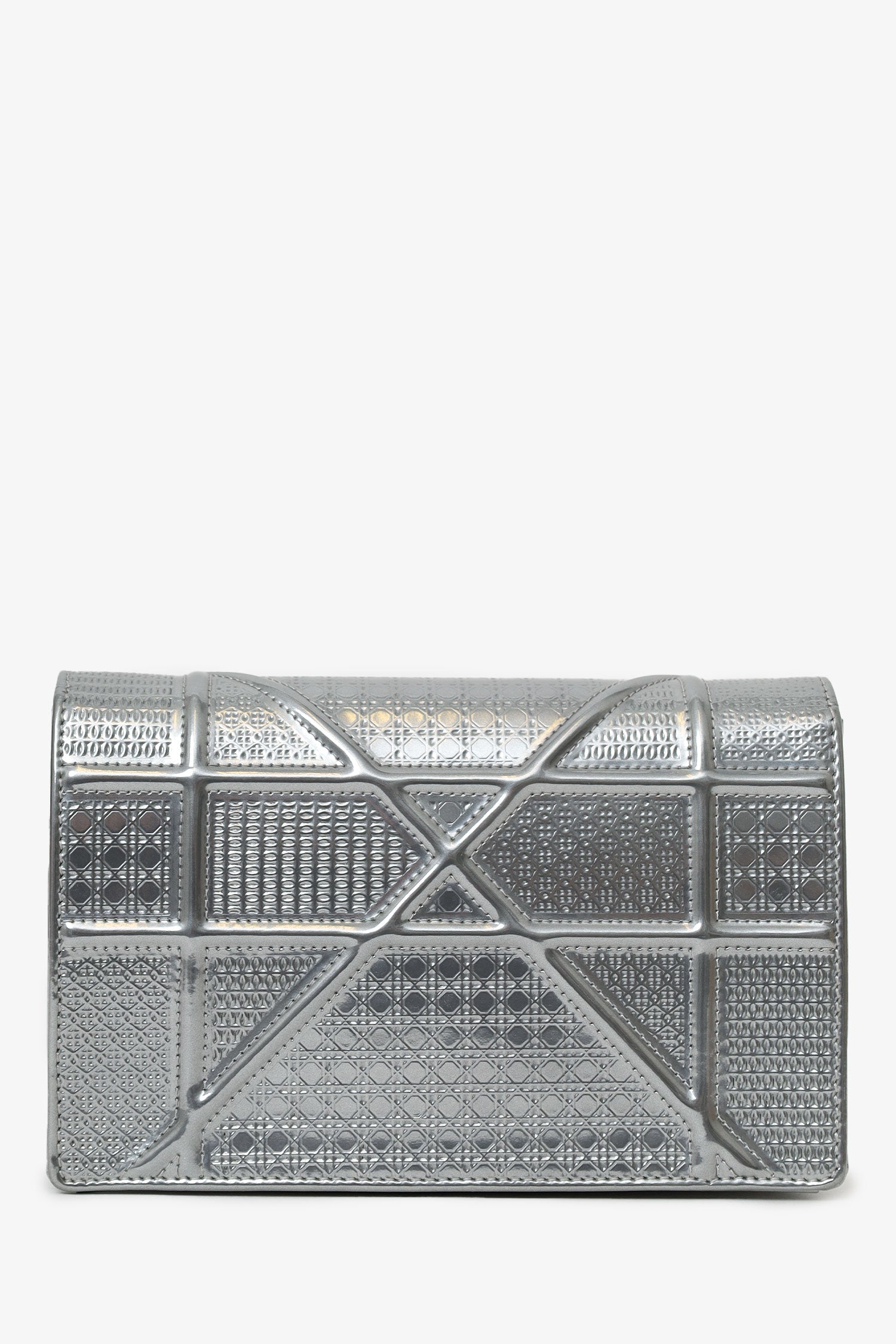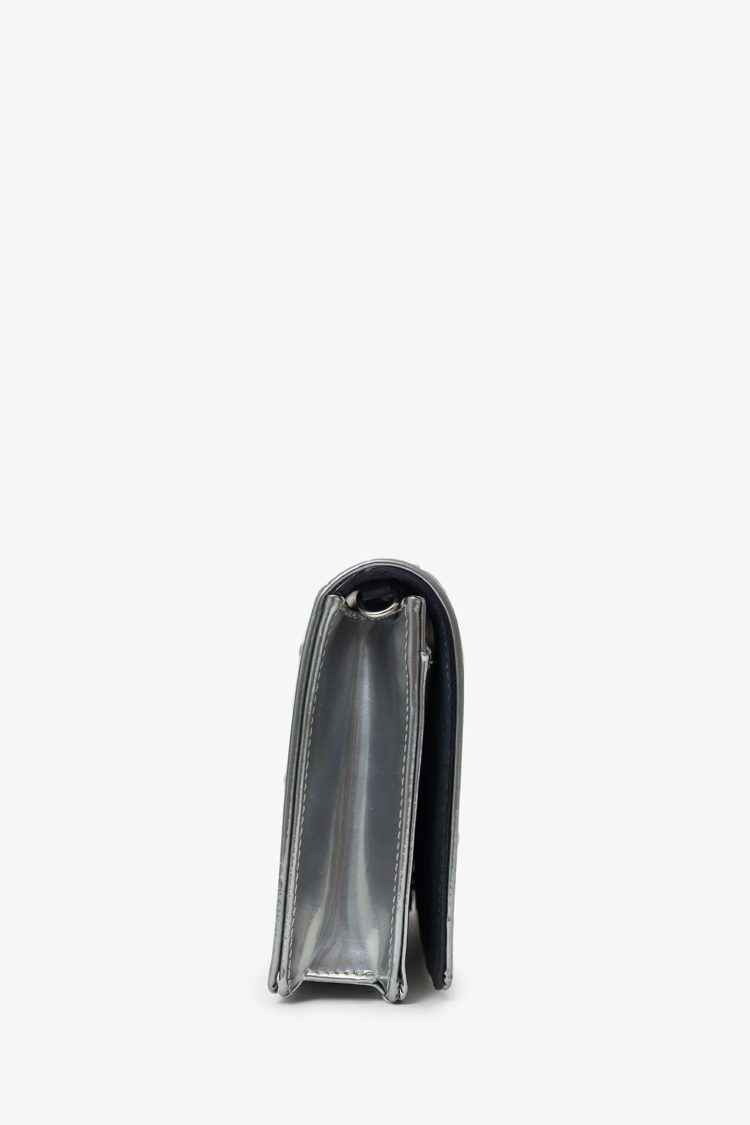 Christian Dior Metallic Patent Microcannage Diorama Wallet on Chain. Front fold-over flap with snap button-up closure. Removable crossbody chainlink strap with clasp closure. Lined interior with 6 pockets; 5 slip, and 1 zip. Silver-tone hardware. Tonal stitching.