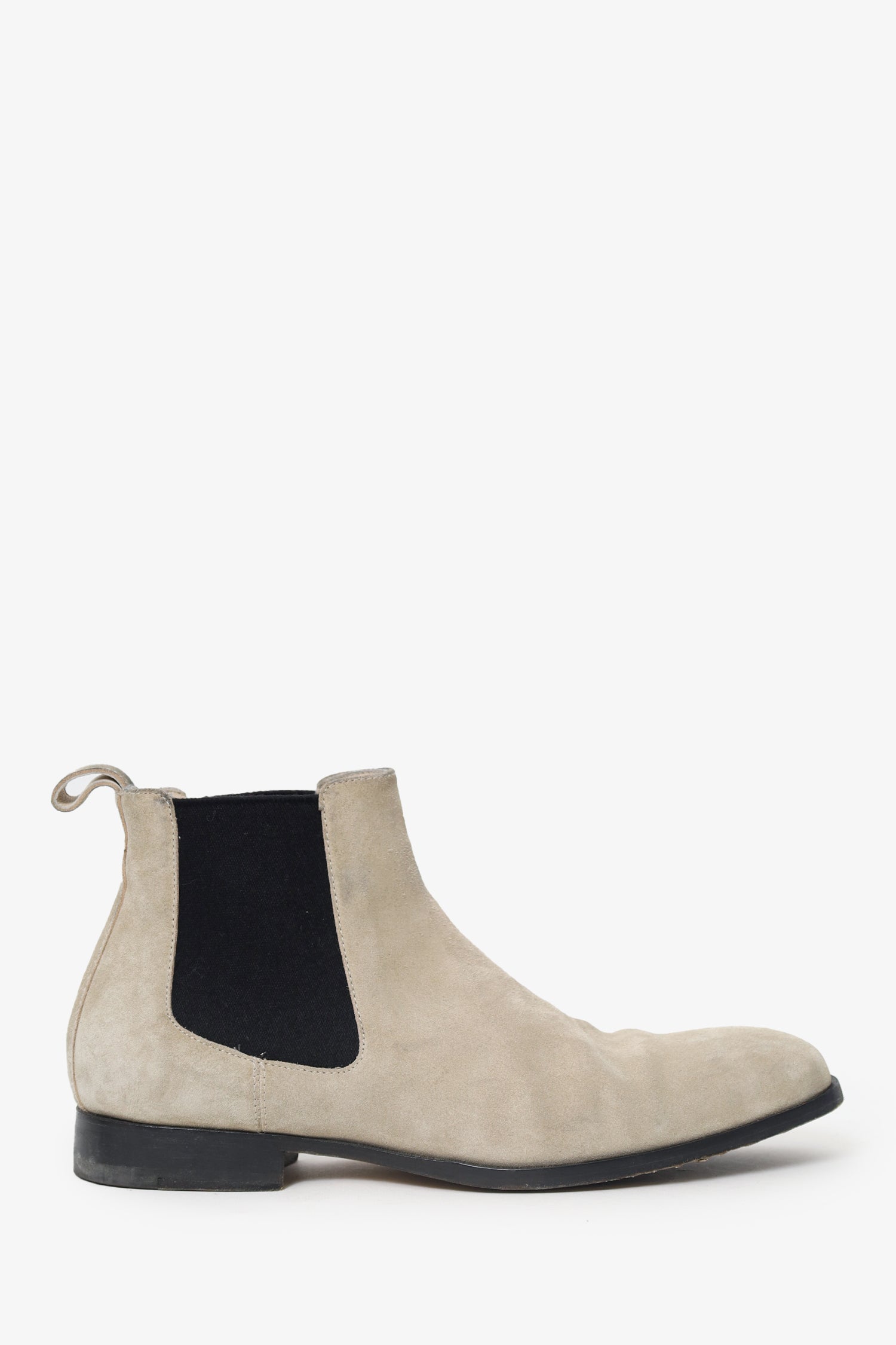 Dries Van Noten Beige Suede Chelsea Boots. Pull-on. Round-pointed toe. Rear pull-tabs. Lined interior. Tonal stitching.
