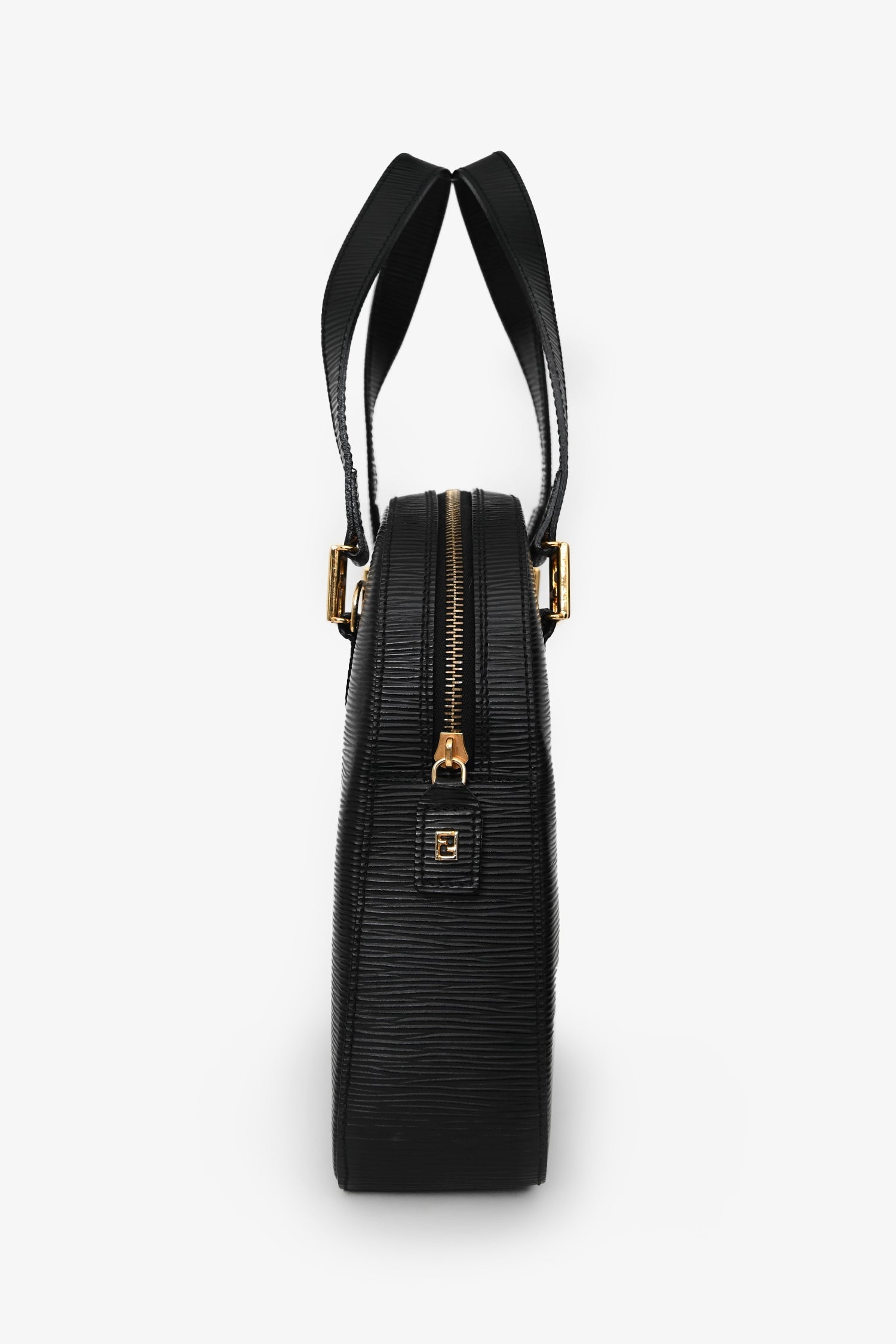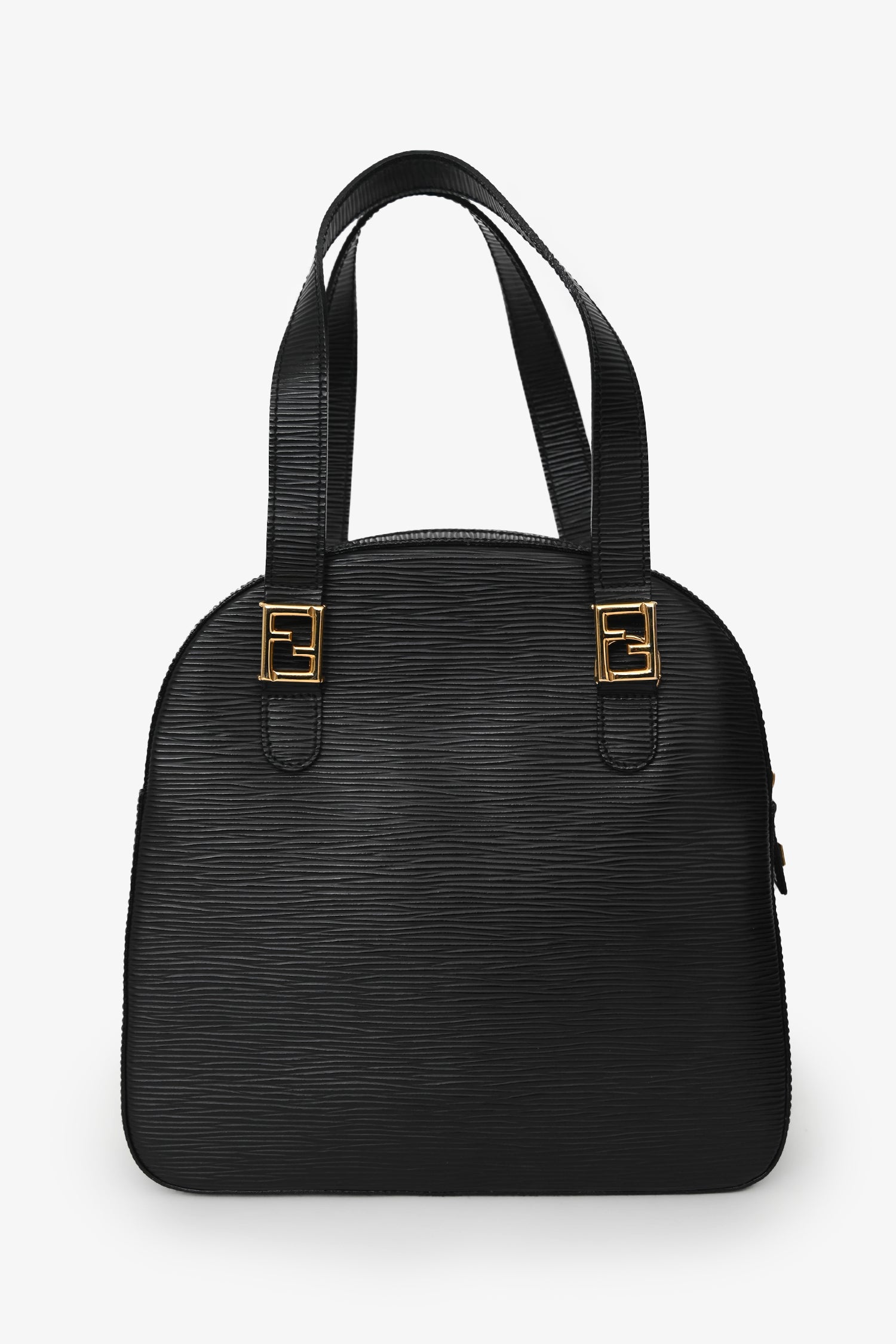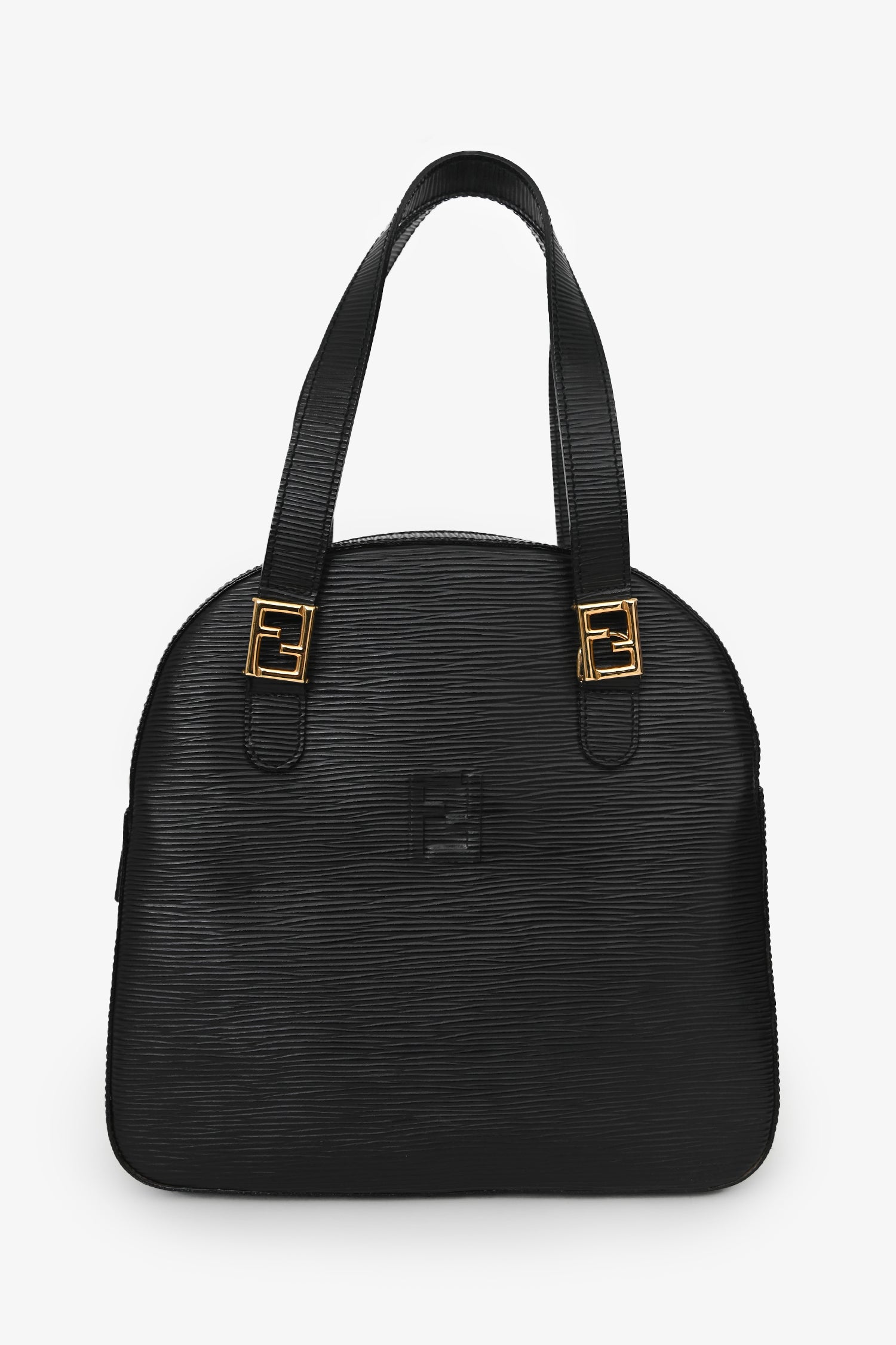 Fendi Black Epi Leather 'FF' bag with Strap. Top zip closure. Twin top handles. Detachable shoulder strap. Single interior compartment with a zip pocket. Textile-lined. Gold-tone hardware. Tonal stitching.