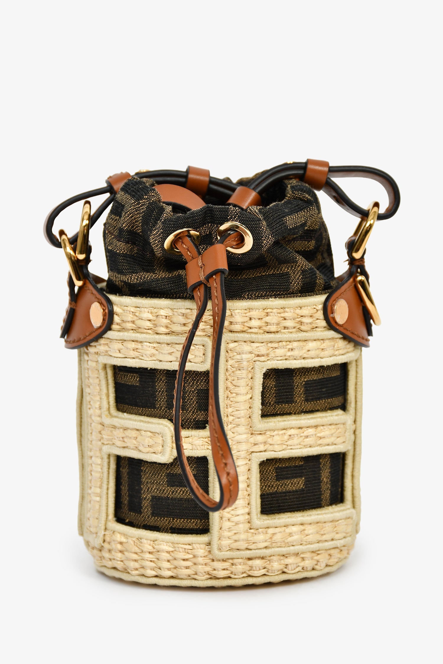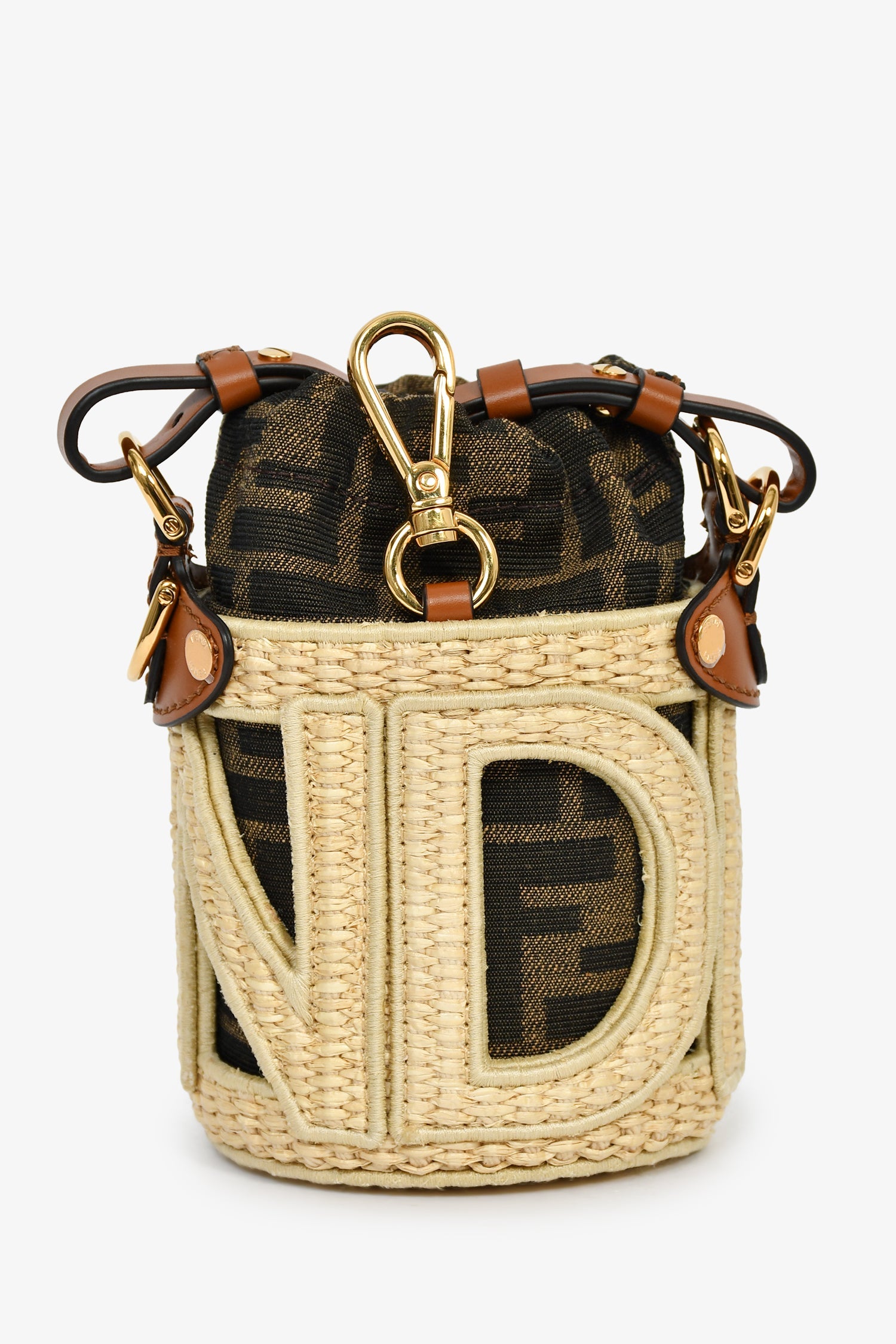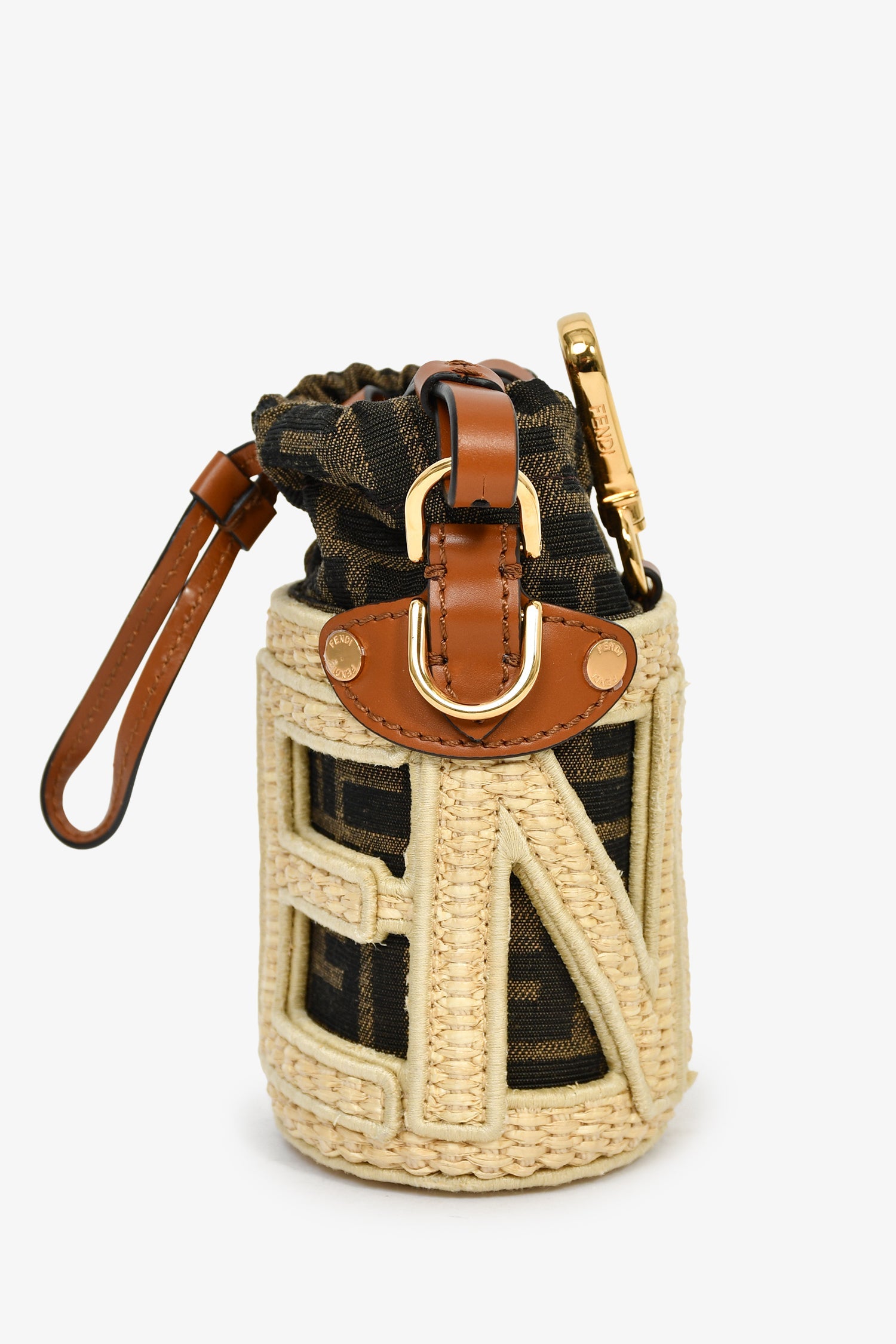 Fendi Brown/Beige Zucca FF Step Out Nano Bucket Bag. Front drawstring closure. Adjustable strap. Exterior latch clasp. Open interior. Gold-tone hardware. Tonal stitching.