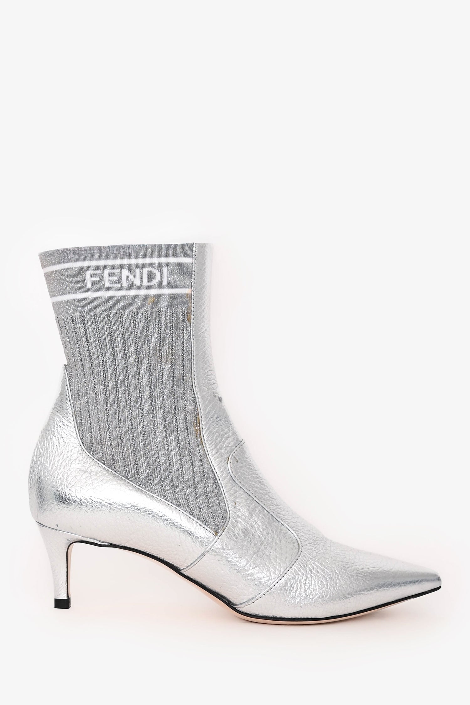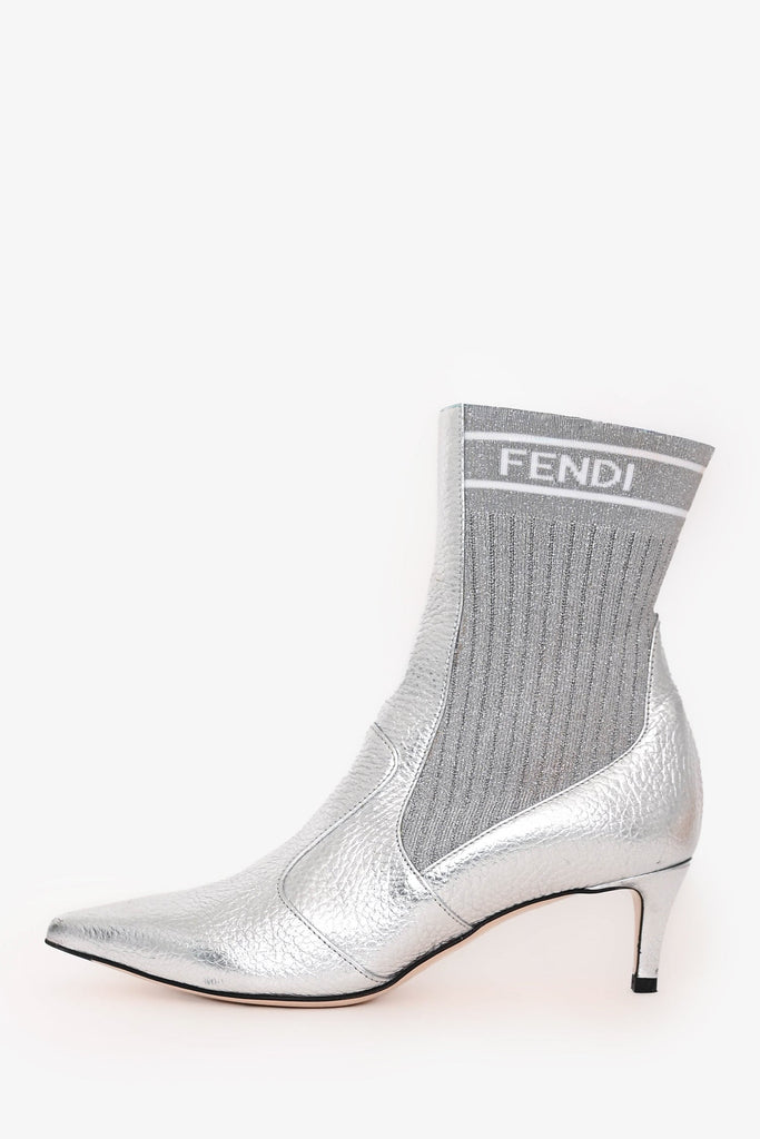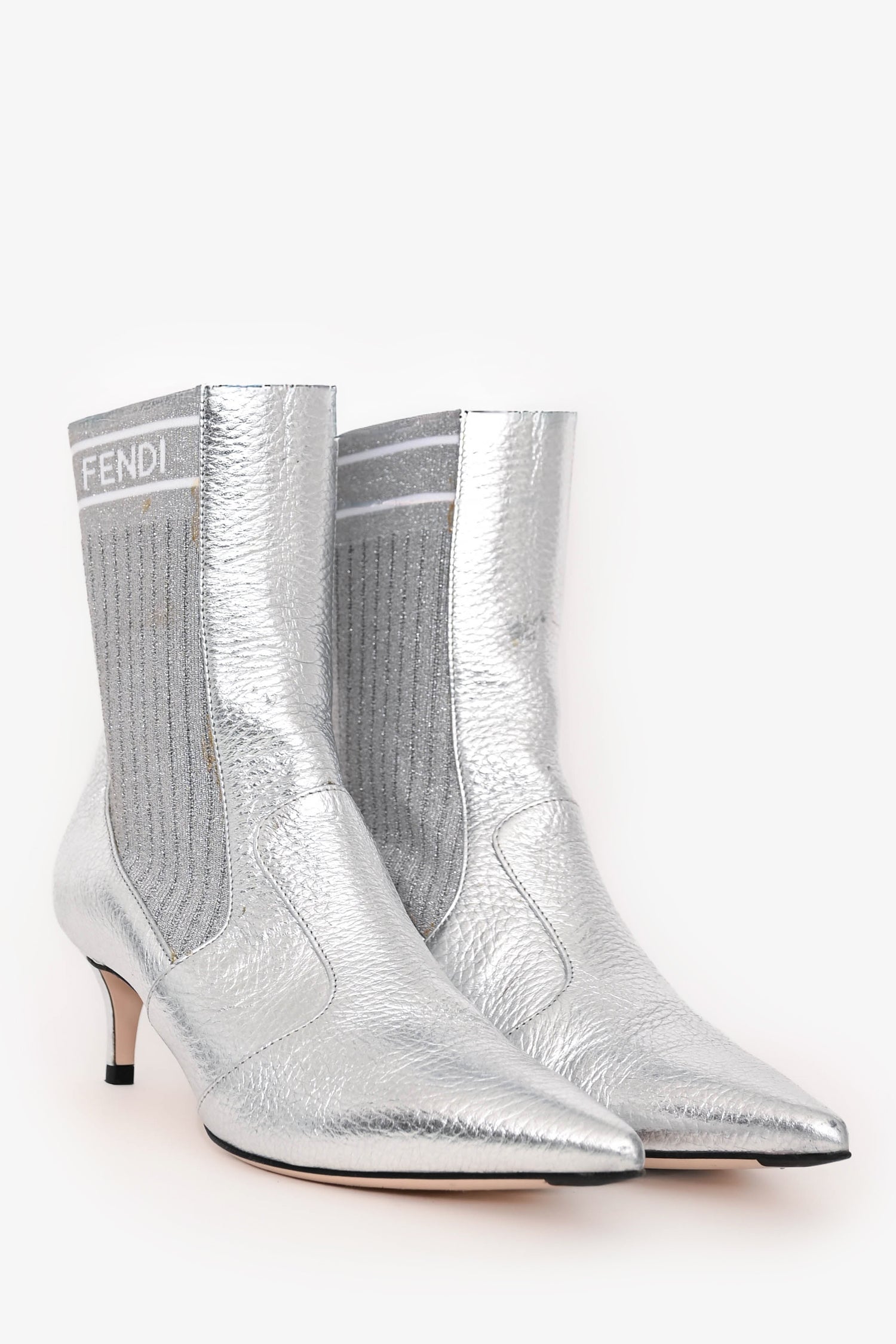 Fendi Silver Leather Pointed Toe Kitten Heel Boots. Pull-on. Pointed toe. Contrast knit detailing. Tonal stitching.