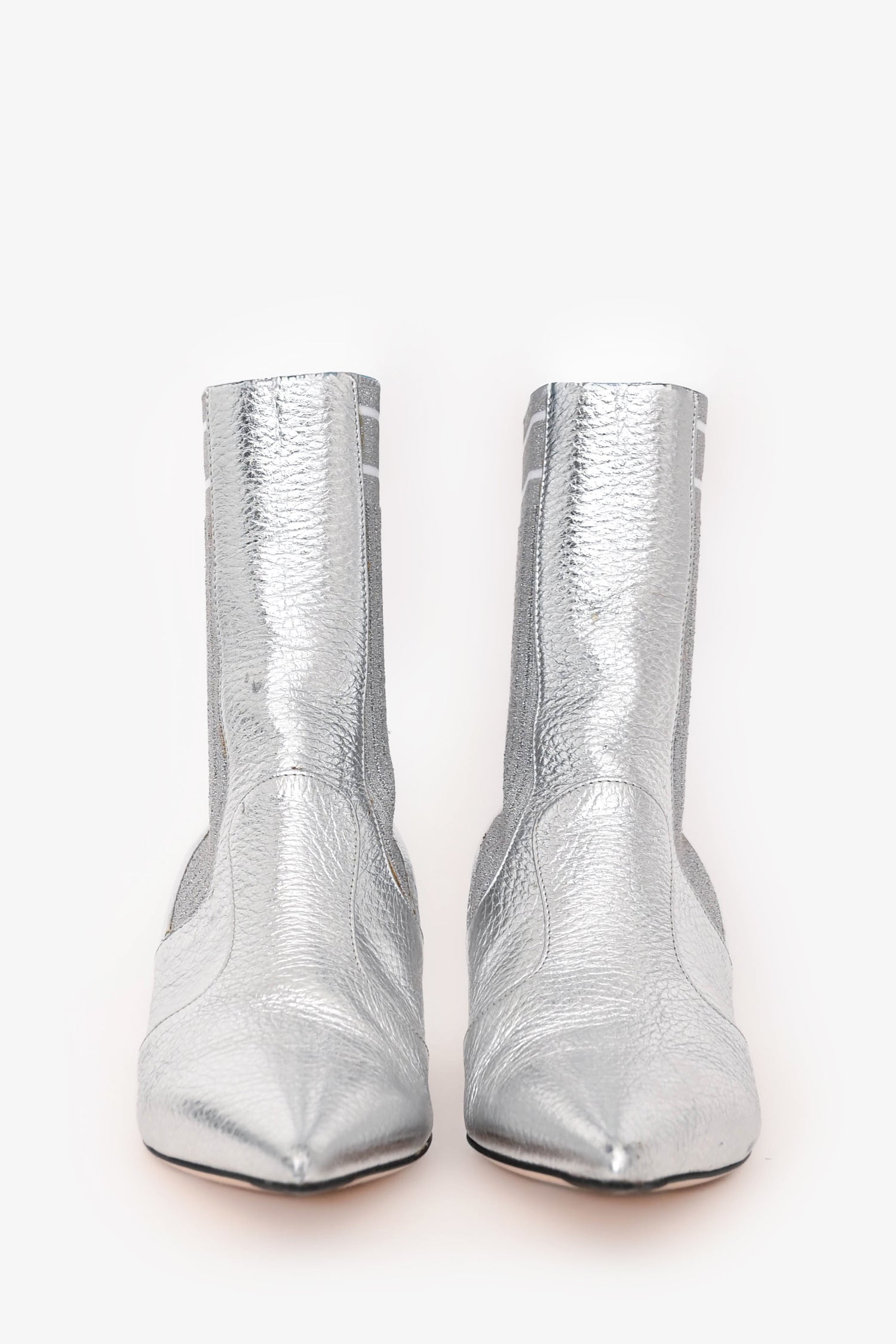 Fendi Silver Leather Pointed Toe Kitten Heel Boots Size 36.5
