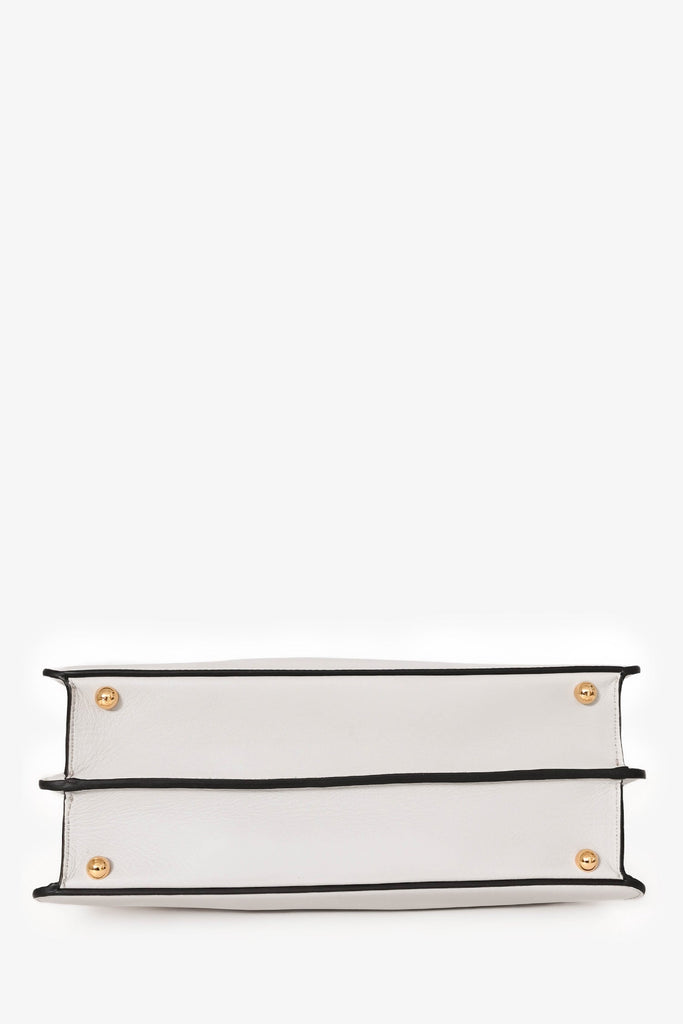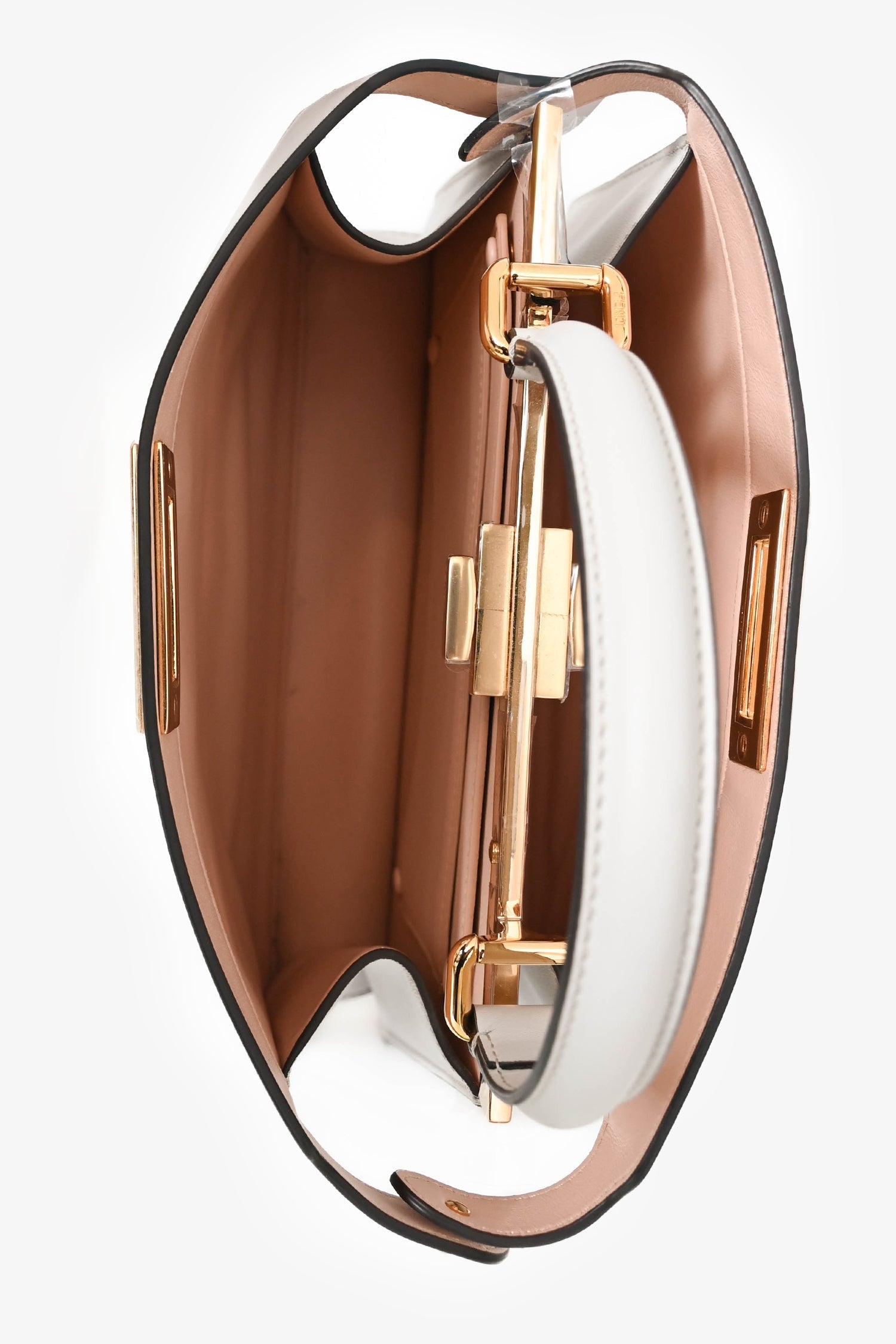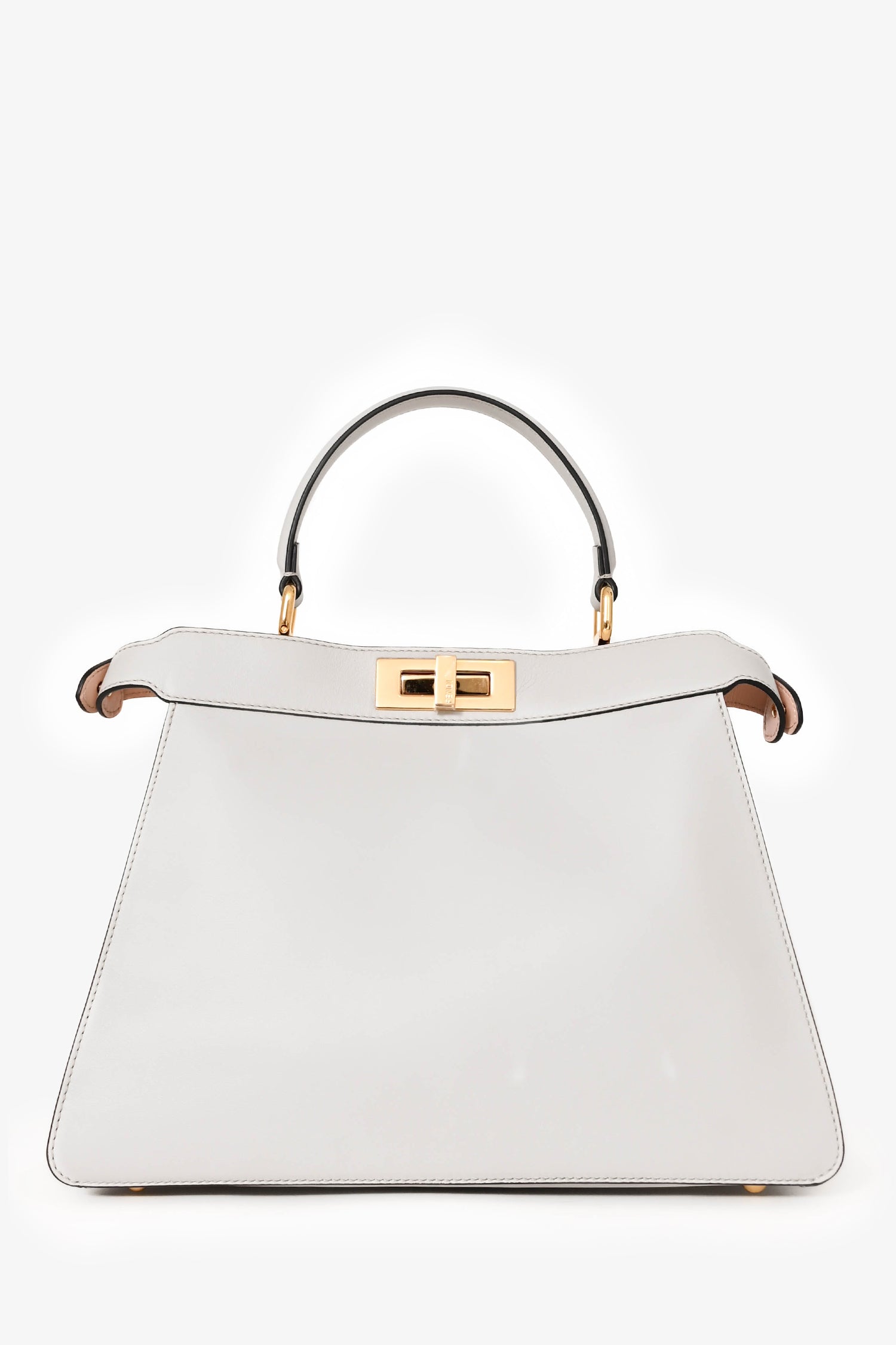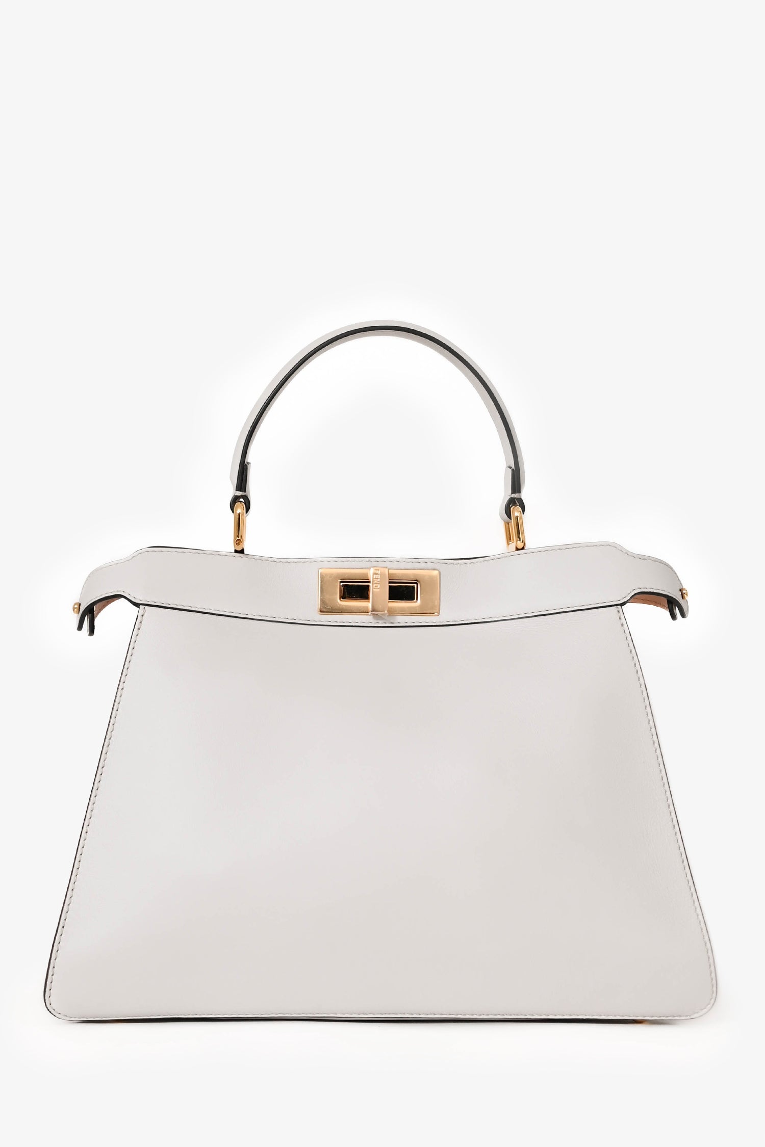 Fendi White Calfskin Medium Peekaboo Bag with Strap. Top turn-lock closures. Detachable interior flap with single interior wall slip pocket. Protective metal bottom. Detachable and adjustable strap. Gold-tone hardware.