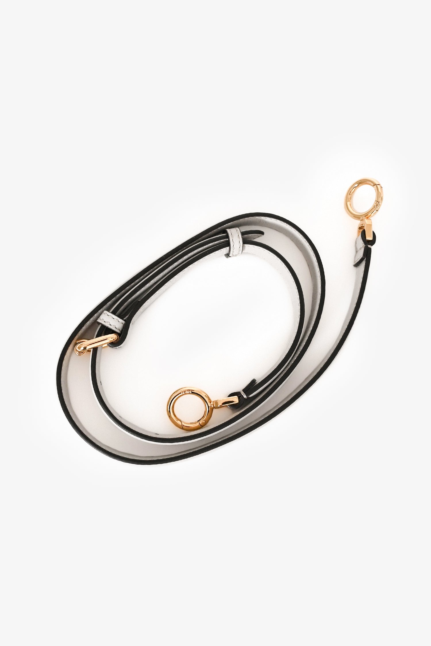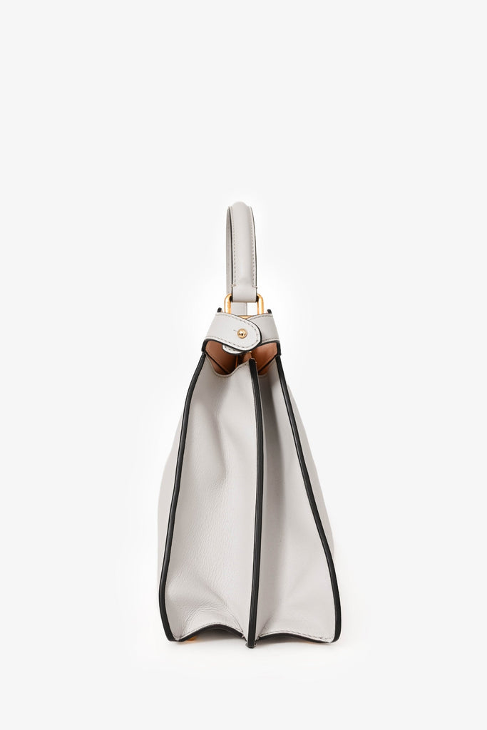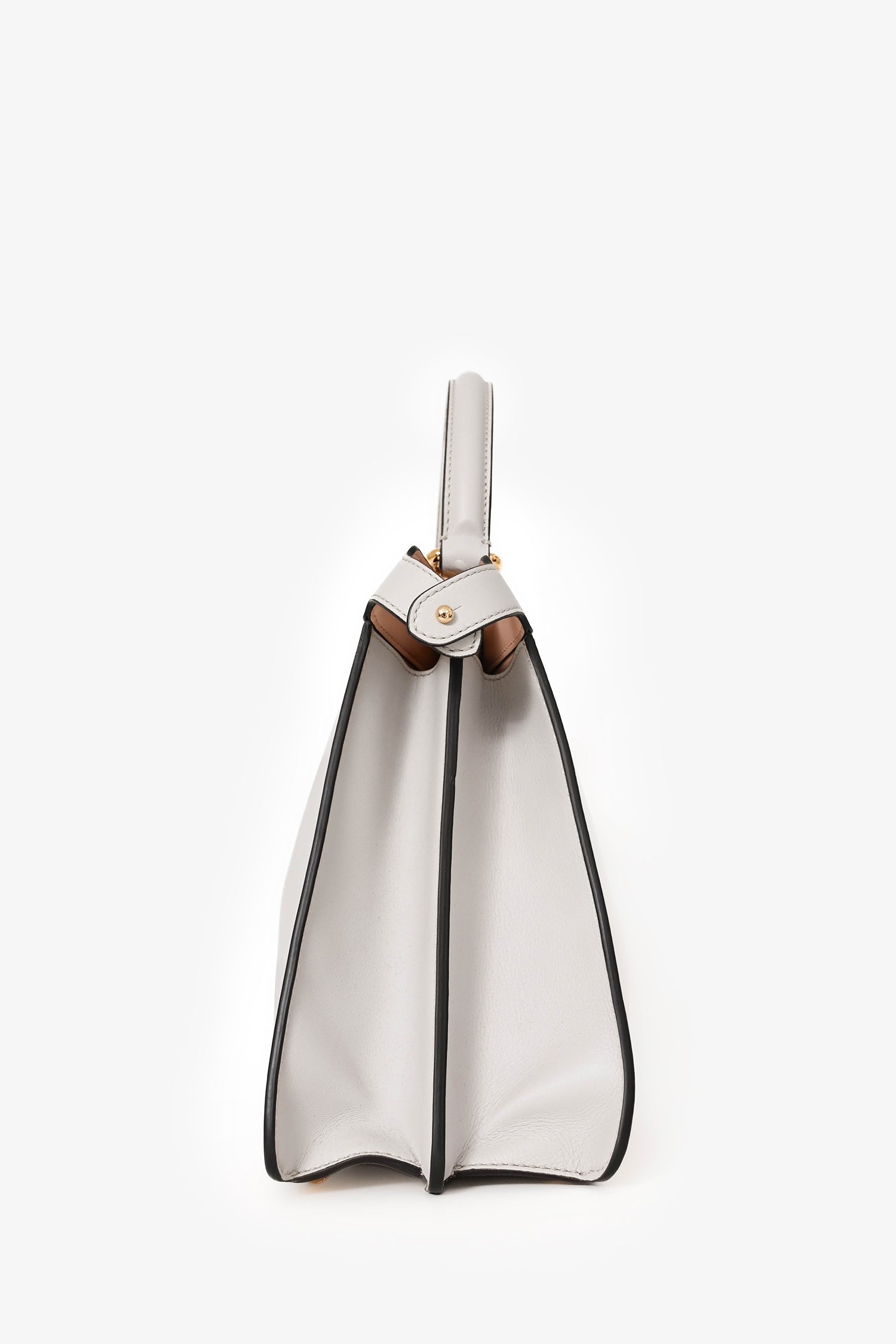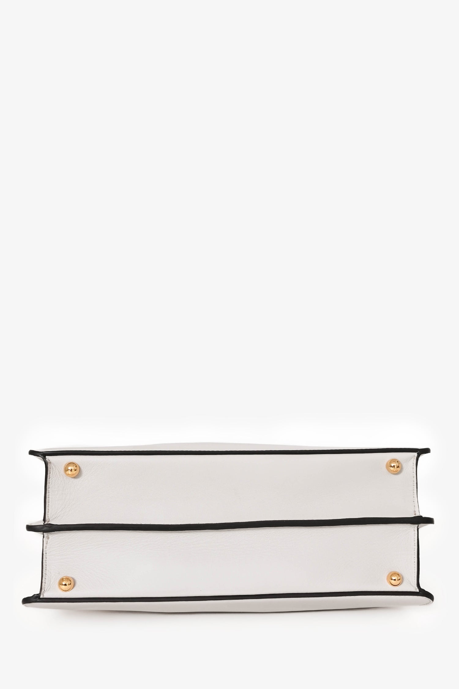 Fendi White Calfskin Medium Peekaboo Bag with Strap. Top turn-lock closures. Detachable interior flap with single interior wall slip pocket. Protective metal bottom. Detachable and adjustable strap. Gold-tone hardware.