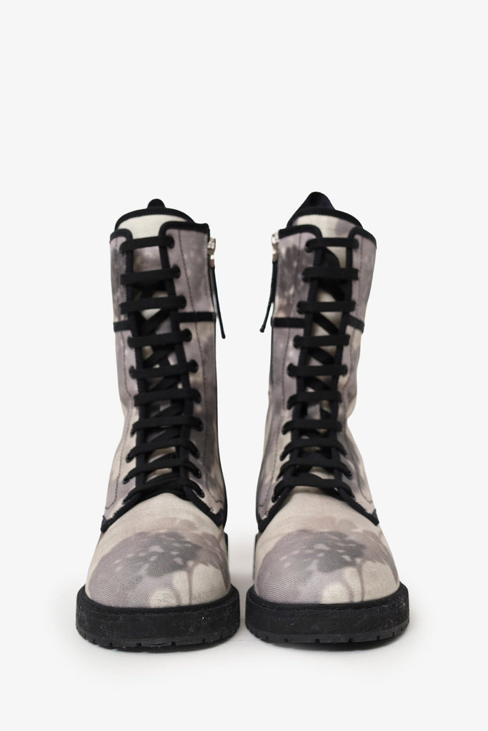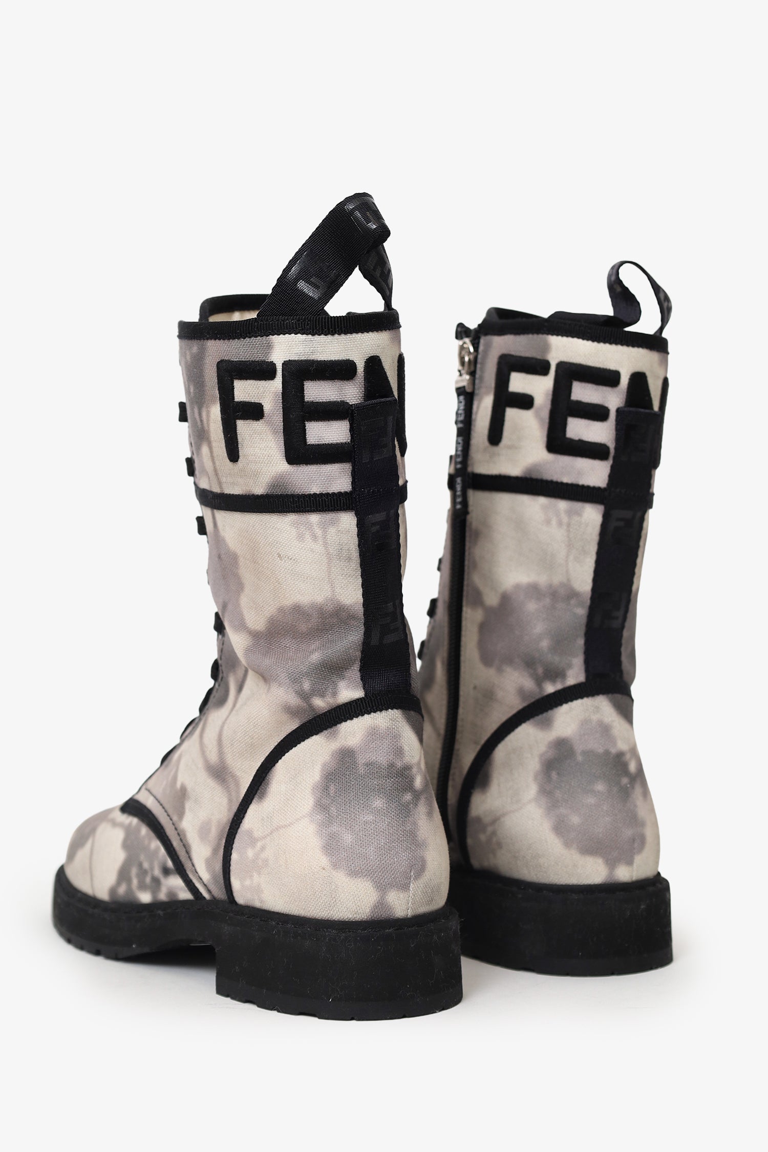 Fendi White/Grey Canvas Printed Combat Boots. Pull-on. Round toe. Rear pull tabs. Side zip closure. Front laces. Contrast stitching.