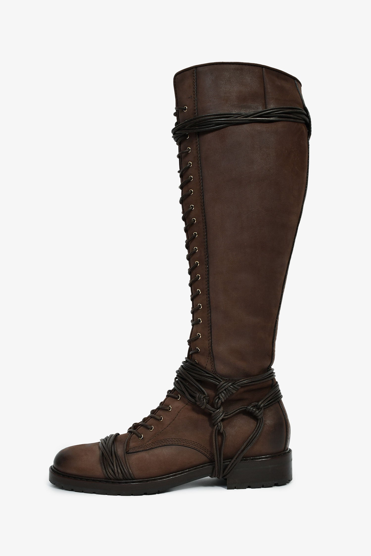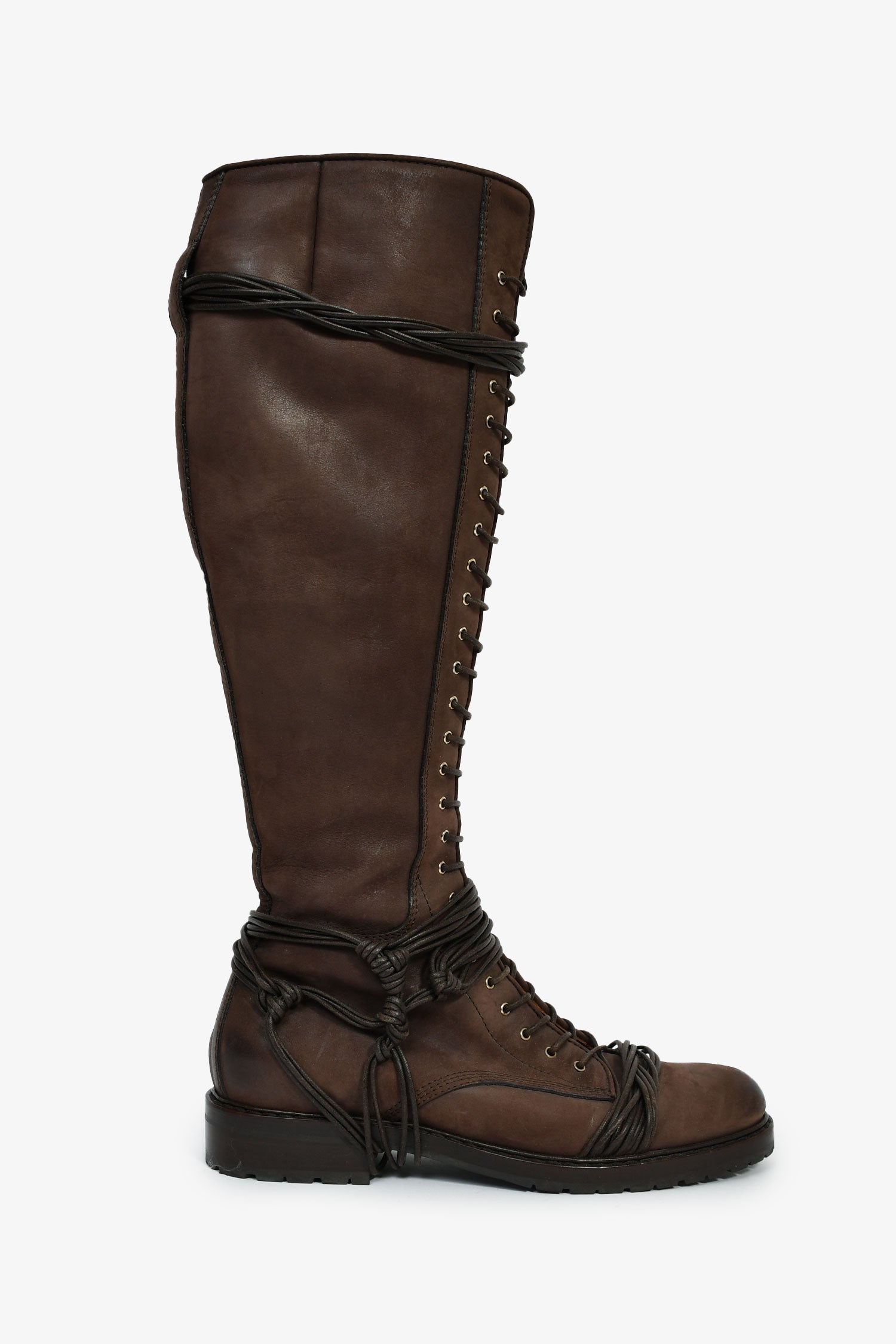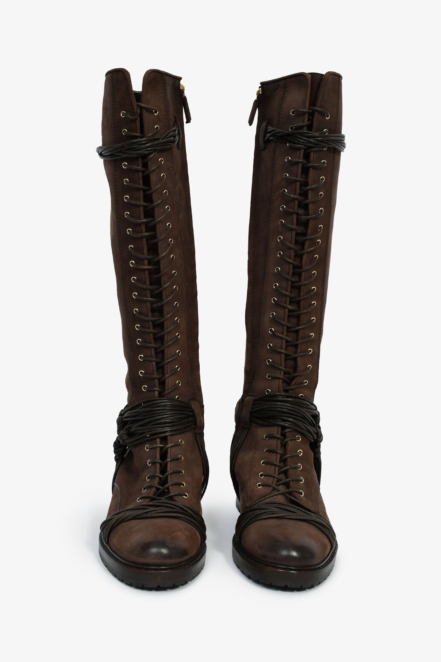 Givenchy Brown Leather Lace-Up Knee High Boots. Pull-on. Round toe. Side zip closure. Tonal stitching.