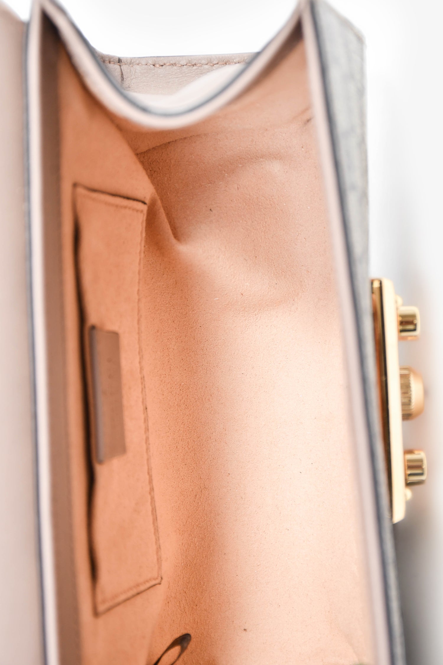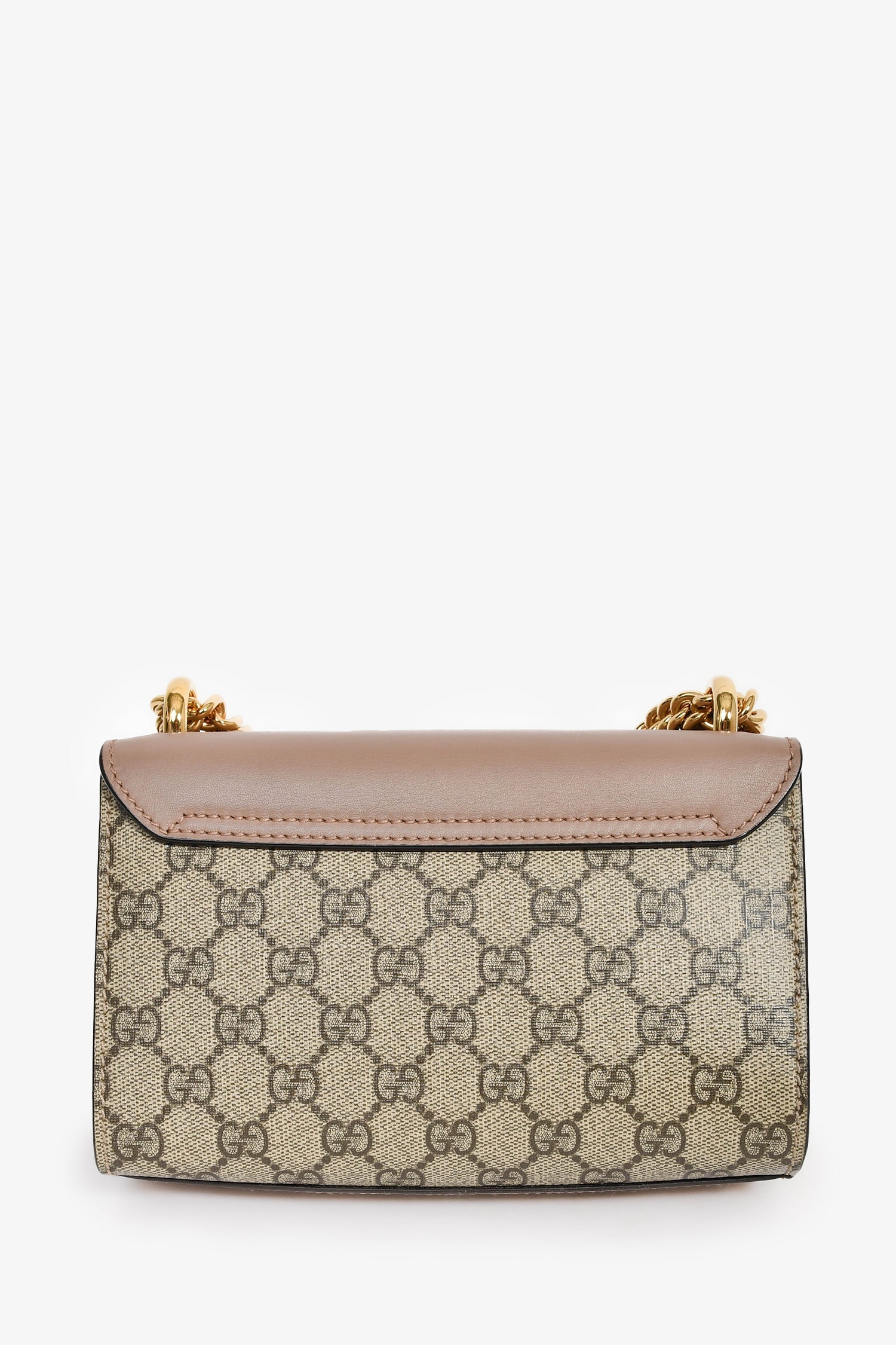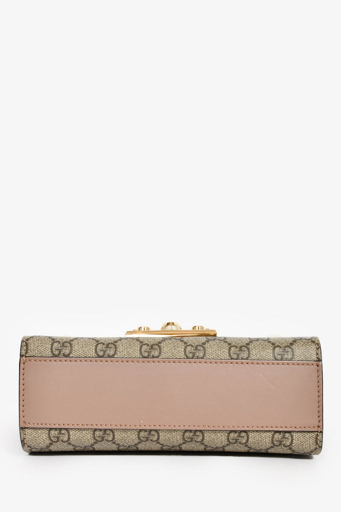 Gucci Beige GG Supreme Pearl Small Padlock Chain Shoulder Bag. Front fold-over flap with pinch-lock closure. Slide-around chain strap. Suede-lined interior. Single interior wall slip pocket. Detachable clochette. Gold-tone hardware. Tonal stitching.