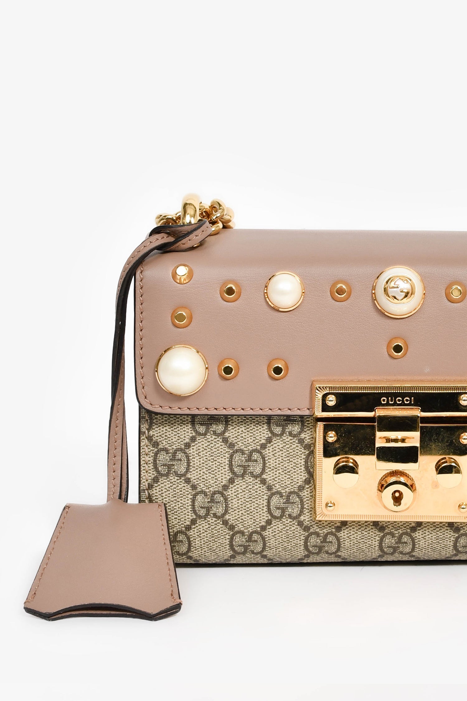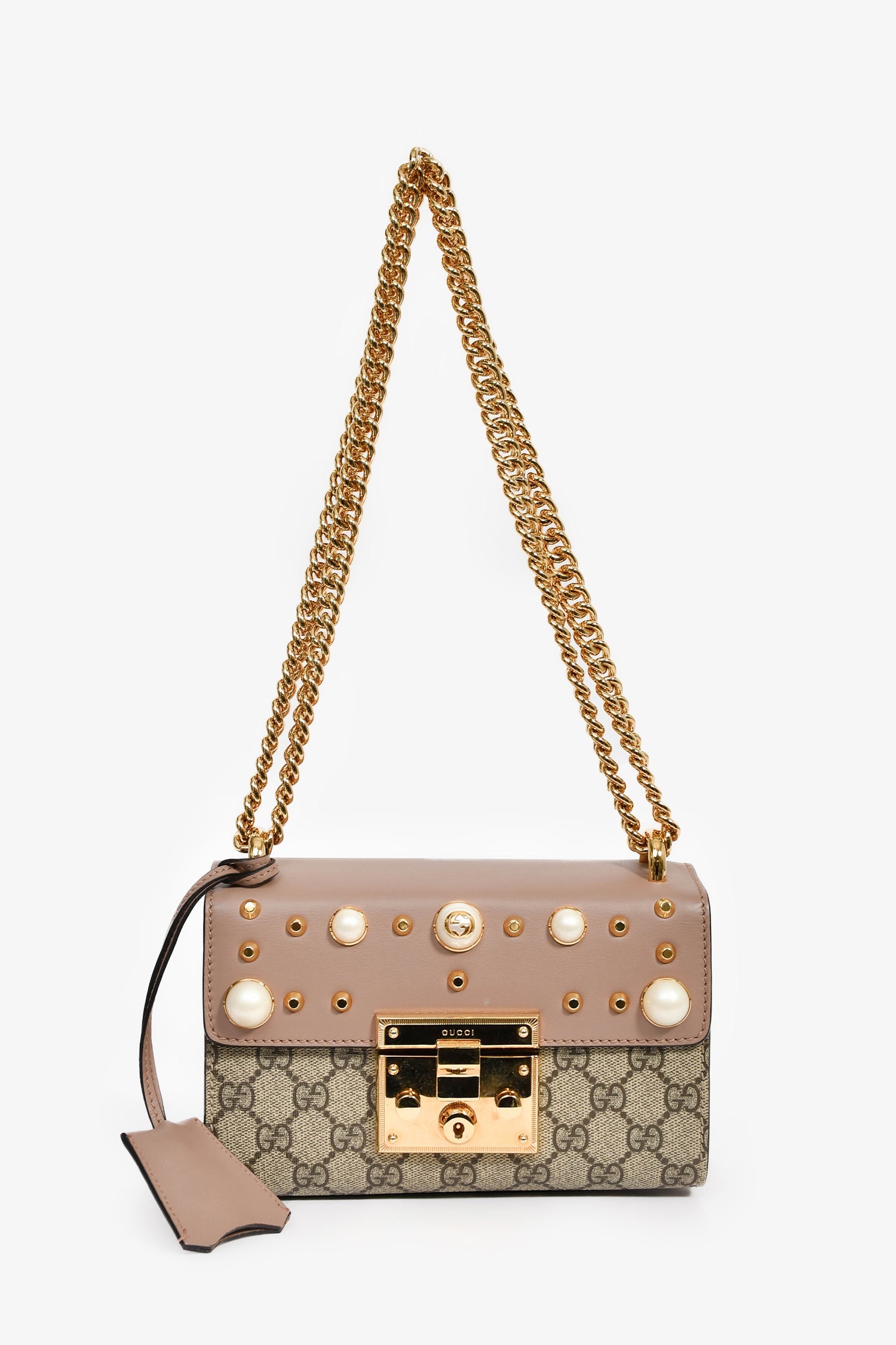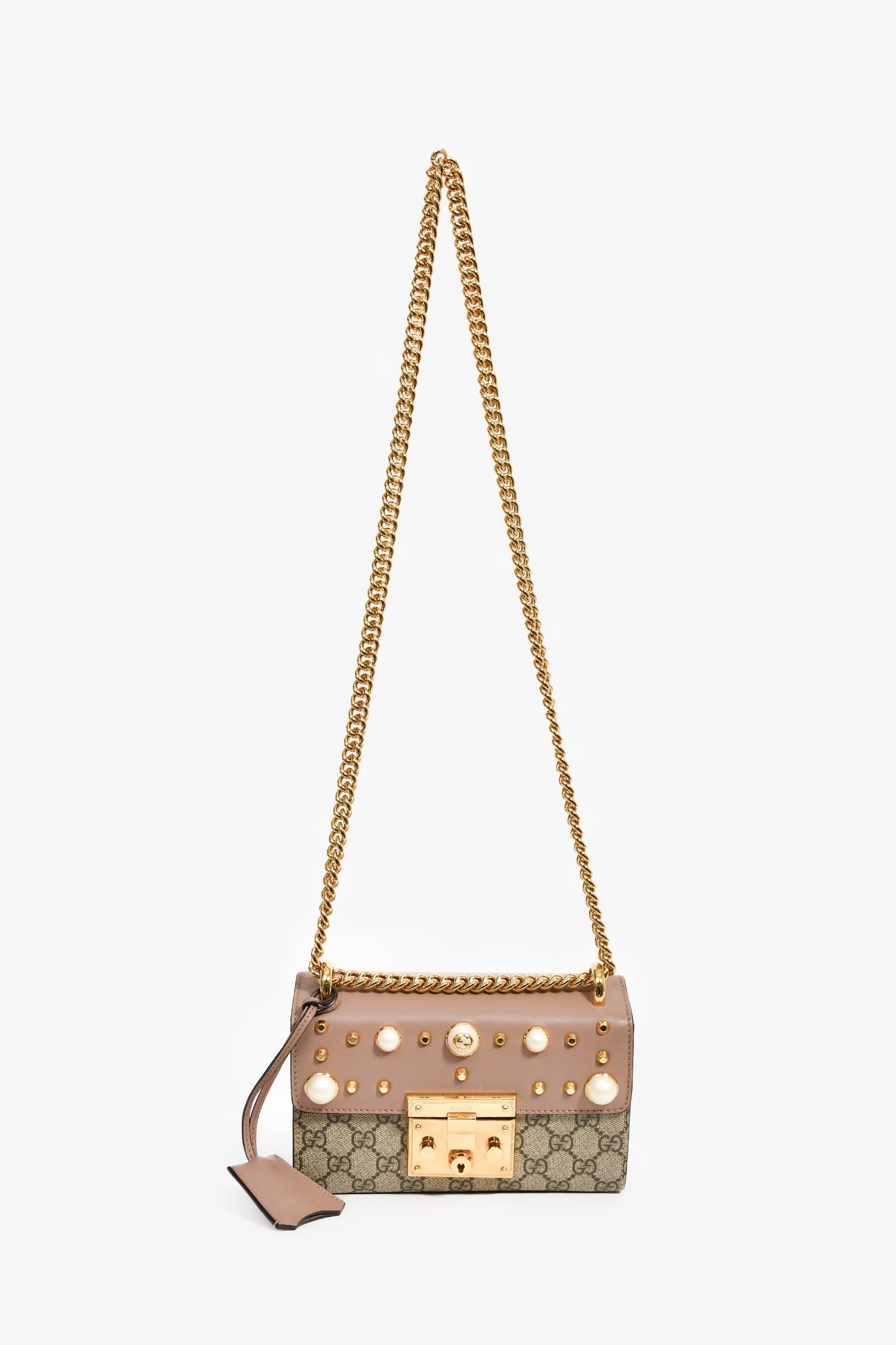 Gucci Beige GG Supreme Pearl Small Padlock Chain Shoulder Bag