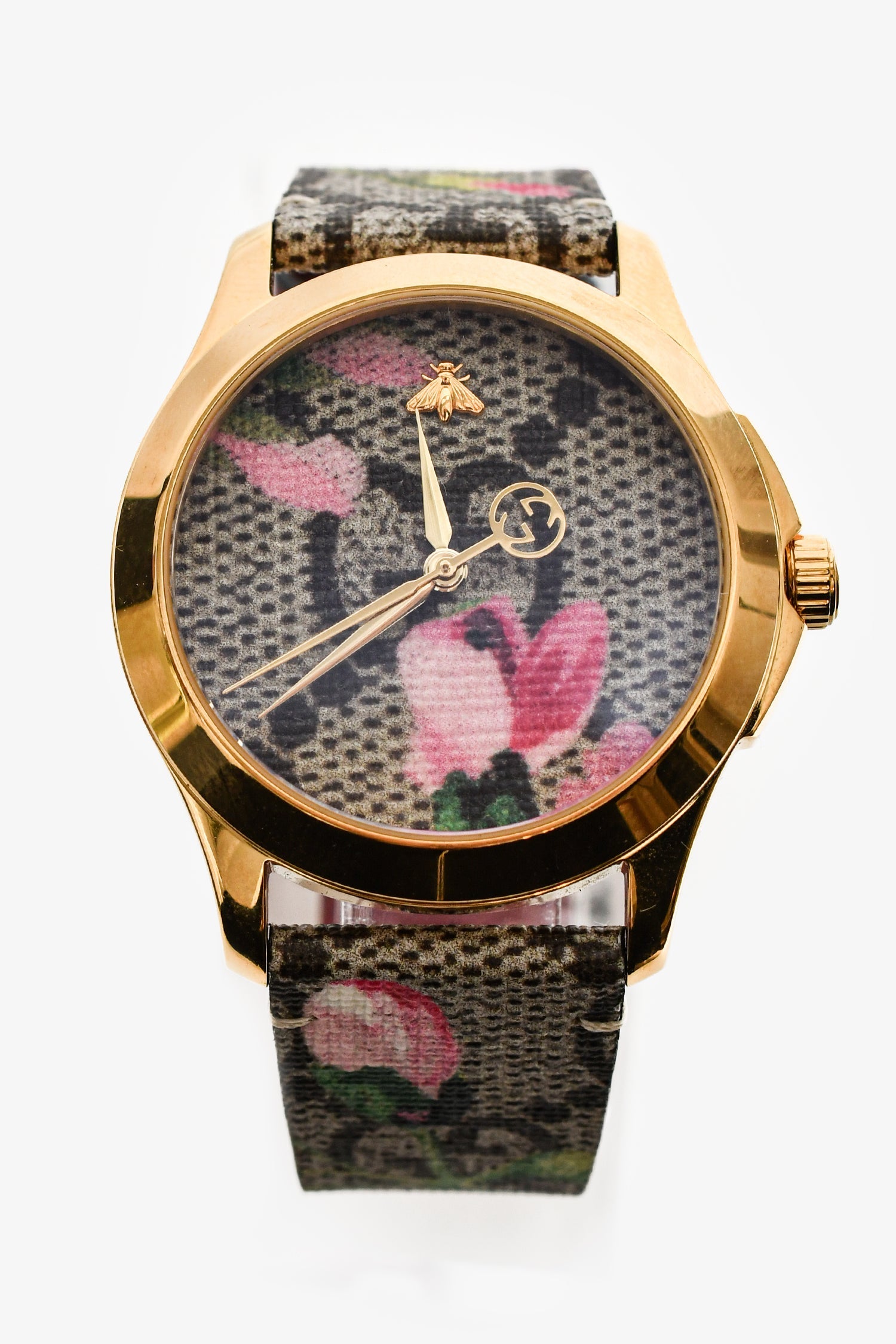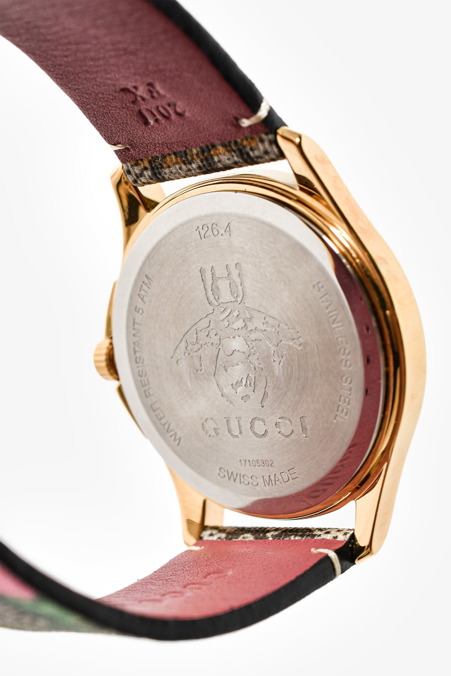 Gucci Beige Multicolour G-Timeless Watch. Pin buckle closure. Gold-tone hardware. Stainless Steel. Adjustable leather straps. Tonal stitching.