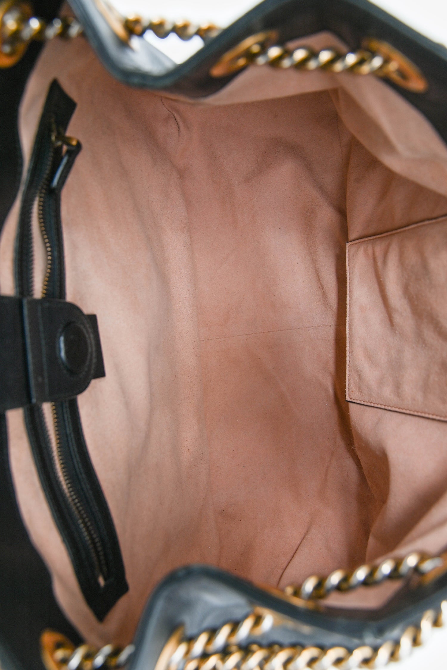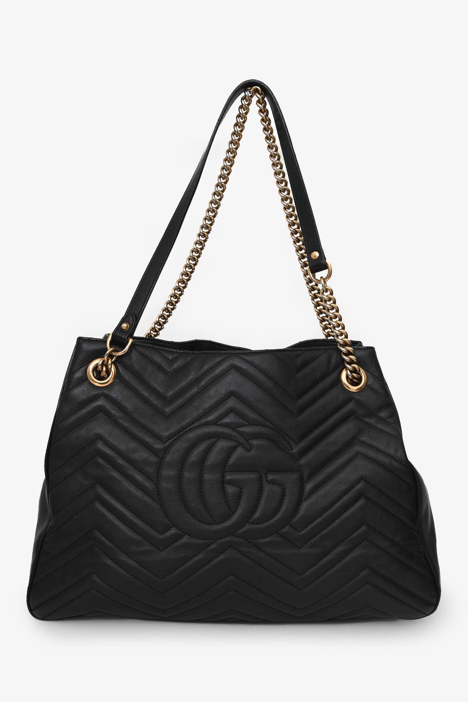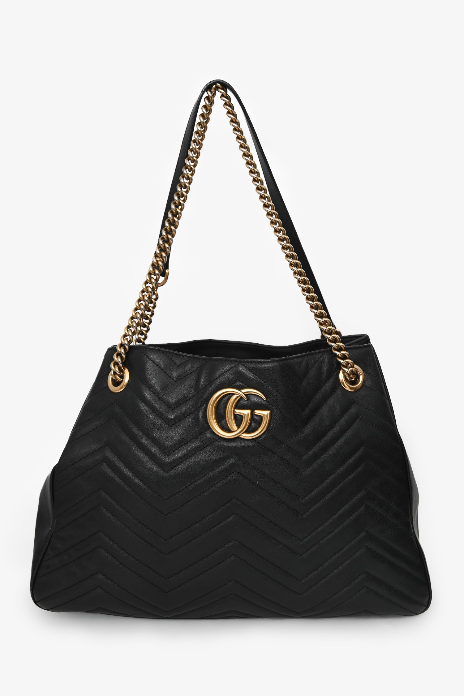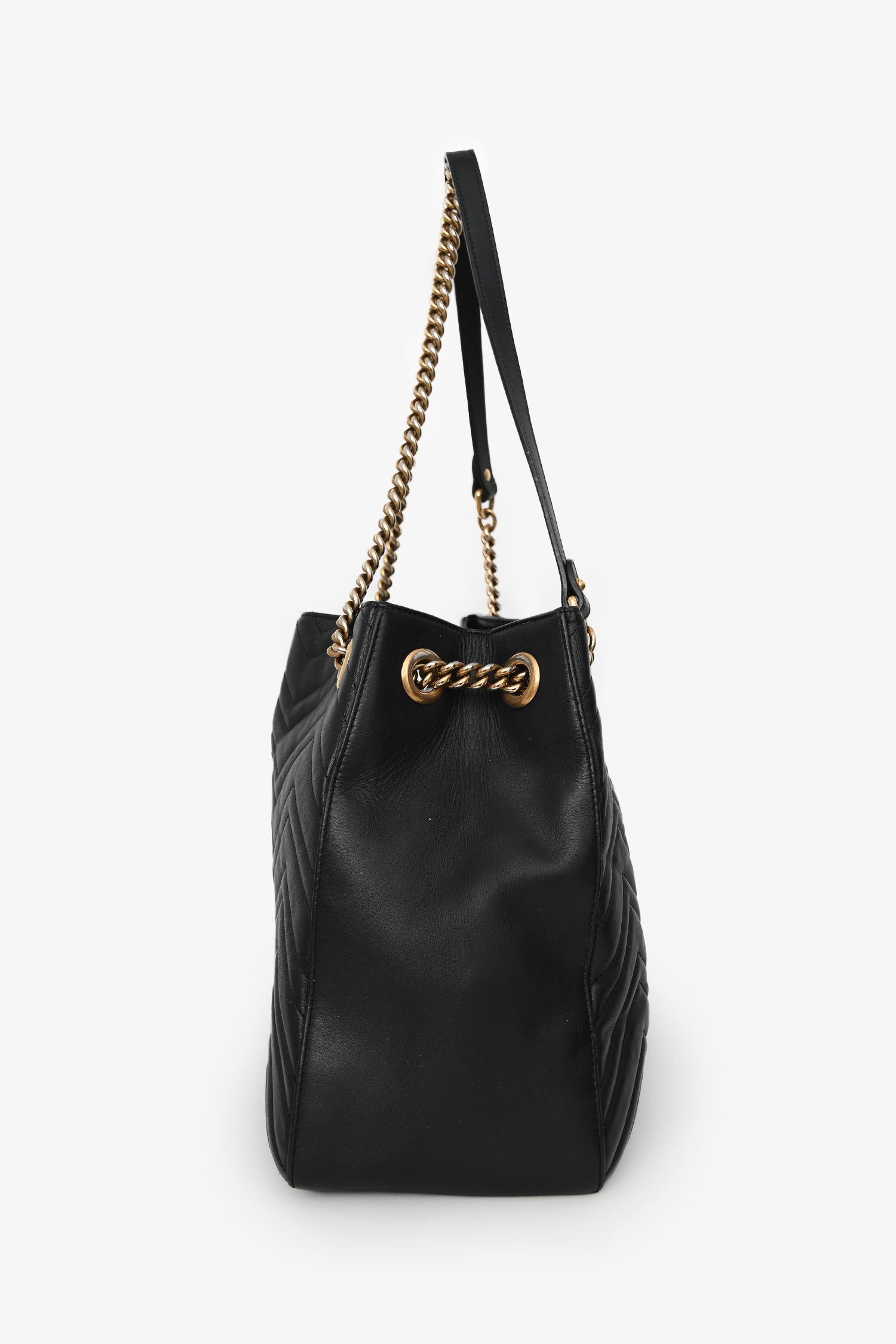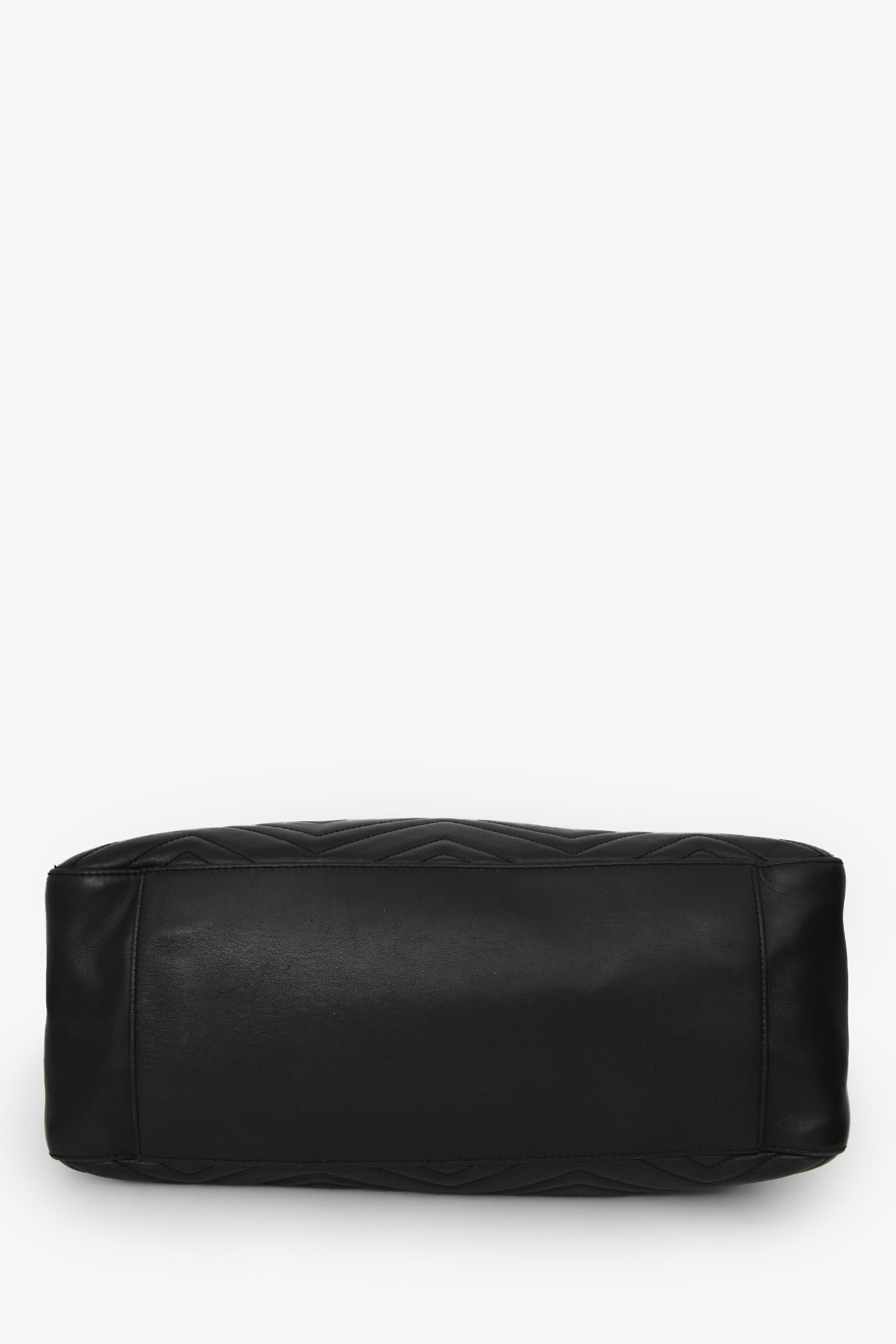 Gucci Black Chevron Leather Marmont Tote Bag. Open interior with a concealed magnetic strap. Chain-link shoulder straps. Lined suede interior with 1 zip and 2 card slots. Gold-tone hardware. Tonal stitching.