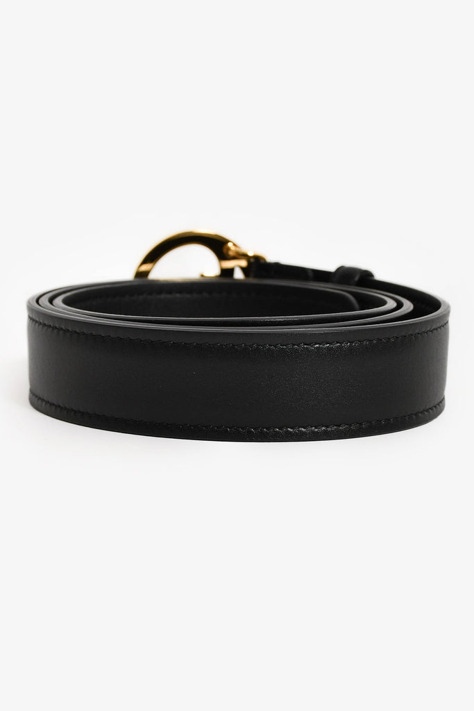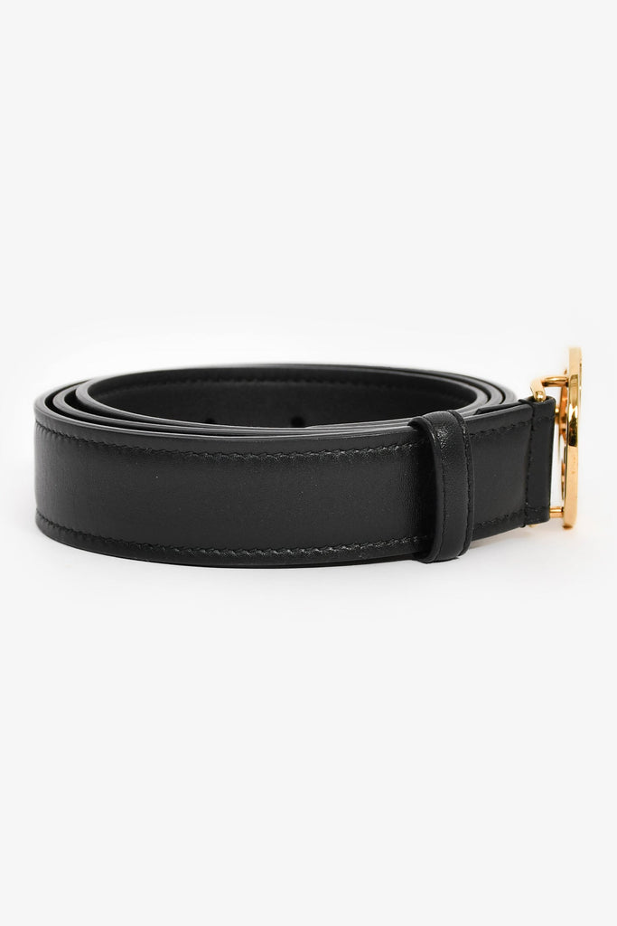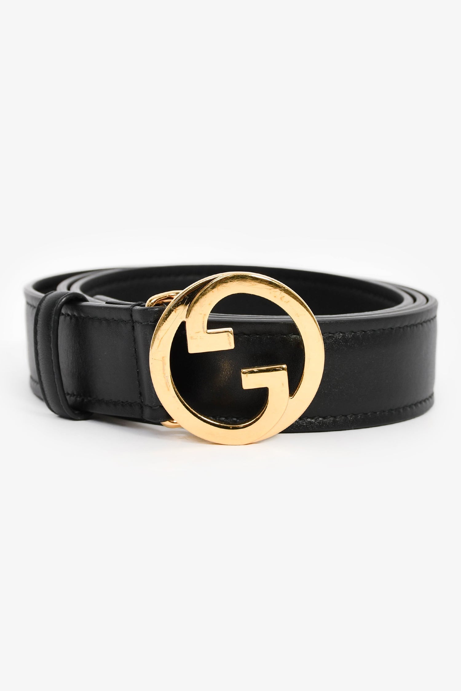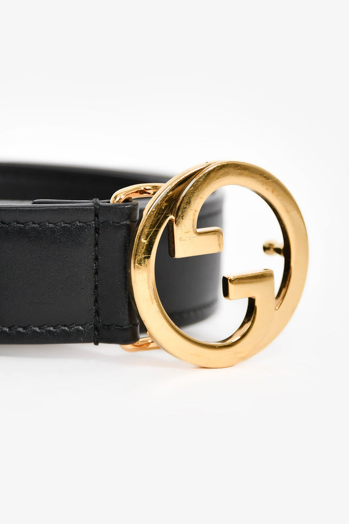 Gucci Black Leather GG Interlocking Belt. Adjustable push-tab closure. Gold-tone hardware. Tonal stitching.