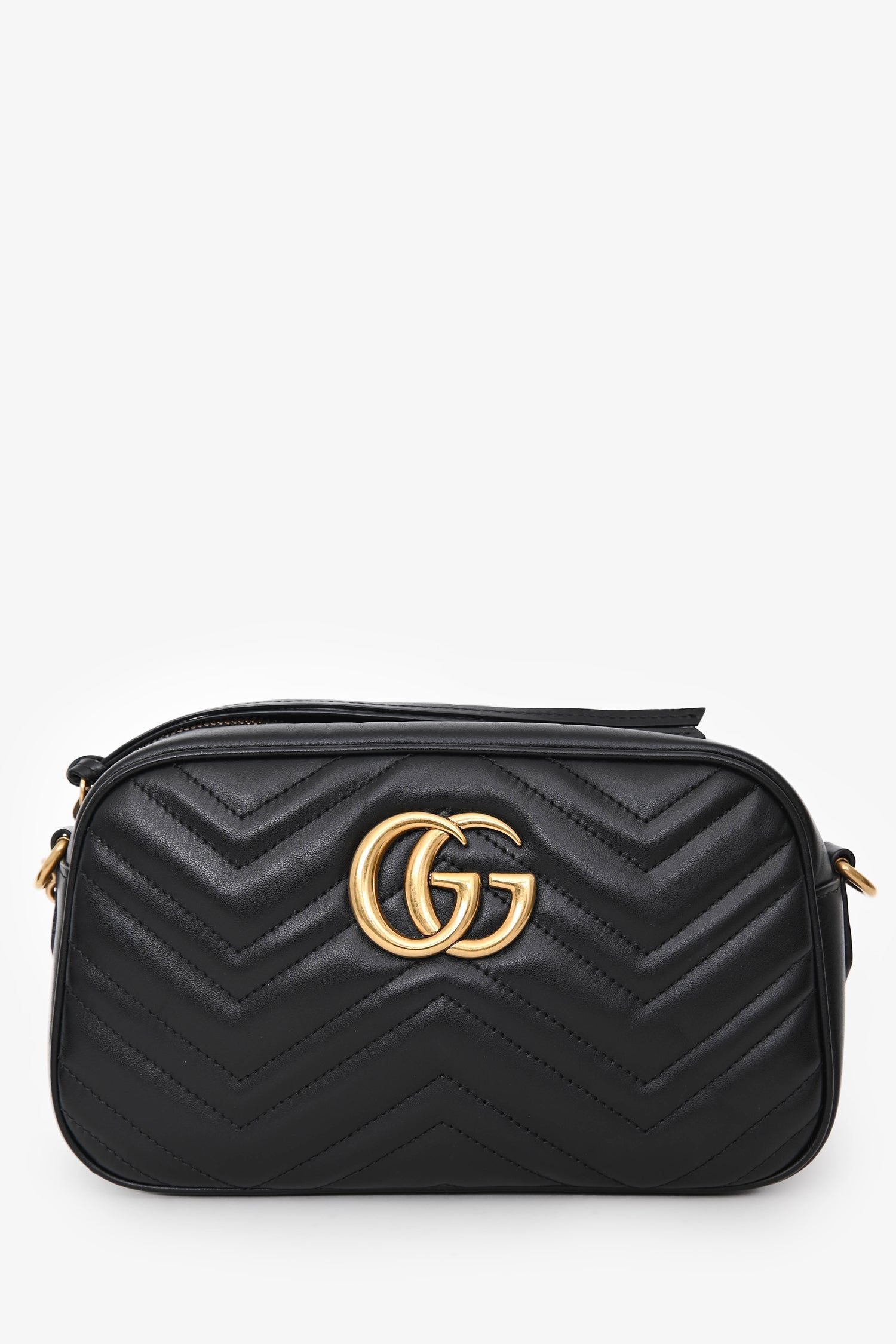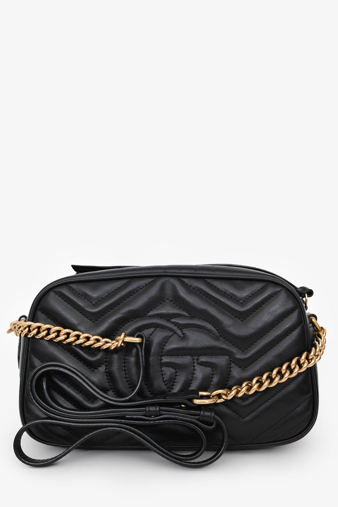 Gucci Black Leather GG Marmont Small Camera Crossbody Bag. Top zipper. Leather and chain-link crossbody strap. Suede-lined interior with a slip compartment. Gold-tone hardware. Tonal stitching.