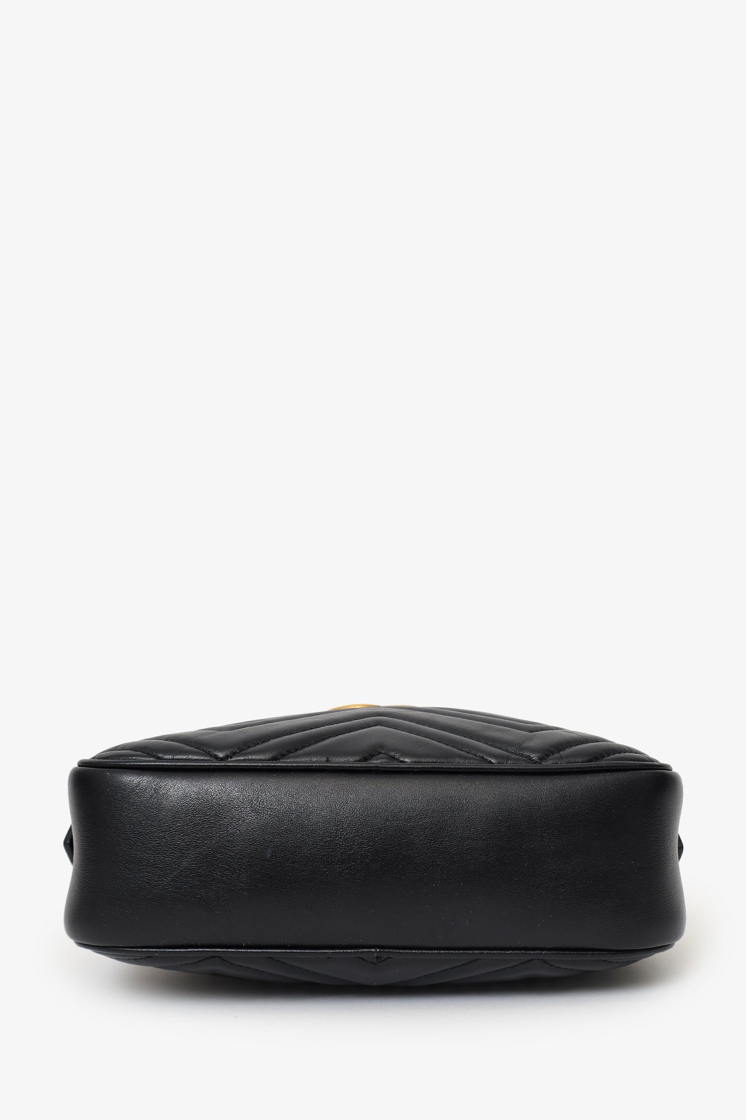Gucci Black Leather Marmont Matelasse Camera Bag. Top zip closure. Adjustable crossbody strap. Lined interior with single rear slip pocket. Gold-tone hardware. Tonal stitching.