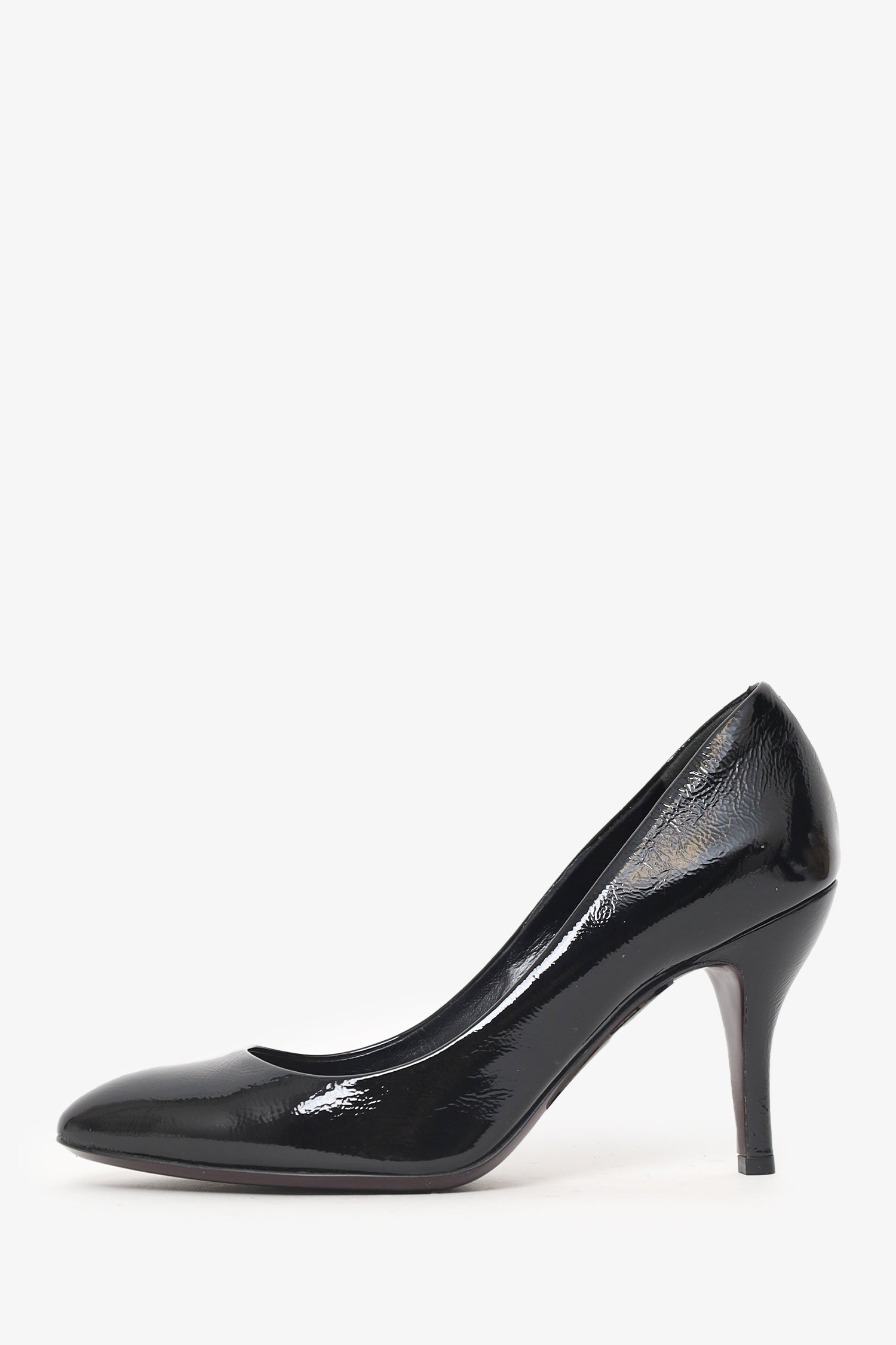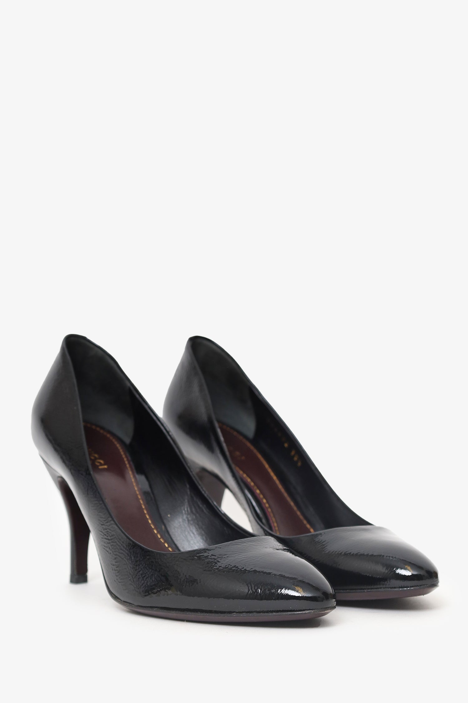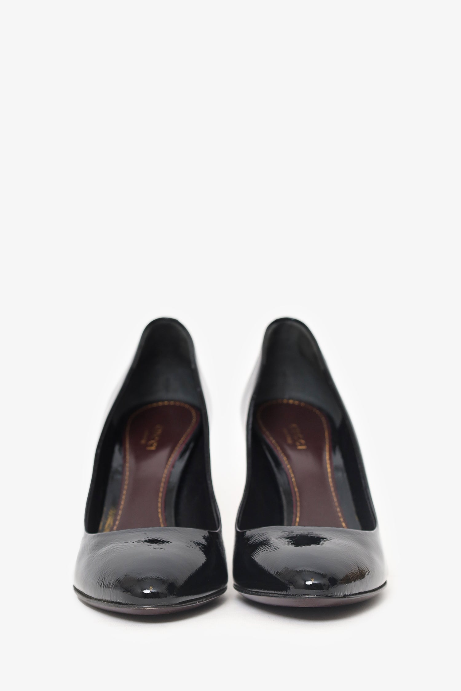 Gucci Black Patent Pumps. Slip-on. Rounded point-toe. Tonal stitching.