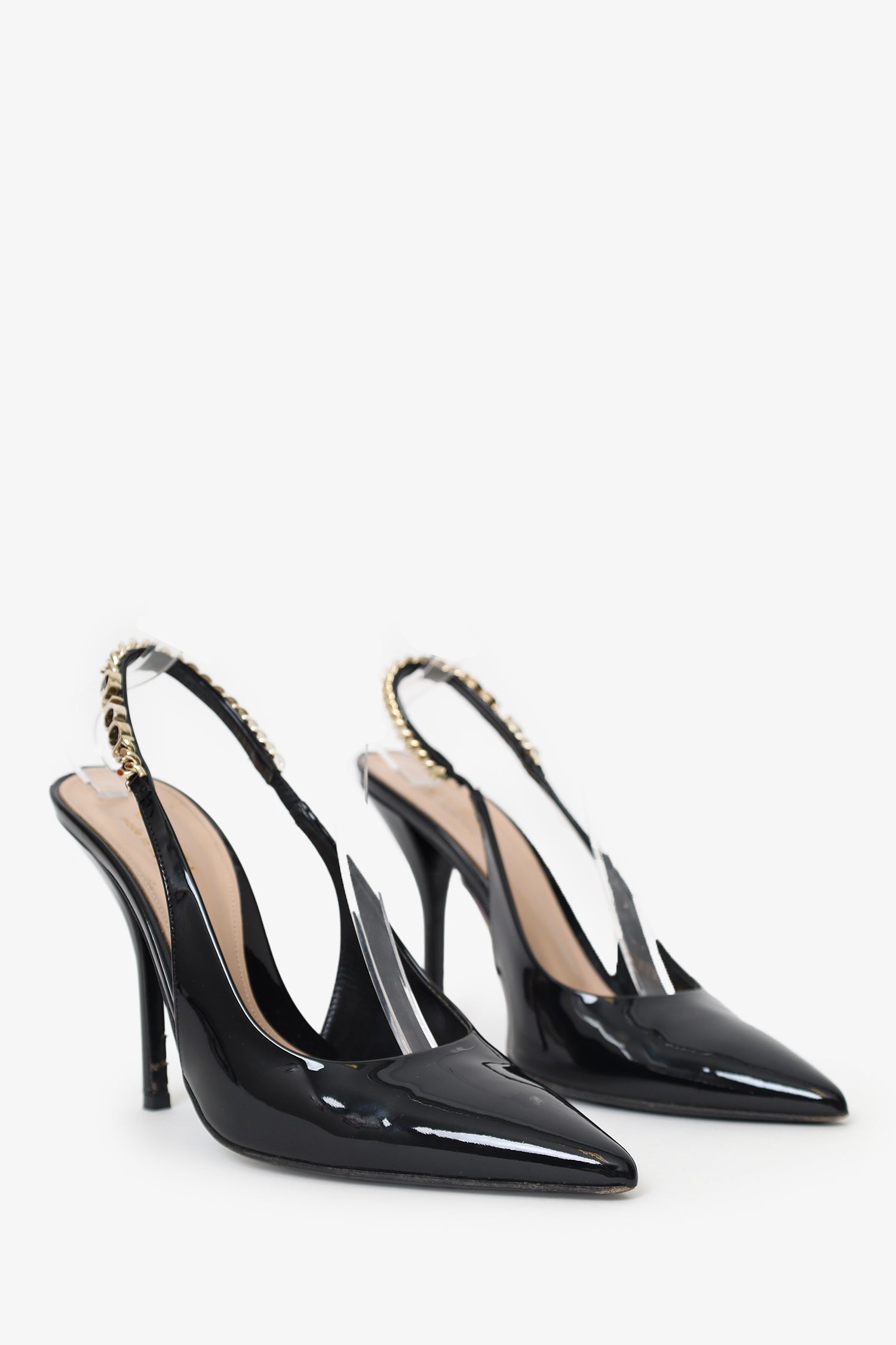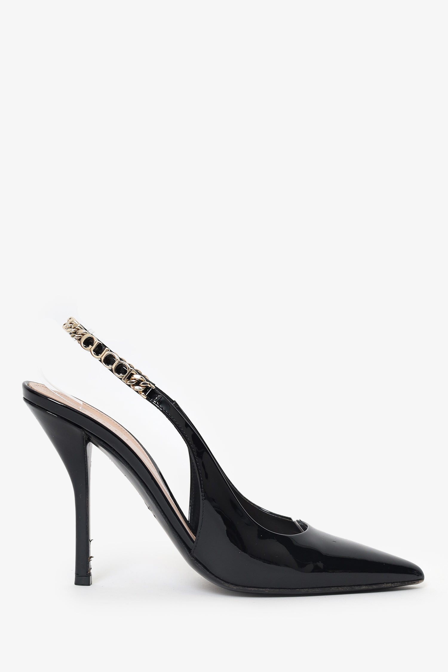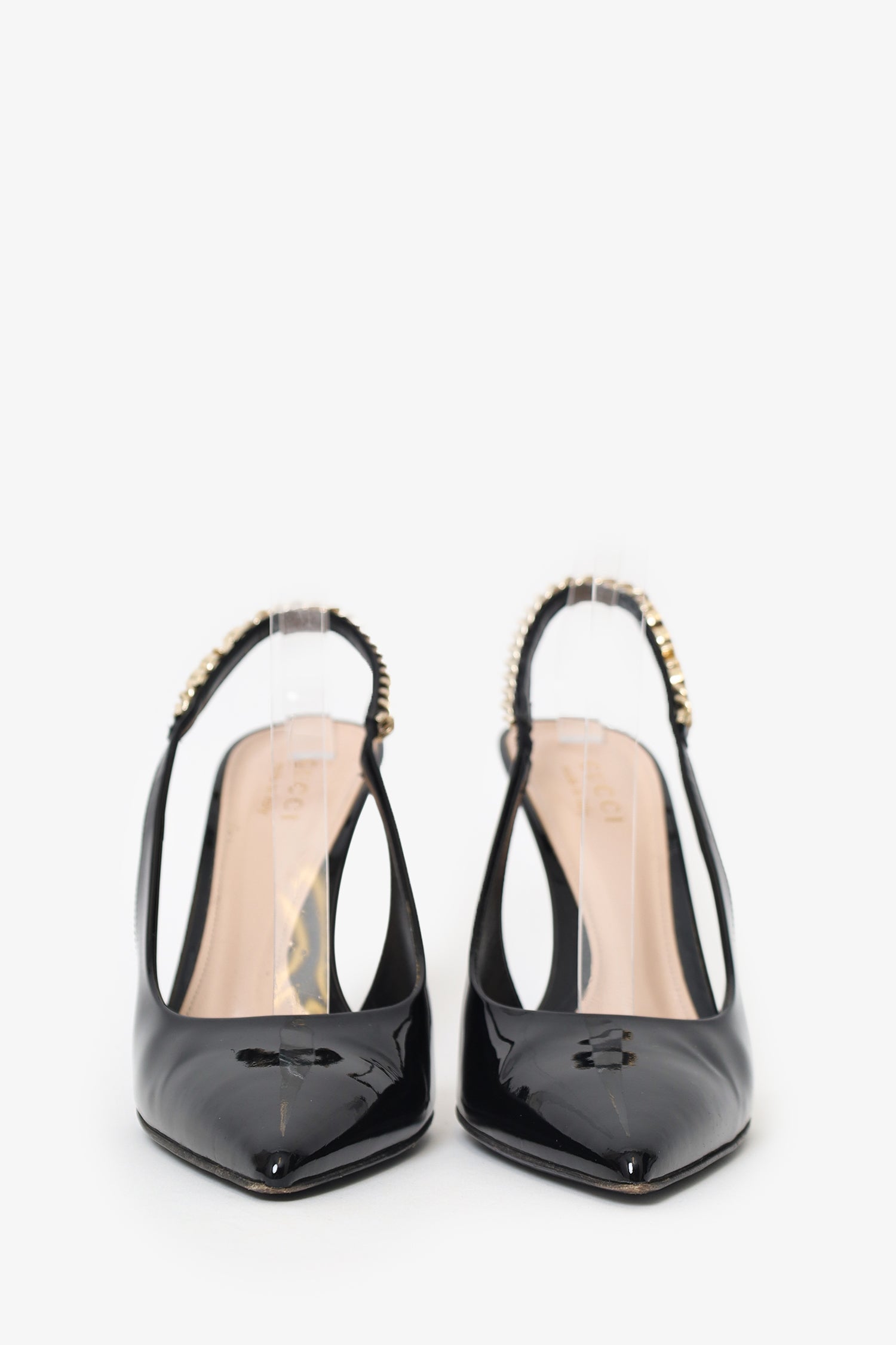 Gucci Black Patent Signoria Pumps. Slip-on. Pointed toe. Lined interior. Gold-tone hardware. Tonal stitching.
