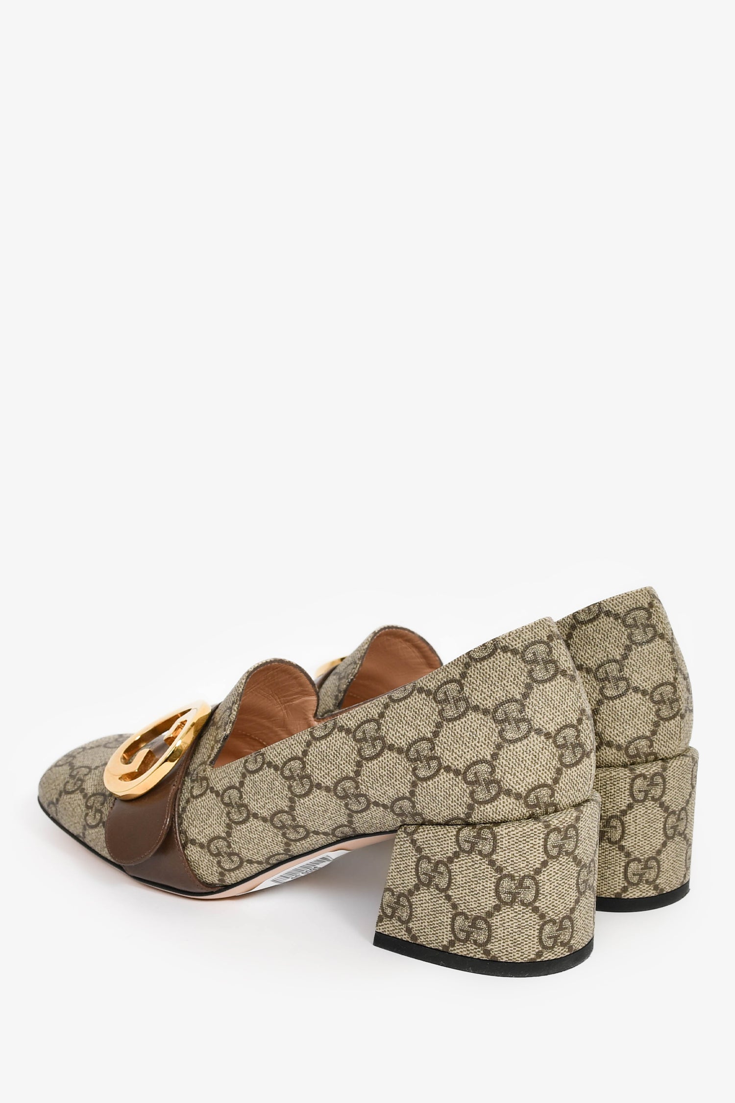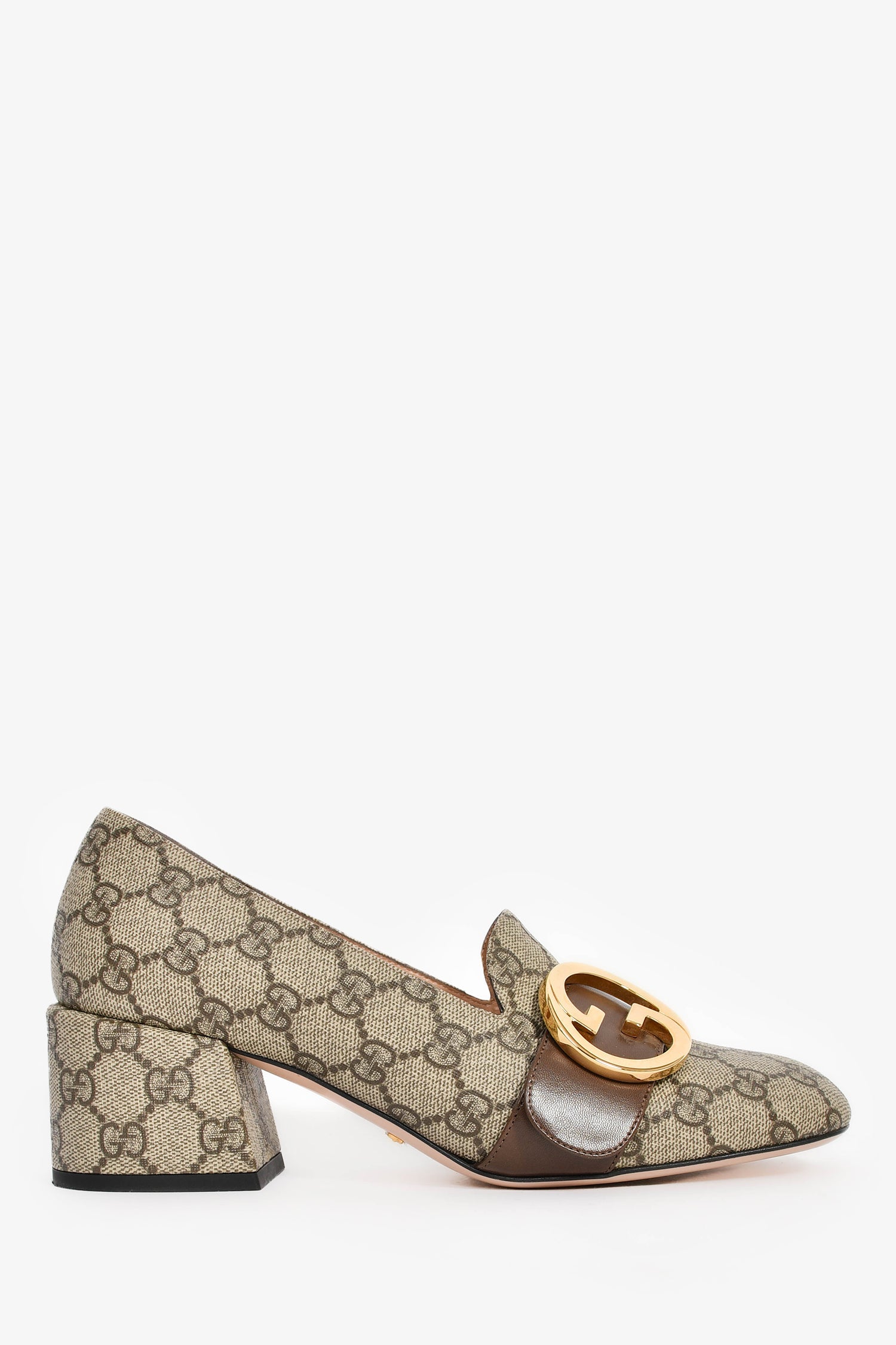Gucci Brown 'GG' Monogram Pumps with Leather Buckle. Slip-on. Square toe. Block heel. Leather interior. Gold-tone hardware. Tonal stitching.