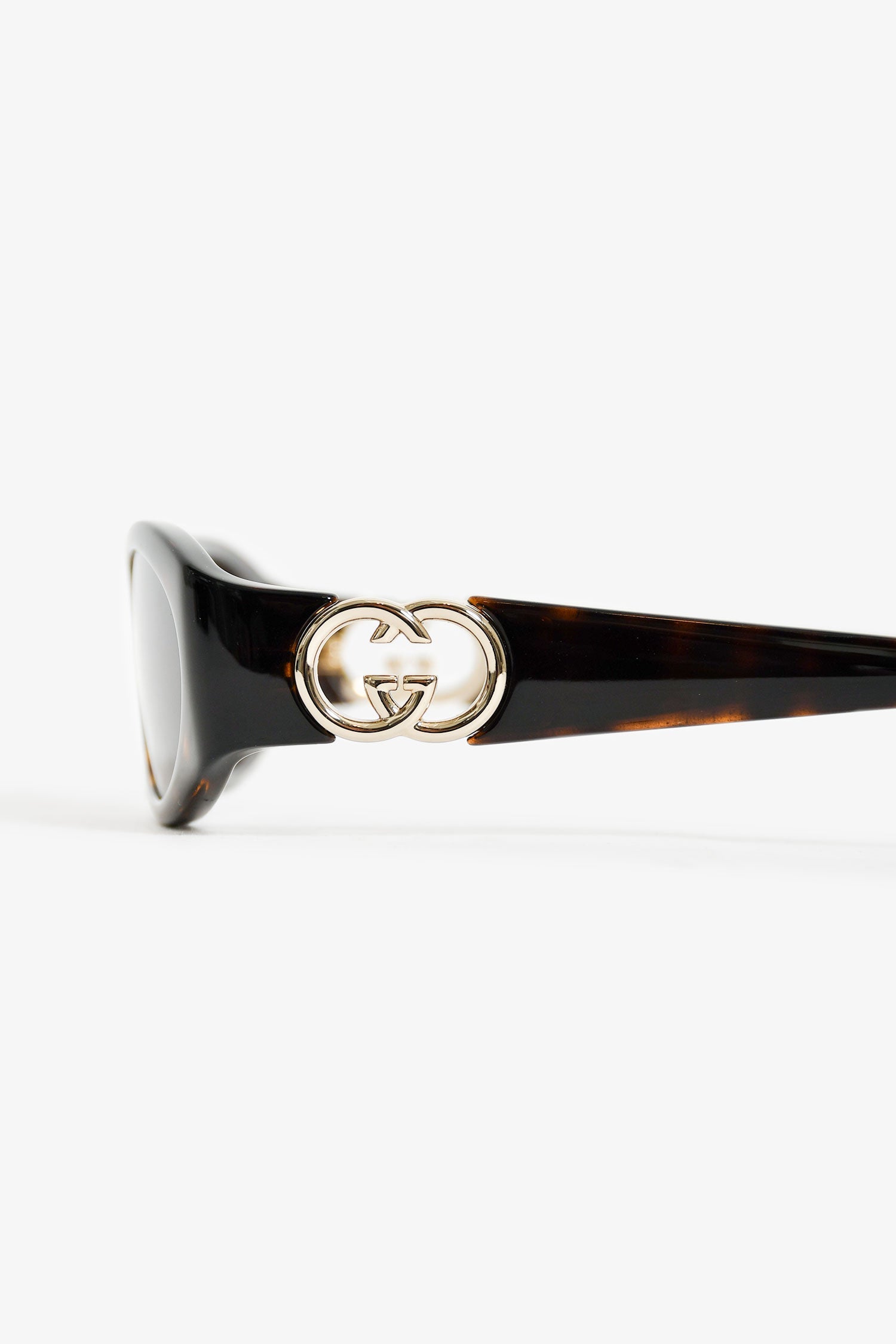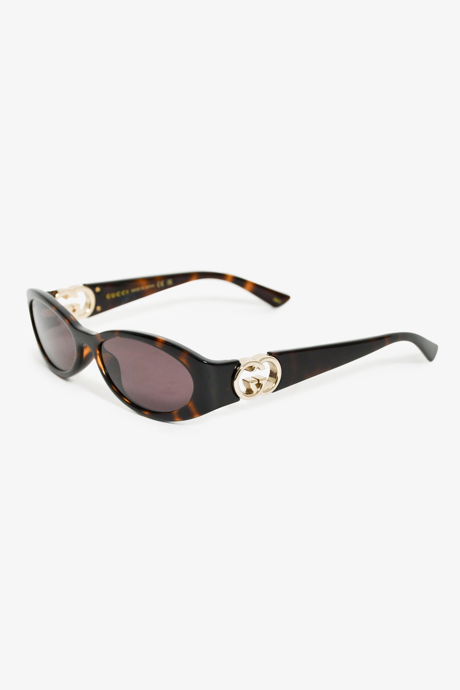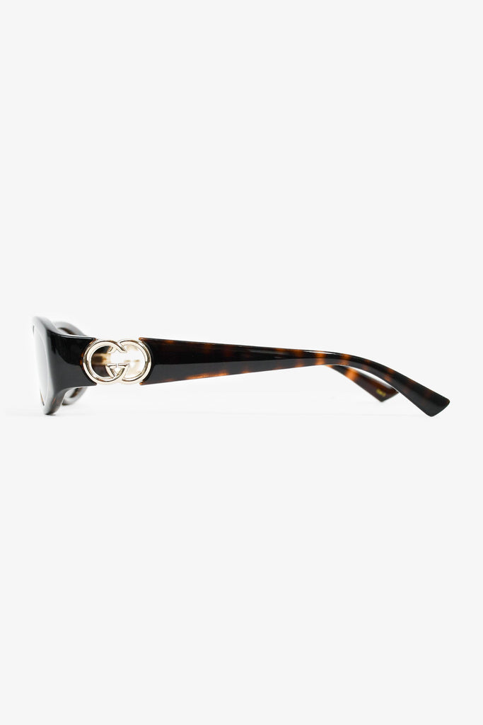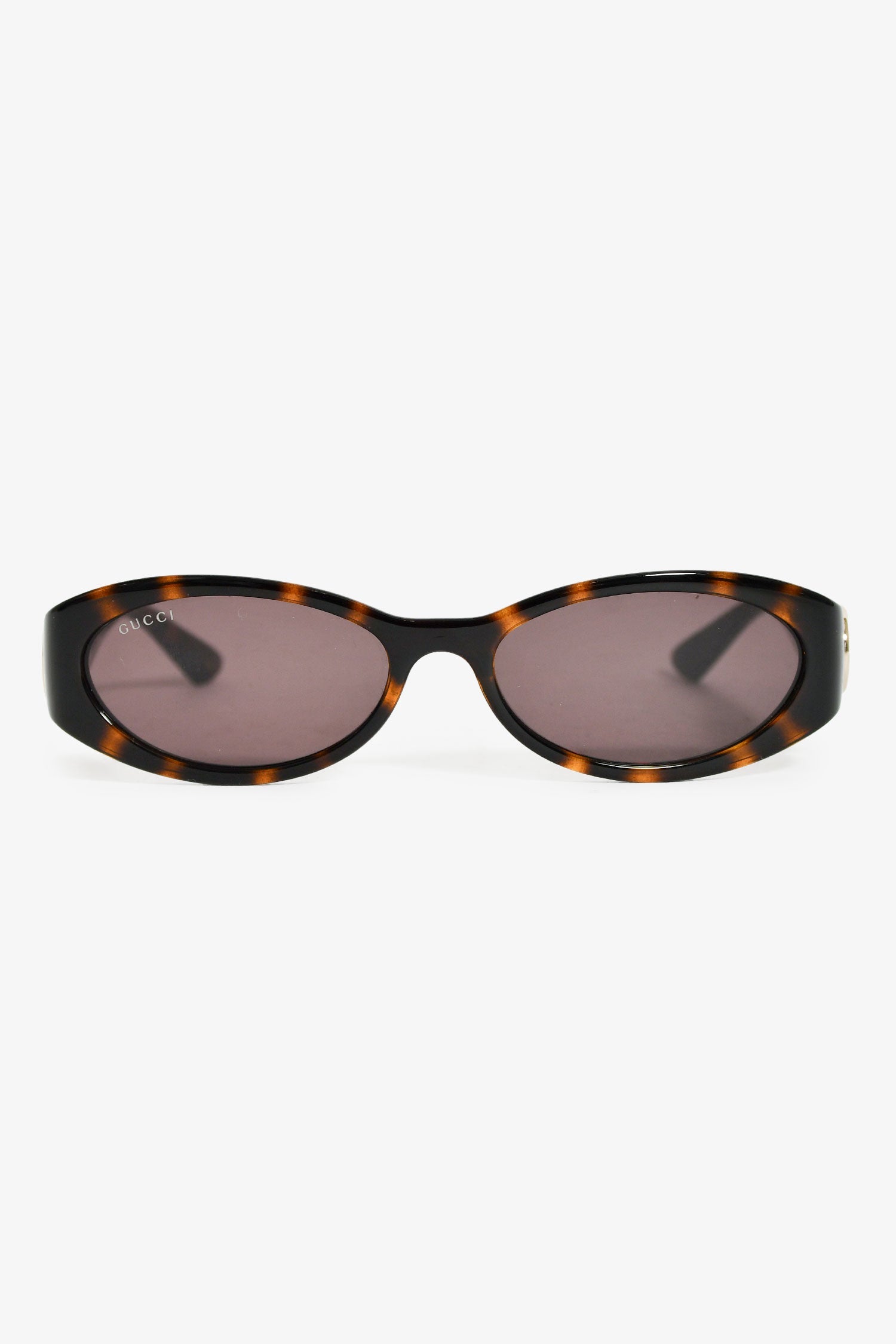 Gucci Brown Tortoise Acrylic Slim GG Sunglasses. Built-in nose pads. Gold-tone hardware.