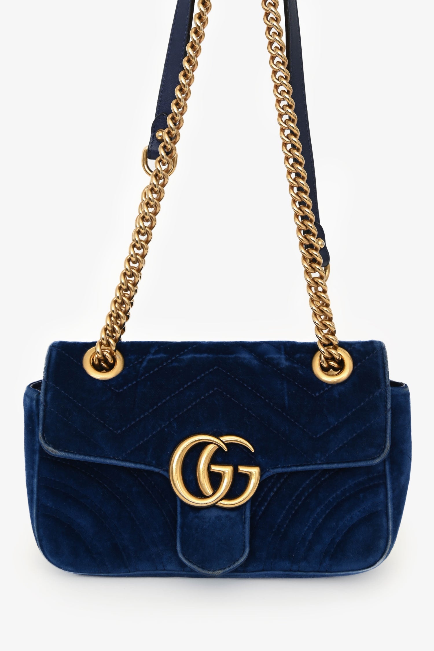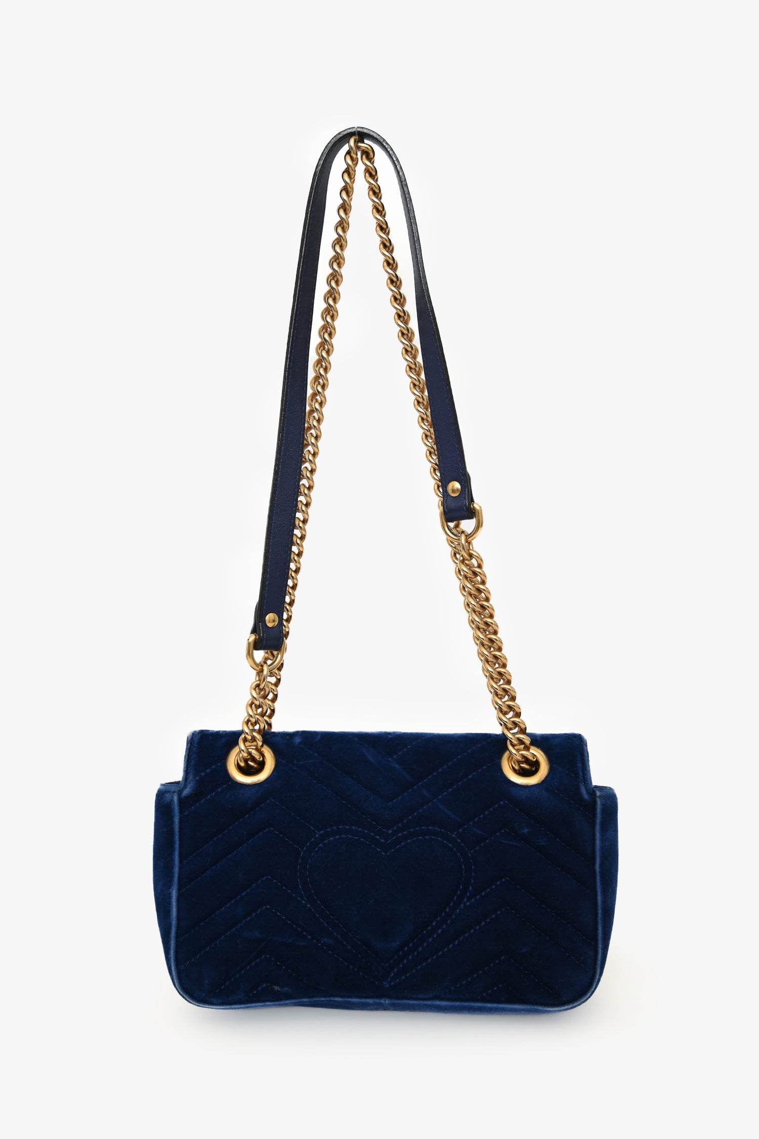 Gucci Cobalt Blue Velvet Mini Marmont Shoulder Bag. Front fold-over flap with push-lock closure. Chain shoulder strap with leather shoulder rest. 1 interior compartment with 1 interior slip pocket. Lined interior. Gold-tone hardware. Tonal stitching.