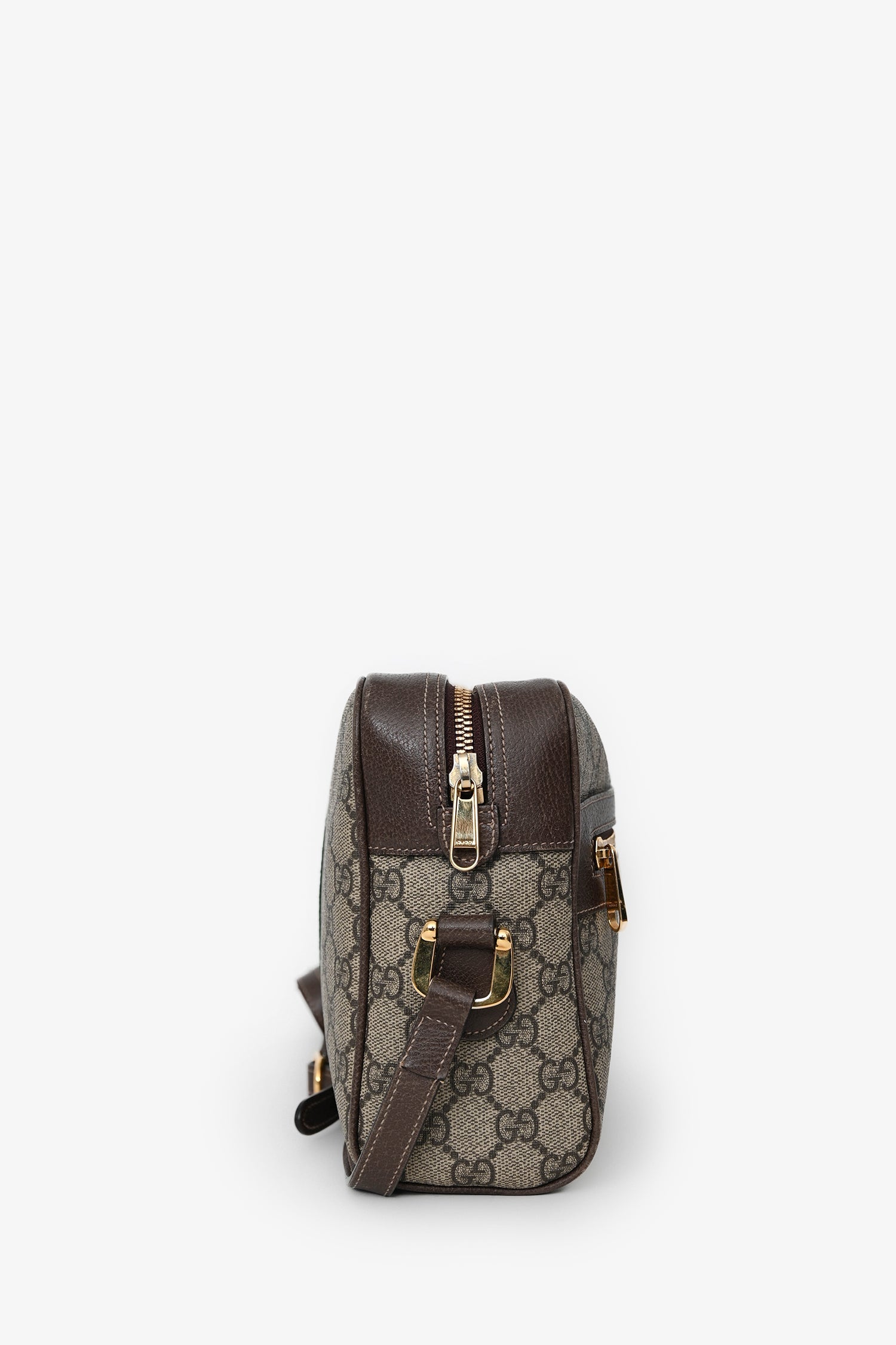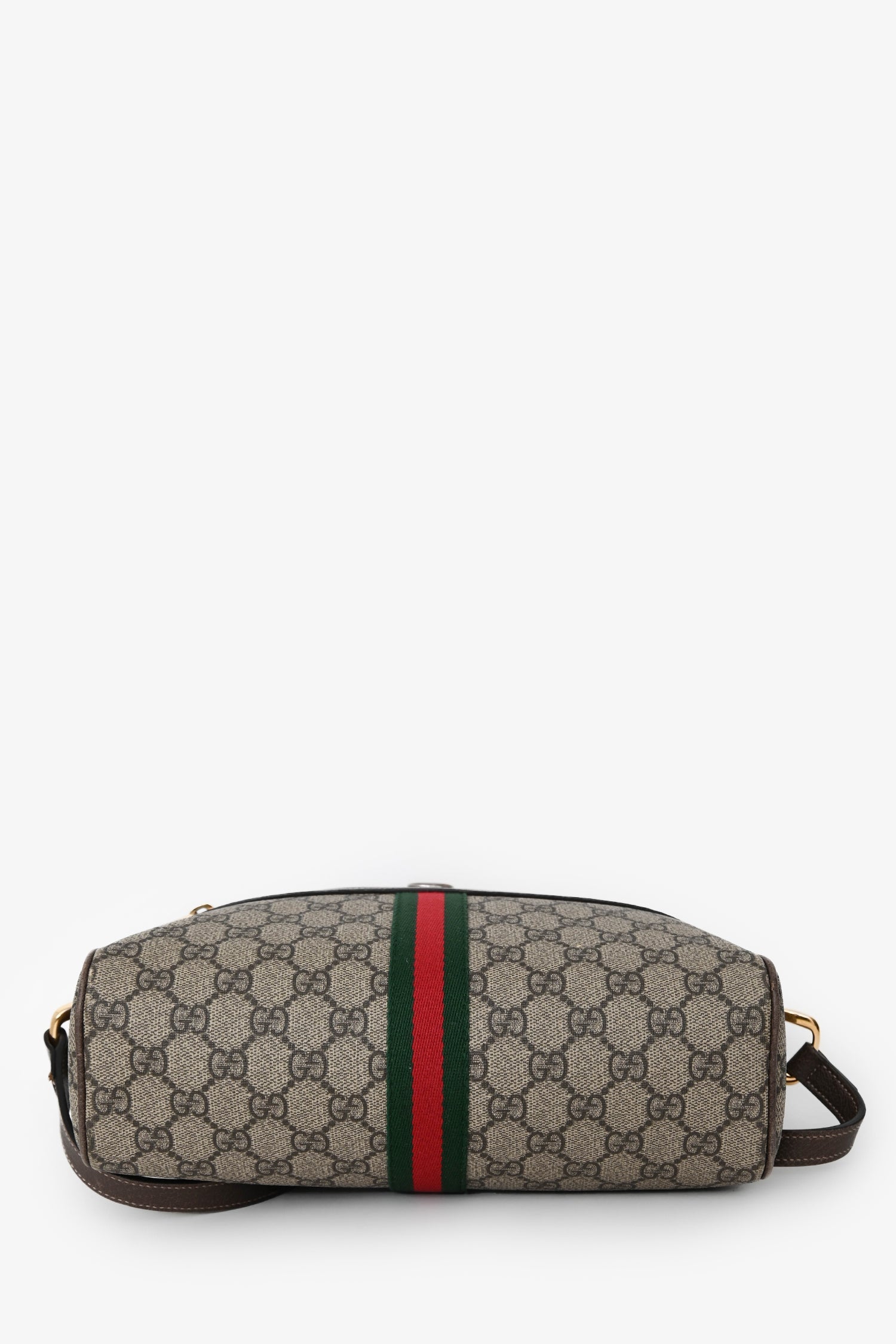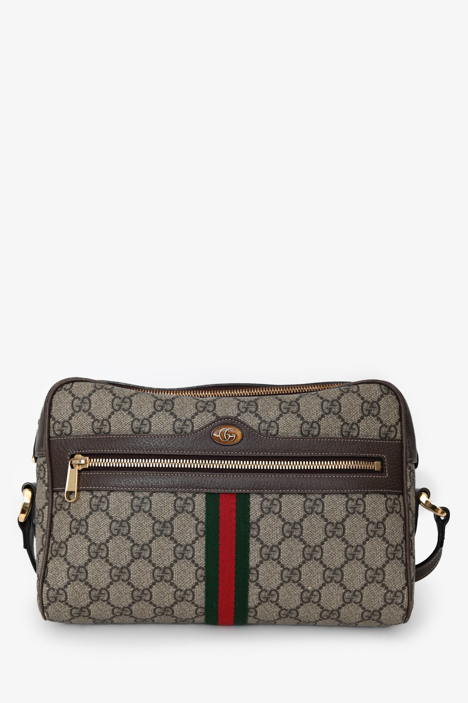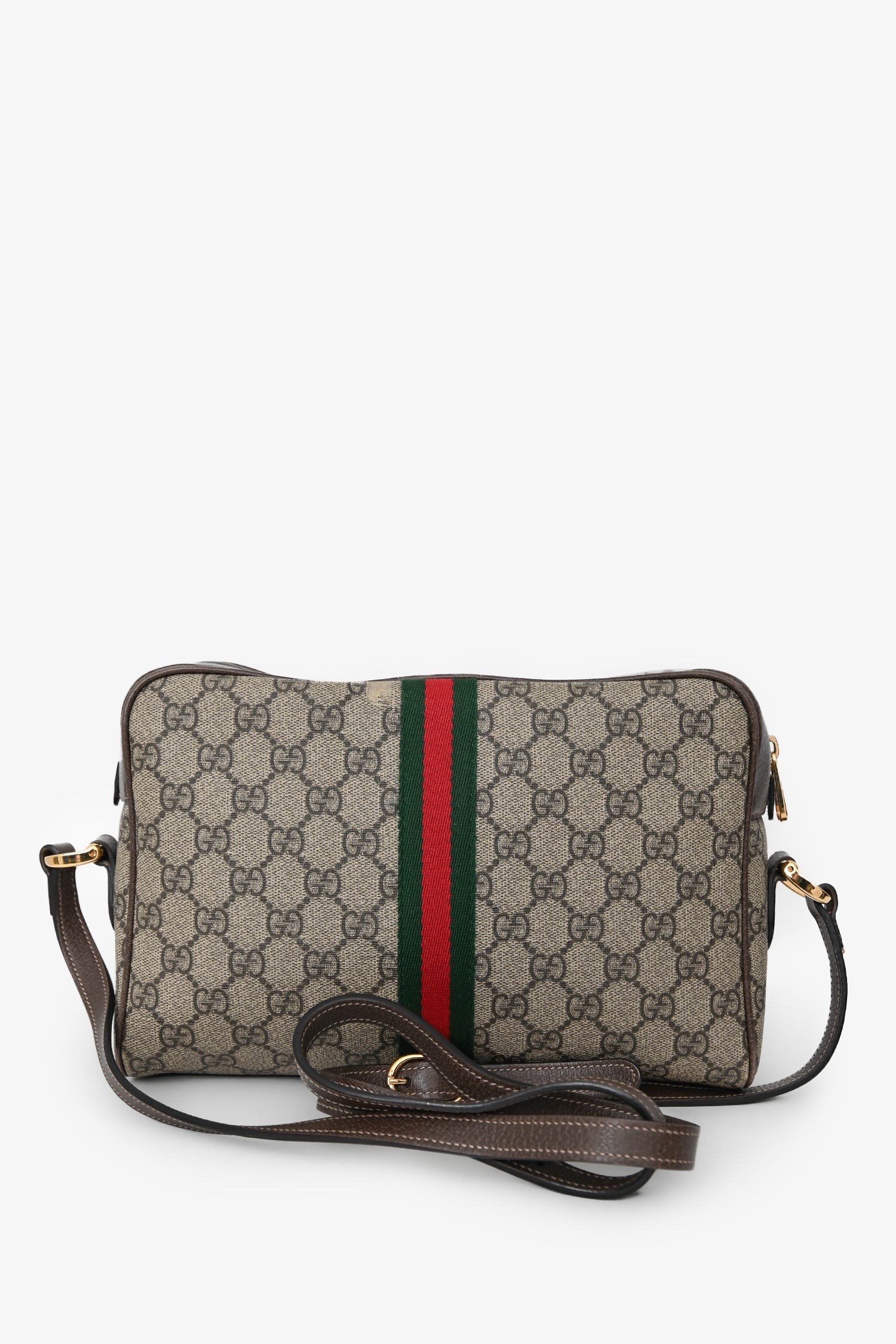 Gucci GG Supreme Ophidia Crossbody Bag. Top zip closure. Adjustable strap. Single front exterior zip pocket. Suede-lined interior. 2 interior wall pockets; 1 slip, 1 with zip closure. Gold-tone hardware. Tonal stitching.