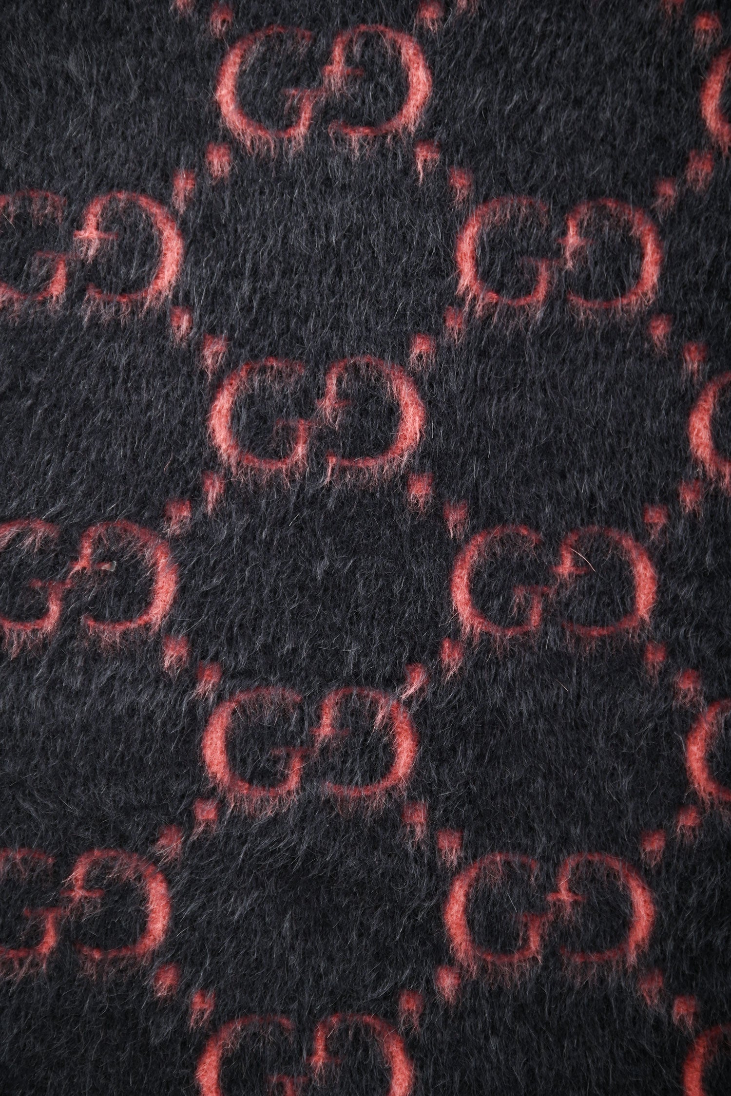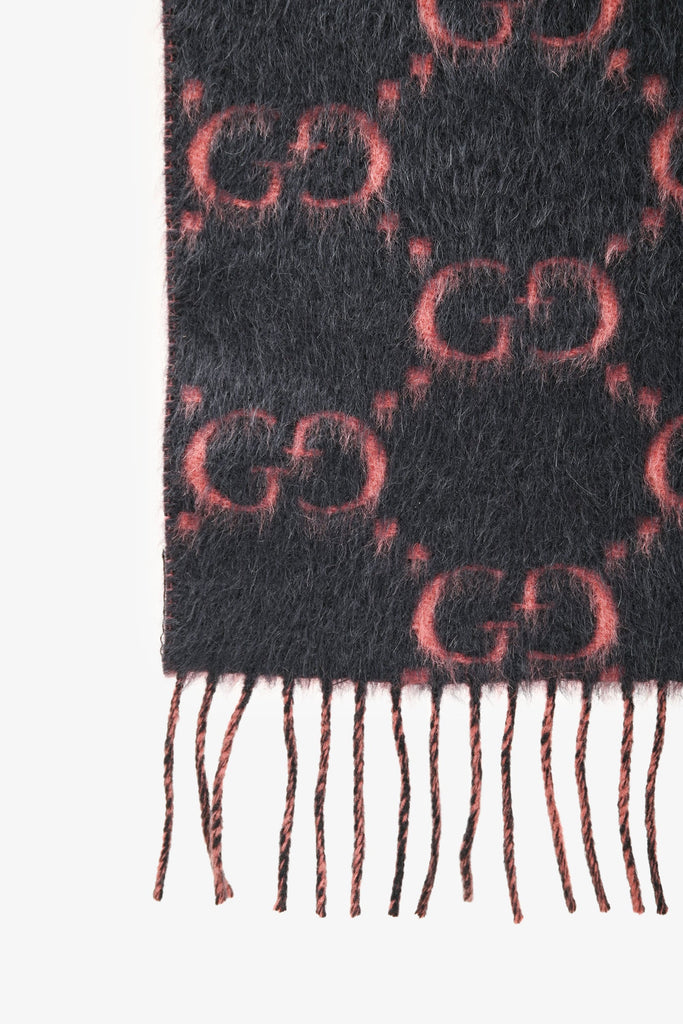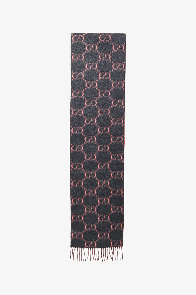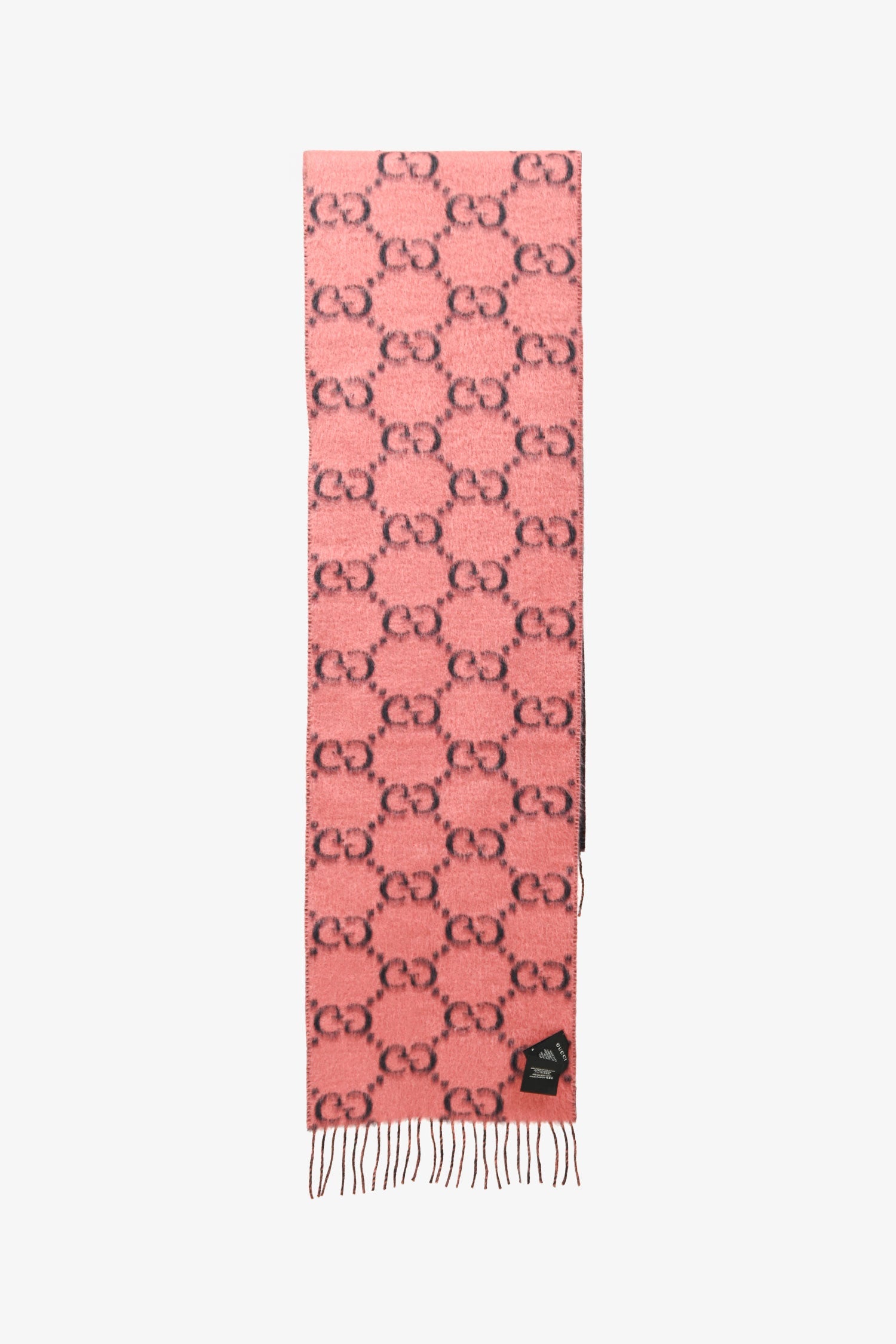 Gucci Pink/Purple Monogram Alpaca/Wool Scarf. Short fringe trim at both ends. Tonal stitching.