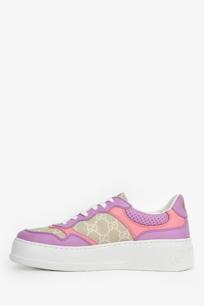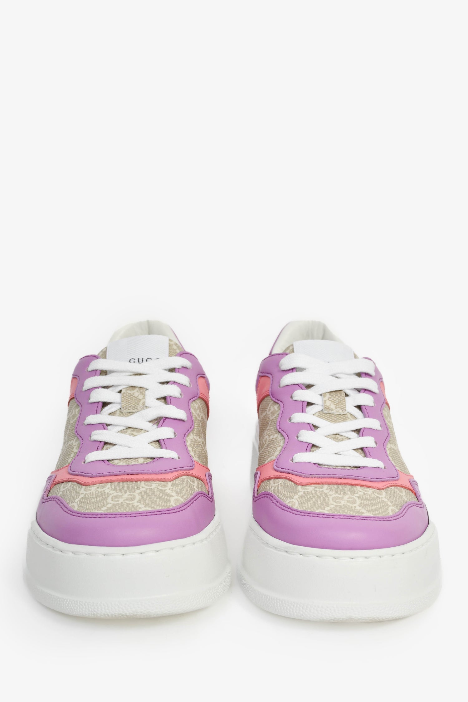 Gucci Purple/Pink GG Canvas Sneakers. Round toe. Lace-up closure.