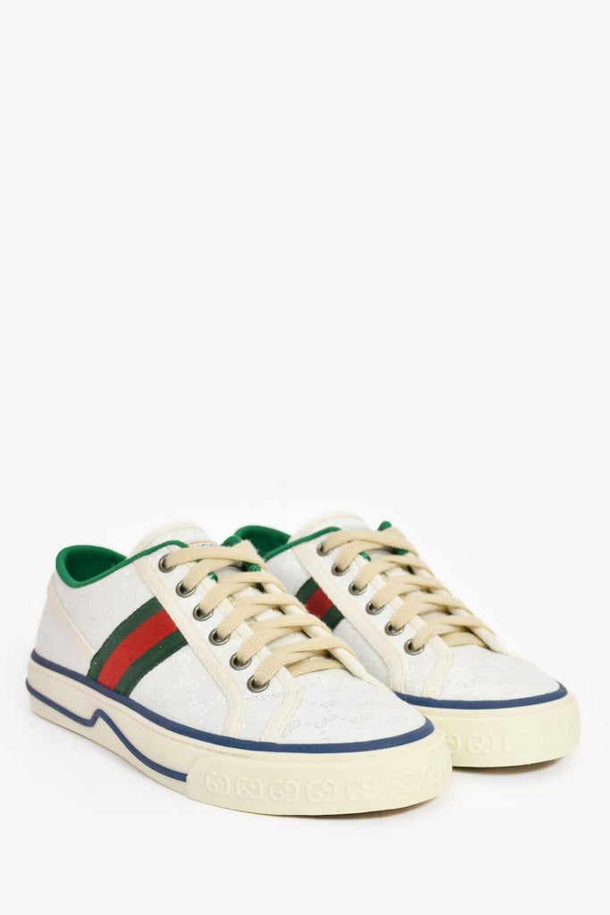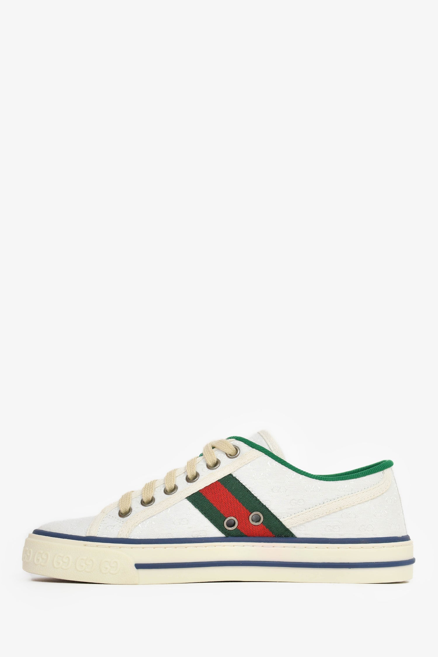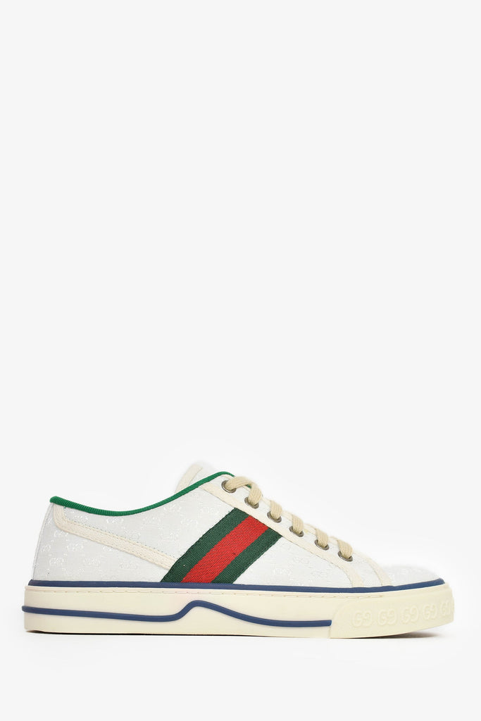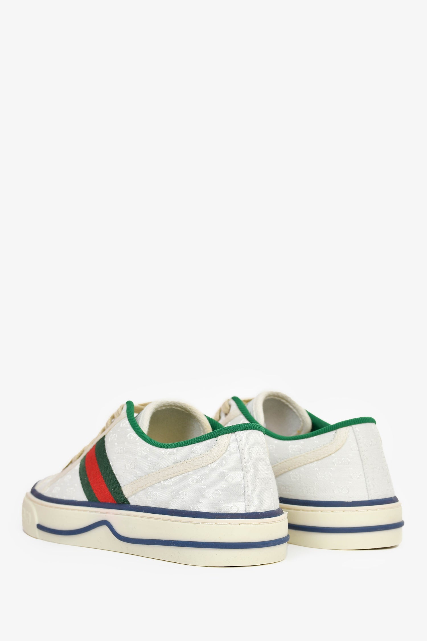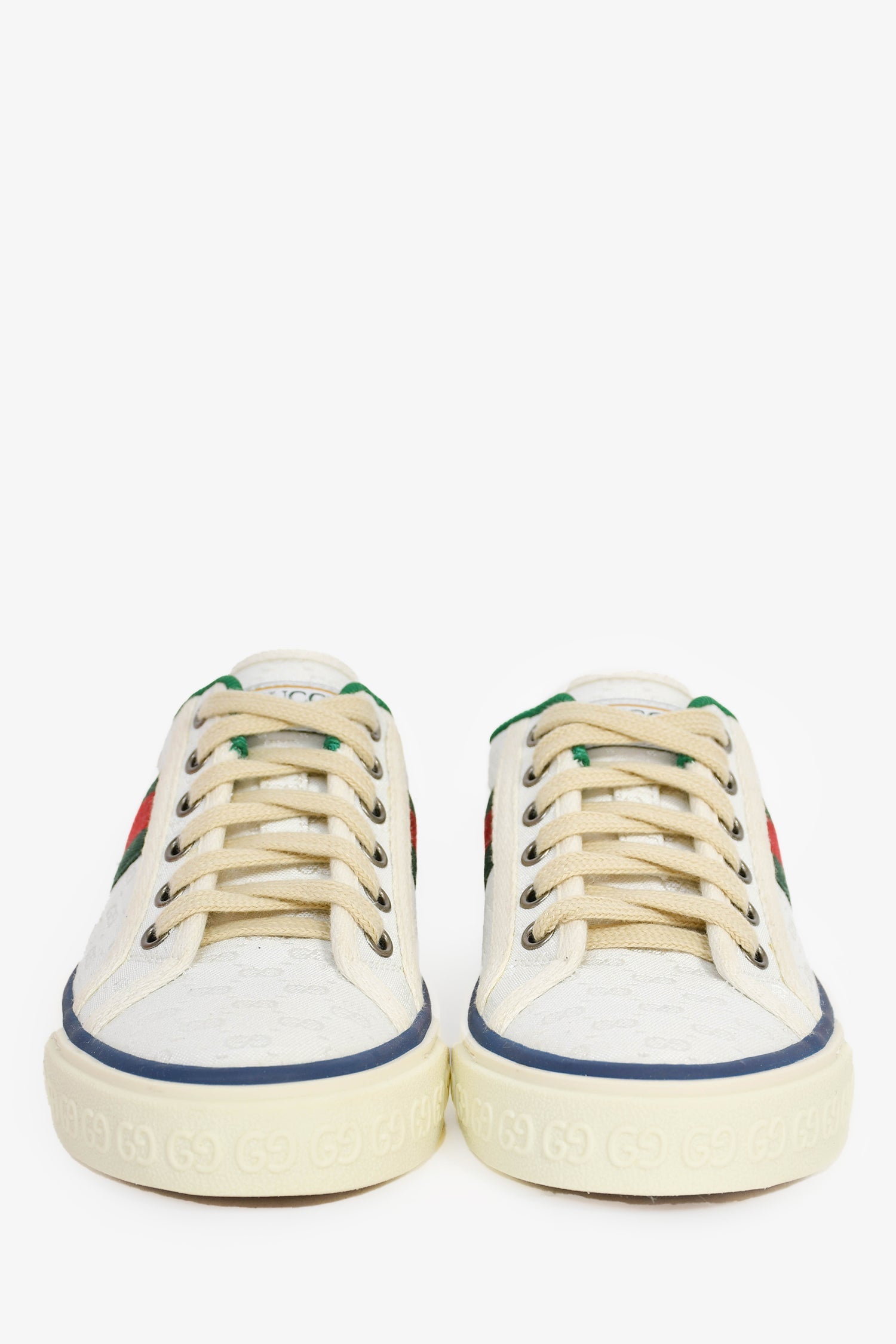 Gucci White GG 'Tennis 1977' Sneakers. Round toe. Webbed strips. Terry cloth interior. Rubber soles. Tonal stitching.