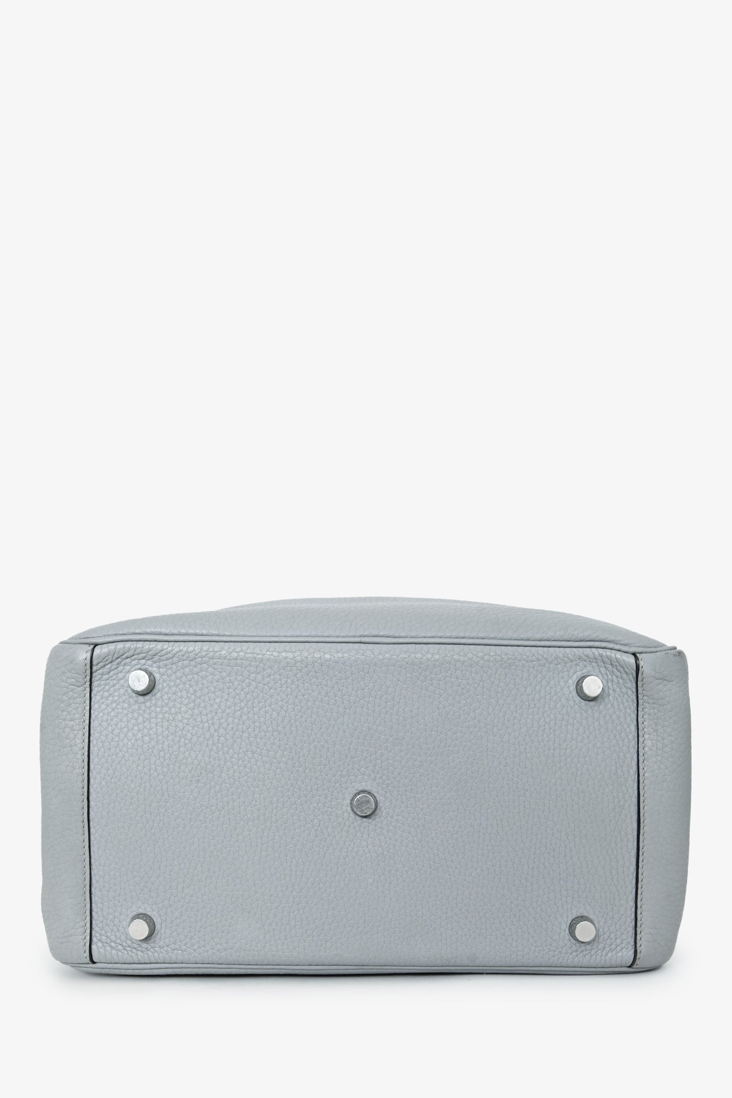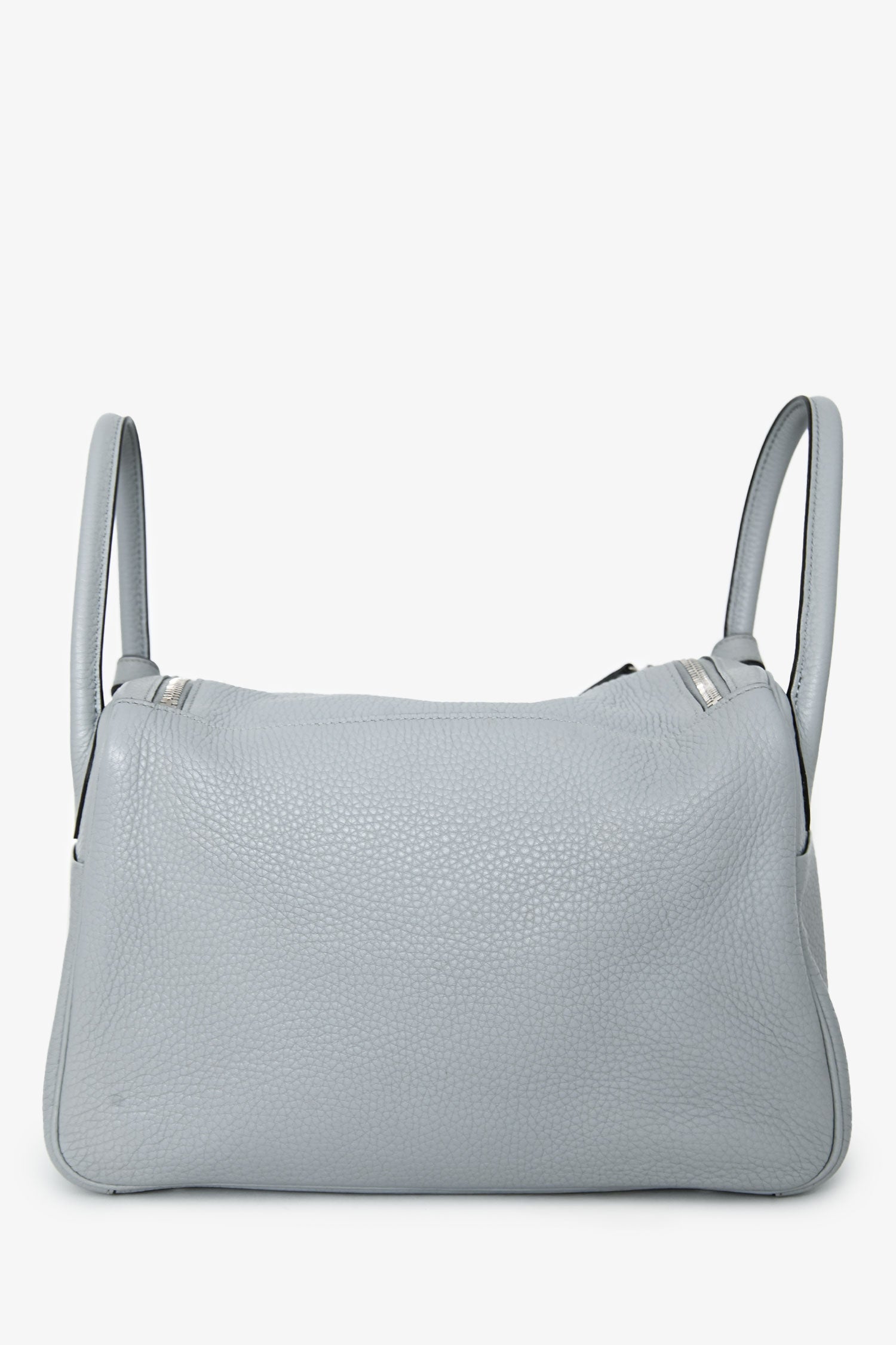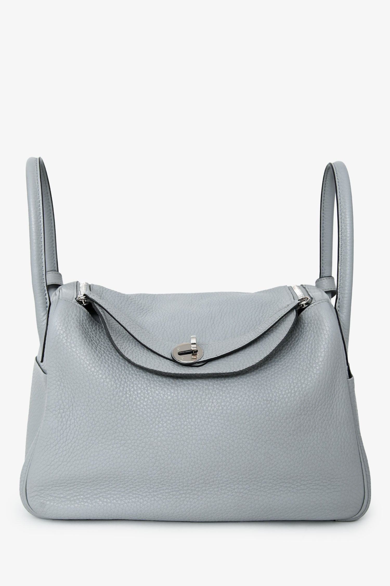 Hermès 2015 Light Grey Clemence Leather Lindy 30. Fold-over flap with a turn-lock closure and 2 straps. Dual rolled top handles. Leather interior with 2 slip pockets. Palladium hardware. Tonal stitching.