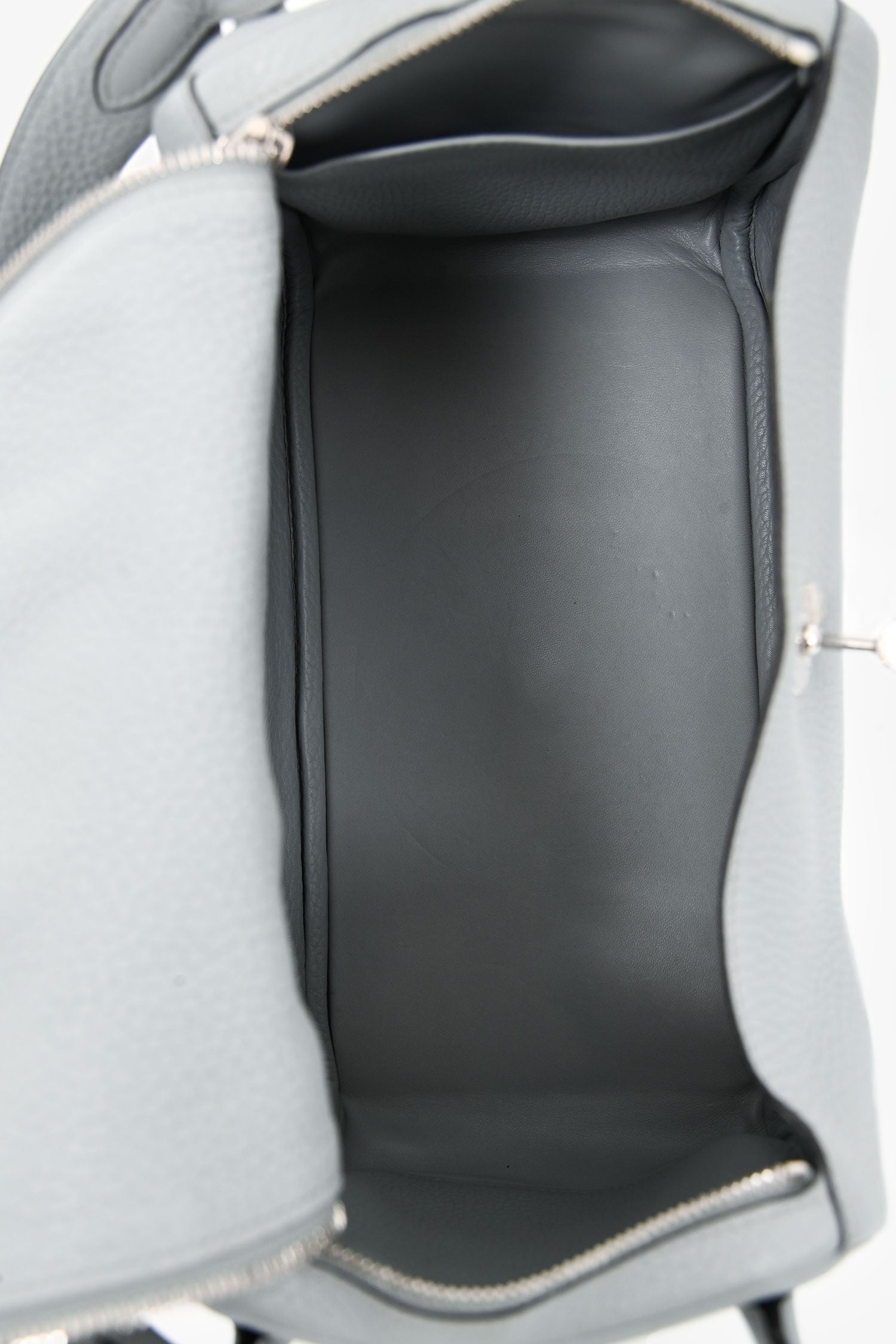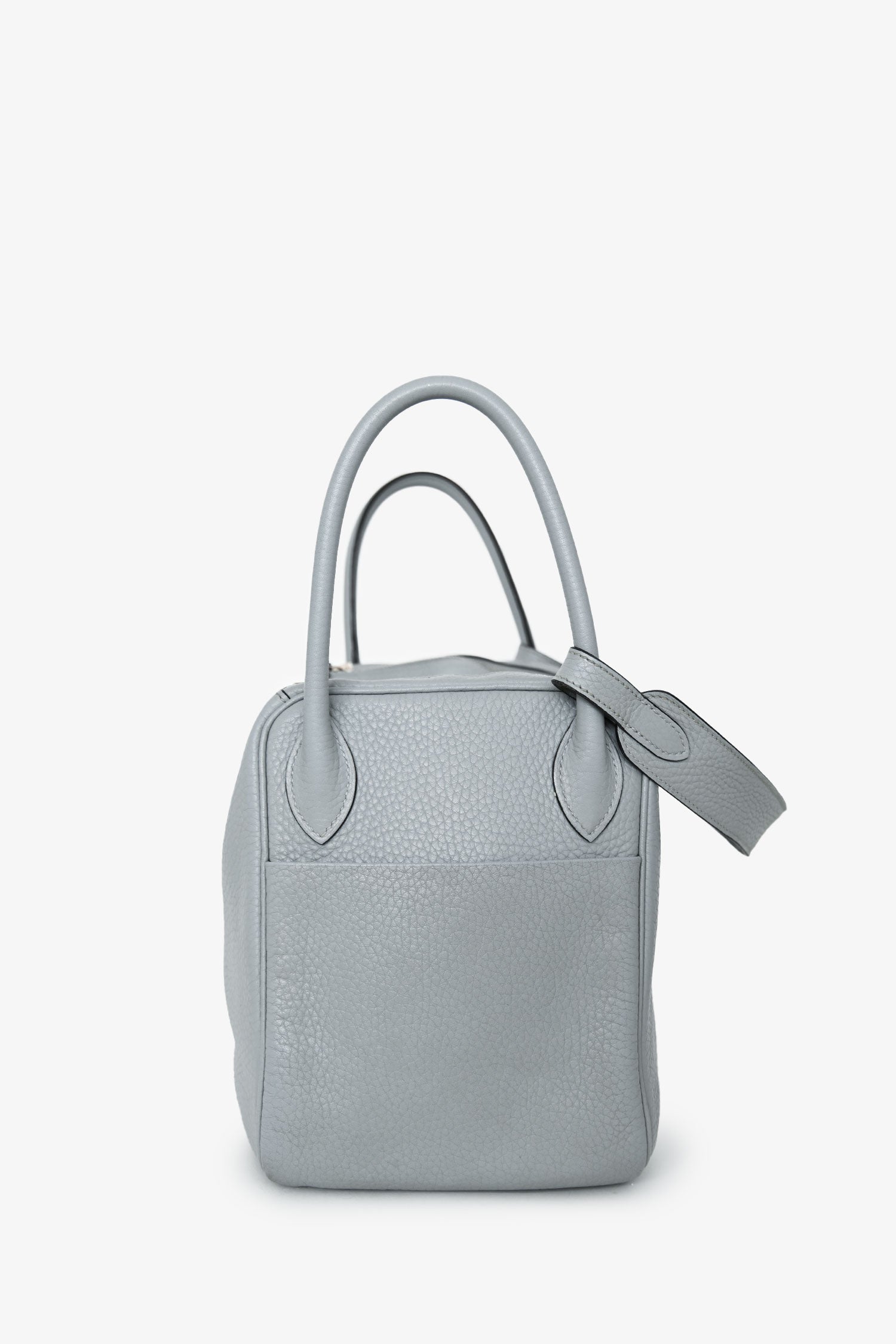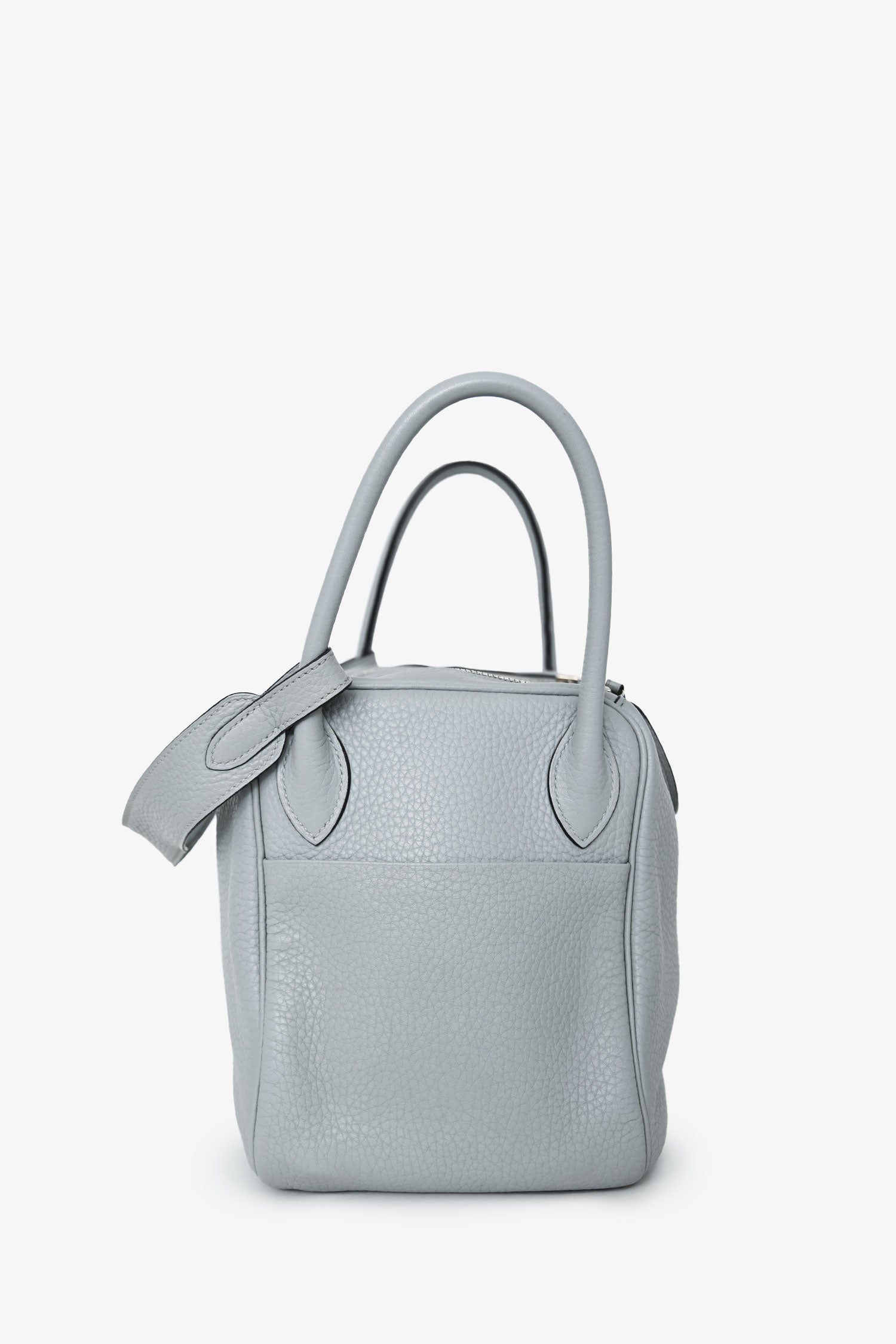 Hermès 2015 Light Grey Clemence Leather Lindy 30. Fold-over flap with a turn-lock closure and 2 straps. Dual rolled top handles. Leather interior with 2 slip pockets. Palladium hardware. Tonal stitching.