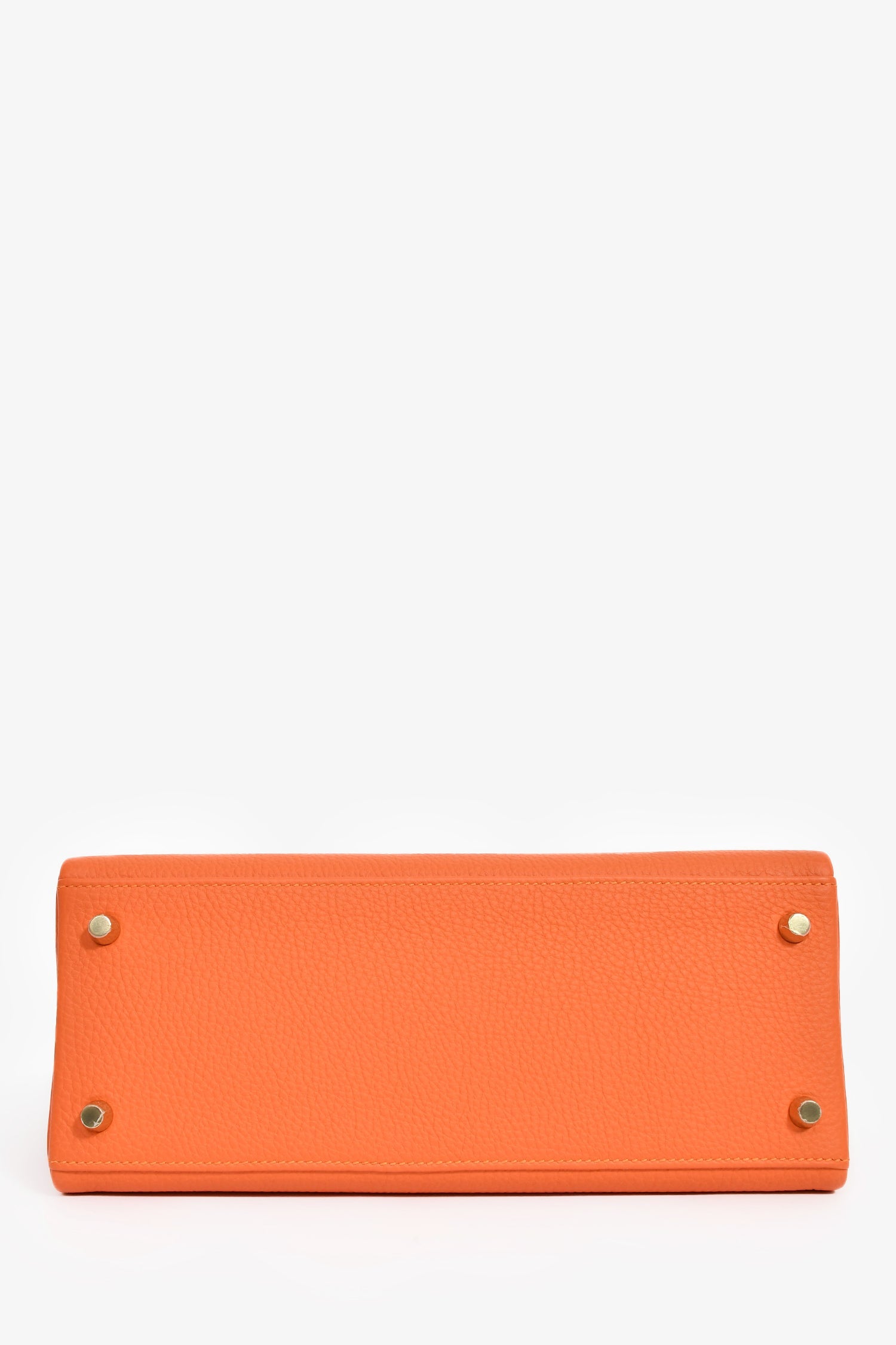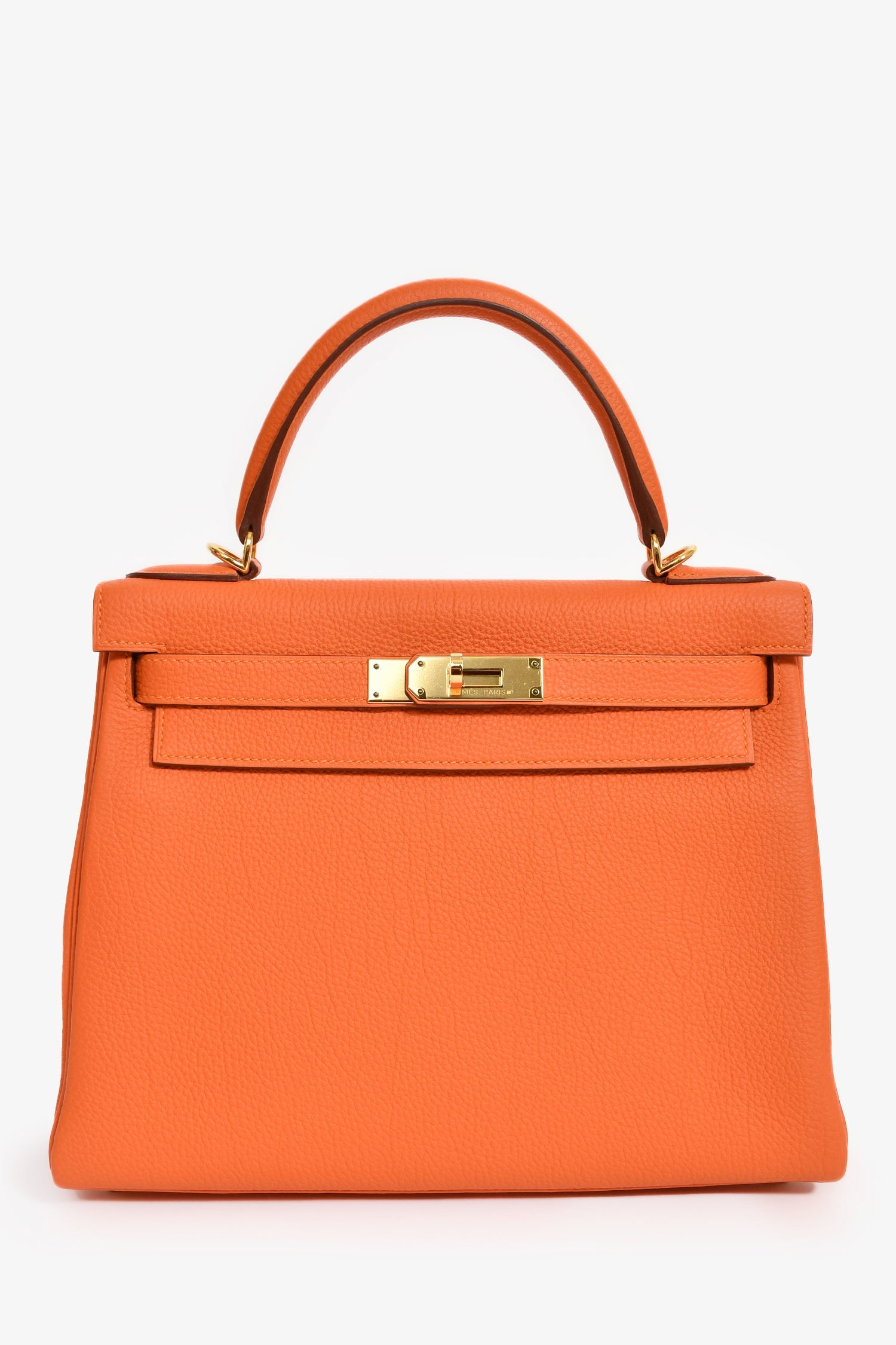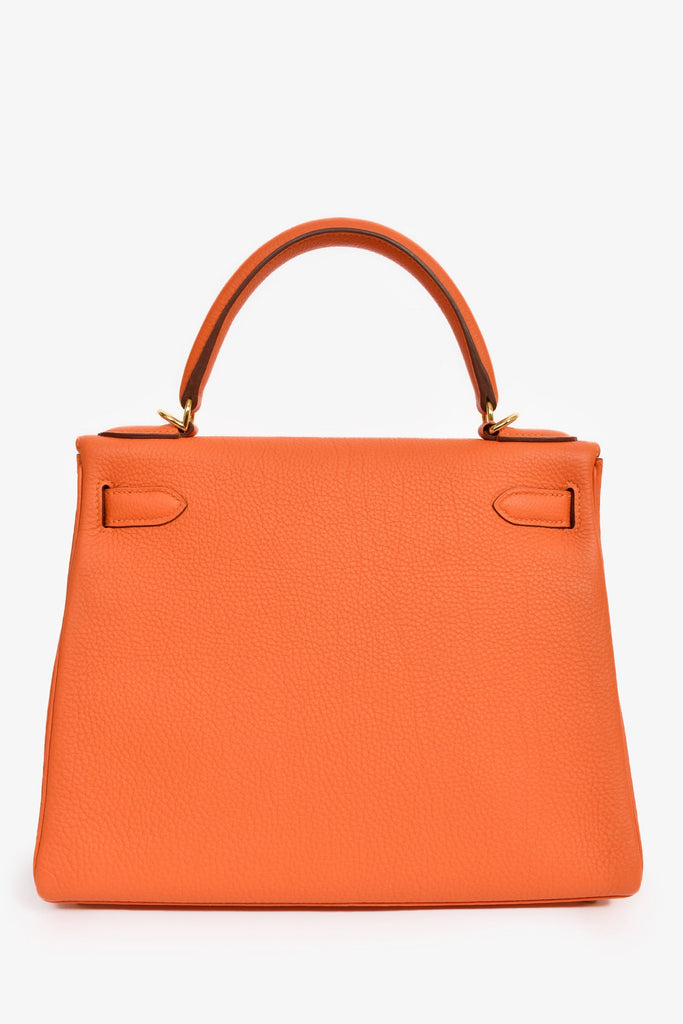 Hermès 2015 Orange Togo Leather Kelly 28. Fold-over flap with a turn-lock closure and dual pull-through straps. Single top handle and attachable strap. 1 zip and 2 slip pockets. Inclusions: Clochette, lock, and key. Gold-tone hardware. Tonal stitching.